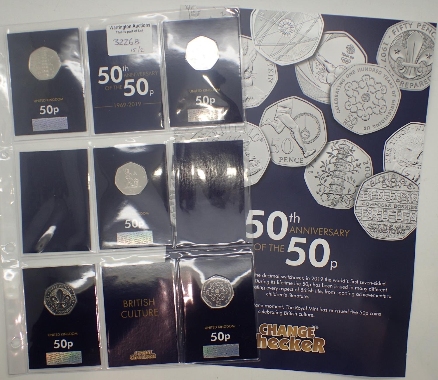 Change checker set of five 50p collectable coins. P&P Group 2 (£18+VAT for the first lot and £3+VAT for subsequent lots)