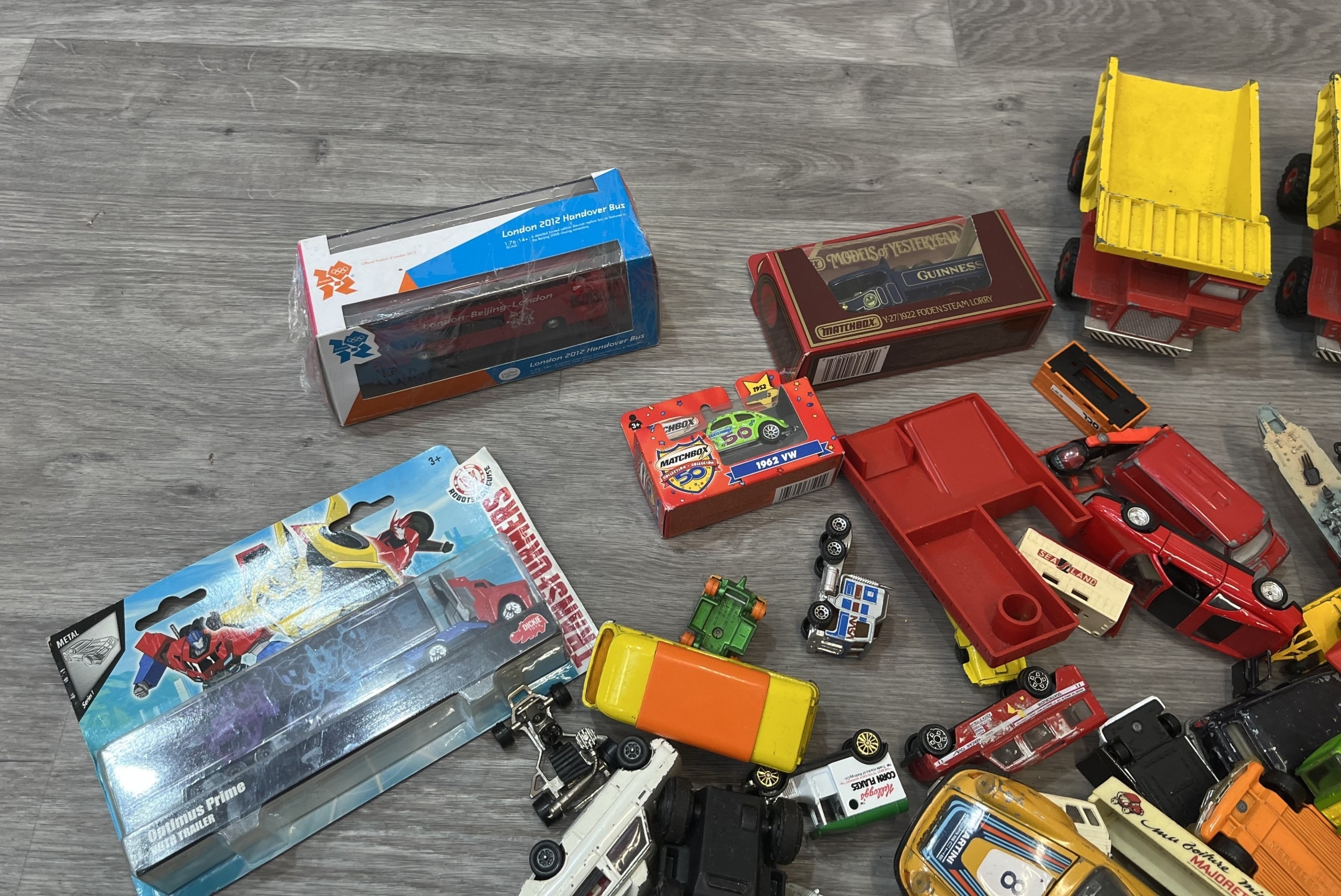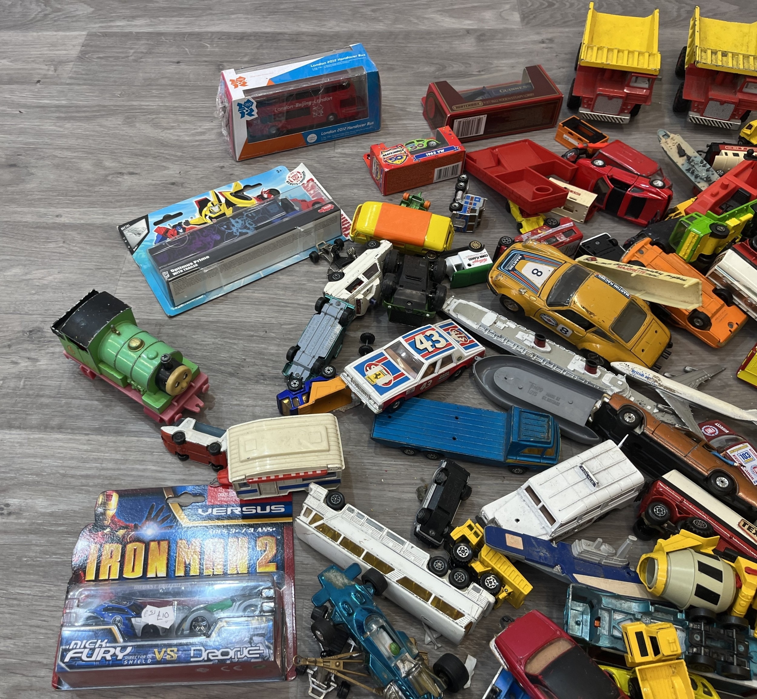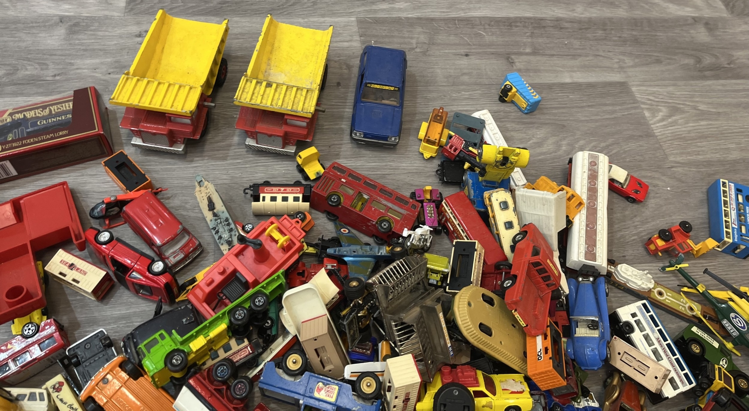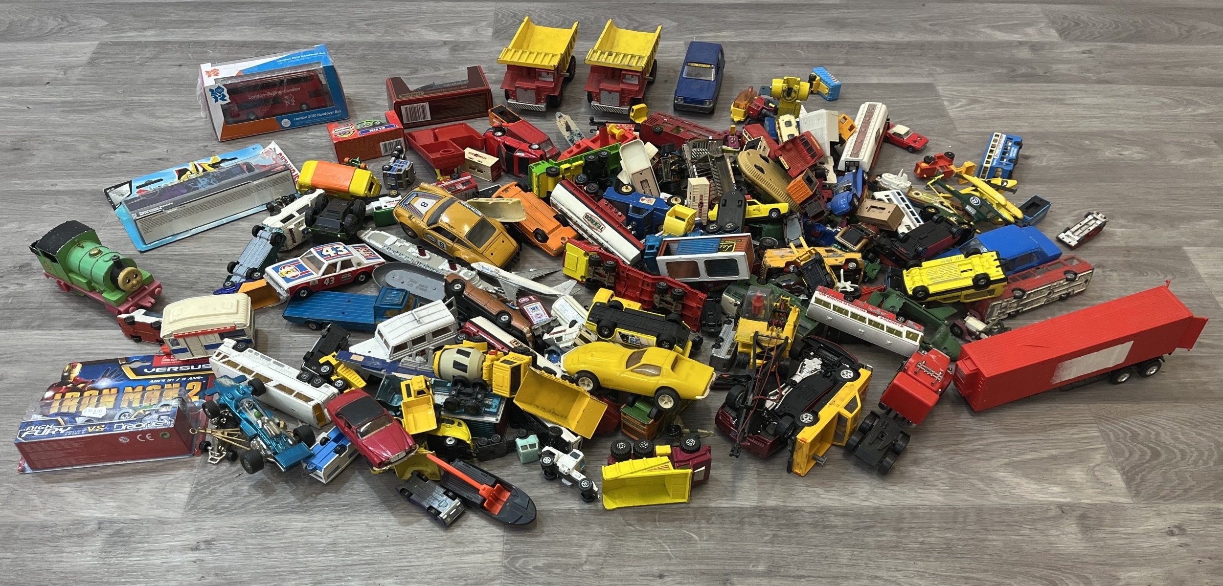 Two boxes containing model vehicles to include Dinky Toys diecast Bedford van, Maisto Iron Man 2 diecast collection, Nick Fury VS Drone, Matchbox Models of Yesterday W-27/1922 Foden Steam lorry etc.
