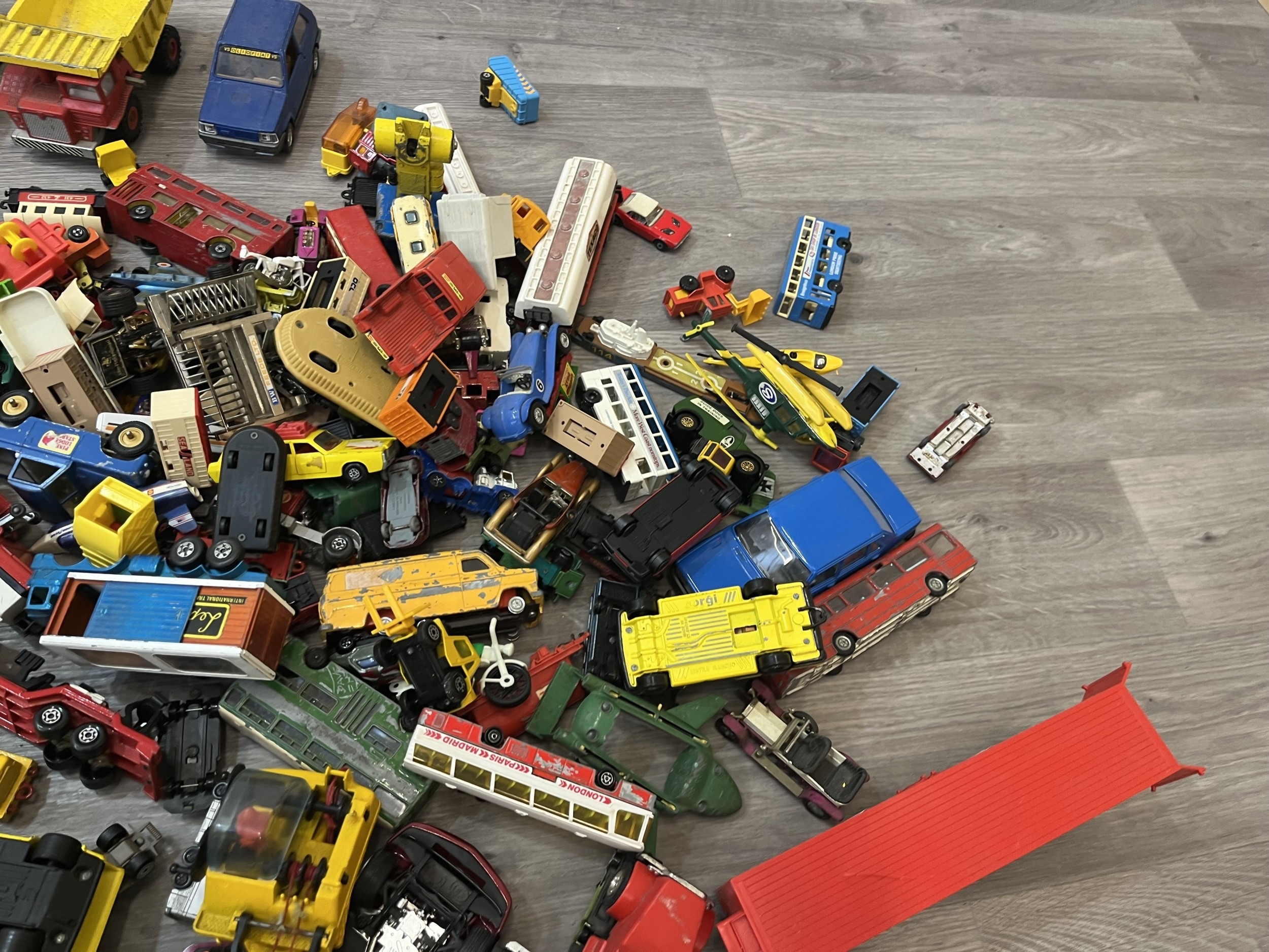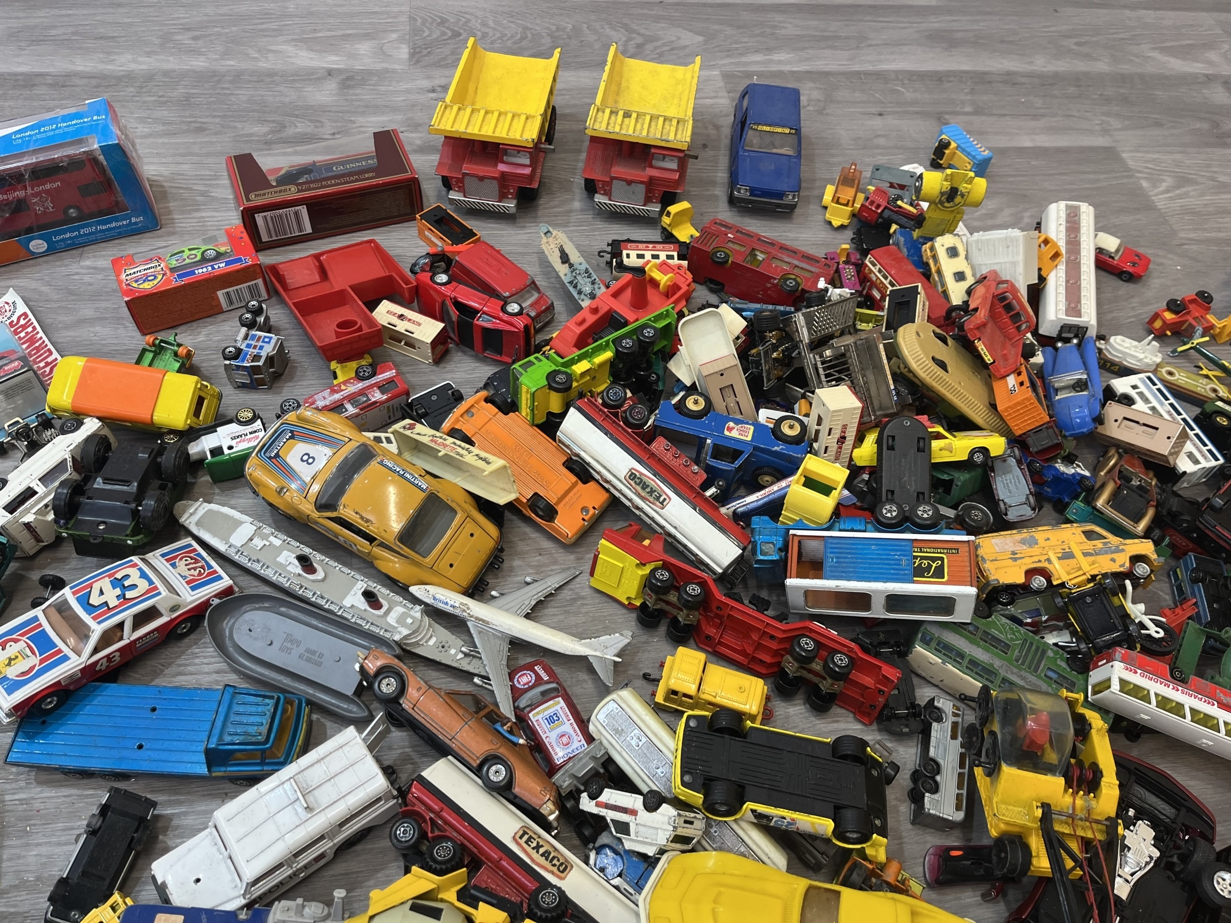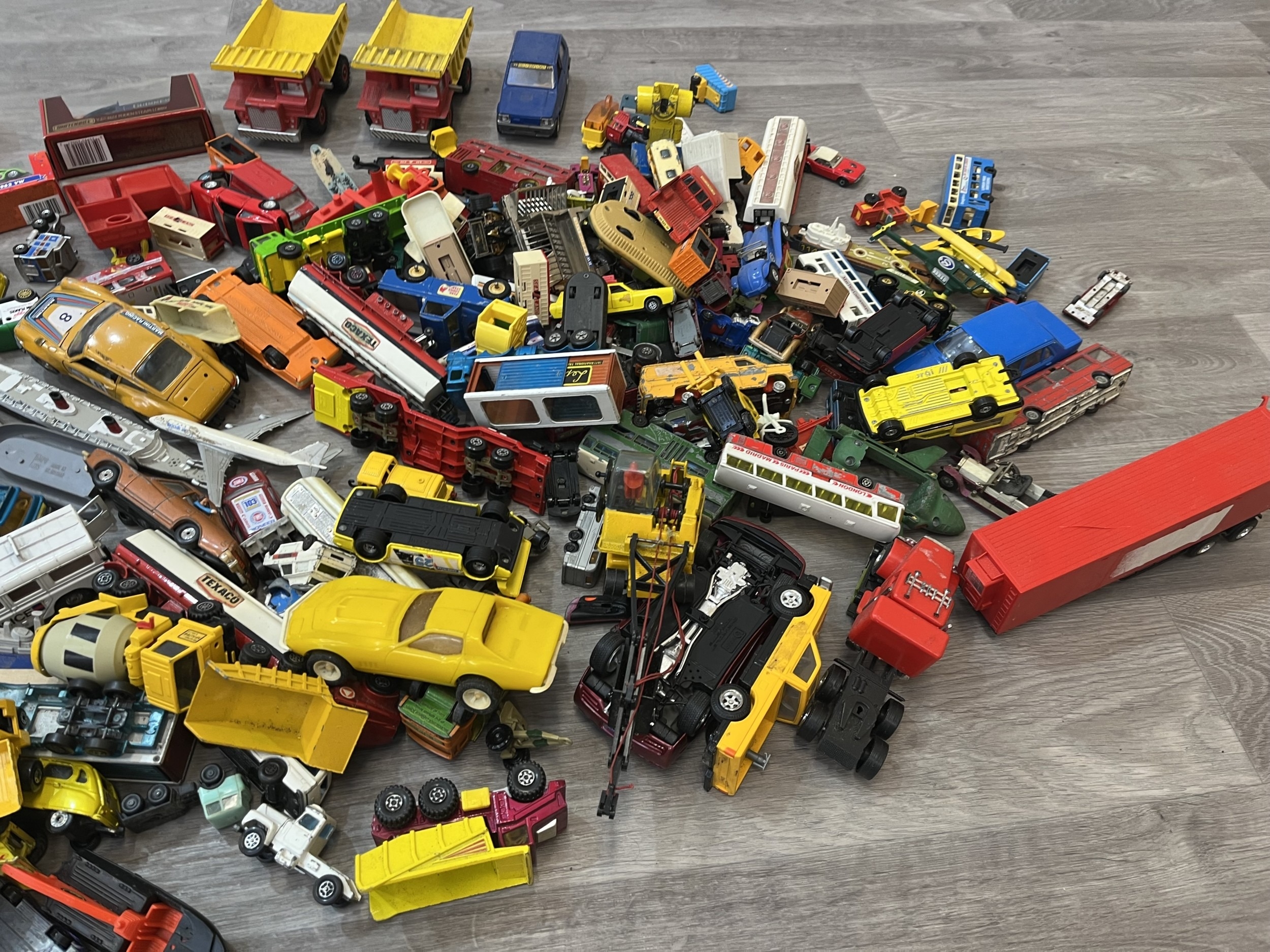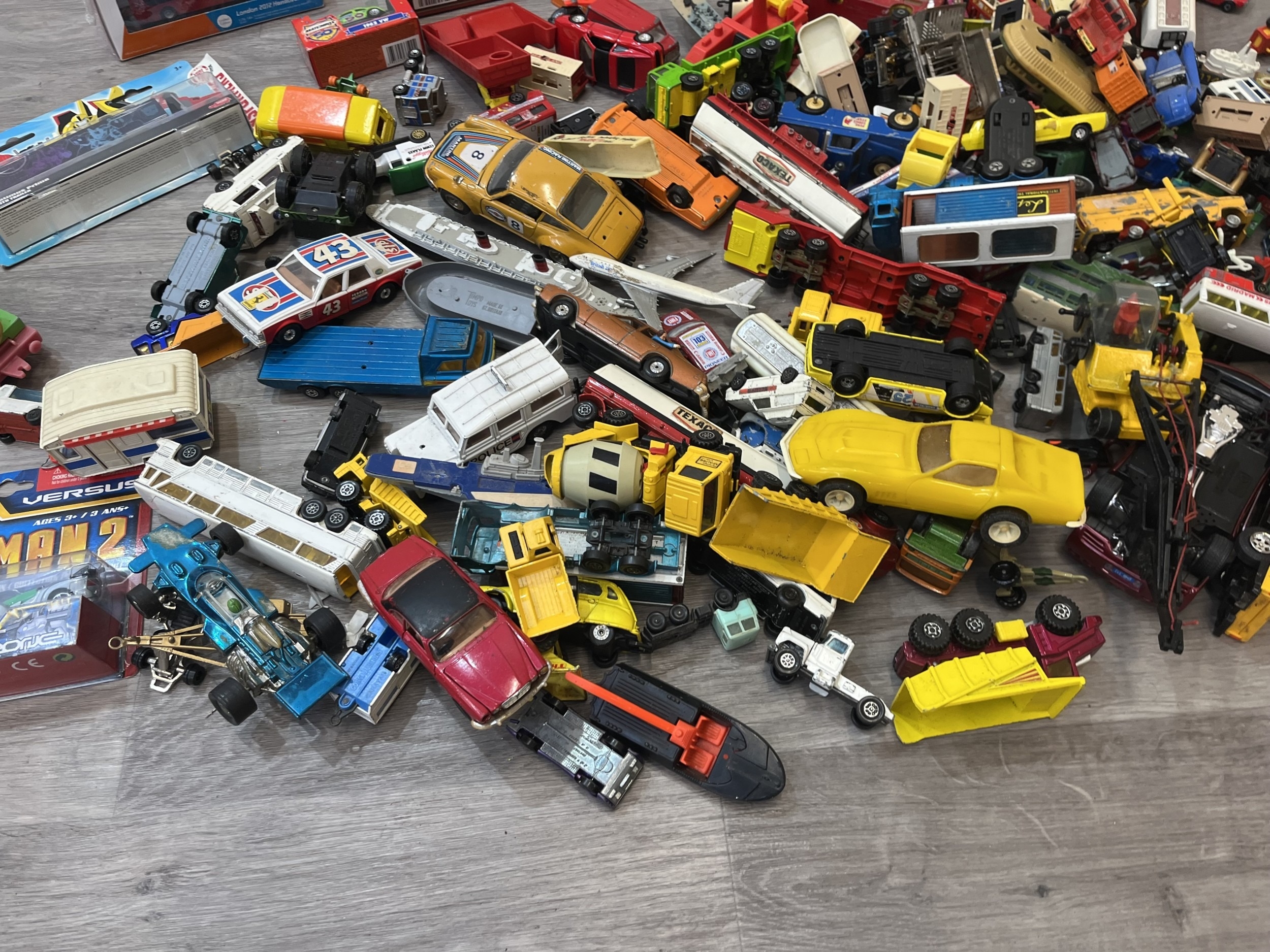 Two boxes containing model vehicles to include Dinky Toys diecast Bedford van, Maisto Iron Man 2 diecast collection, Nick Fury VS Drone, Matchbox Models of Yesterday W-27/1922 Foden Steam lorry etc.