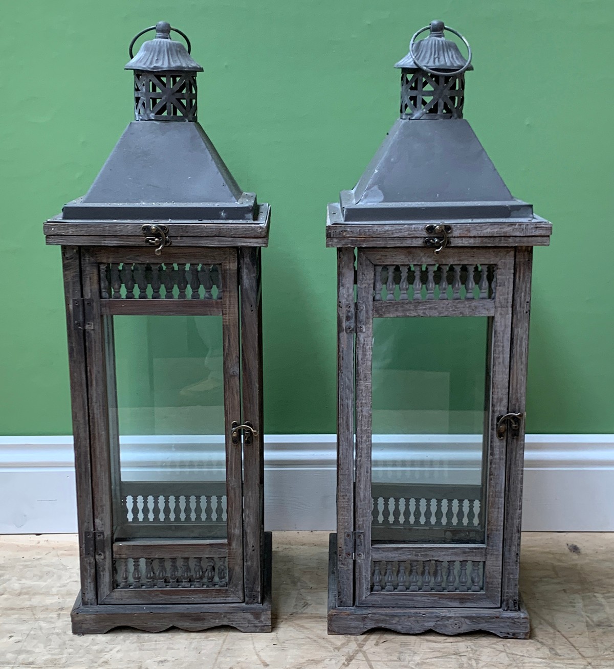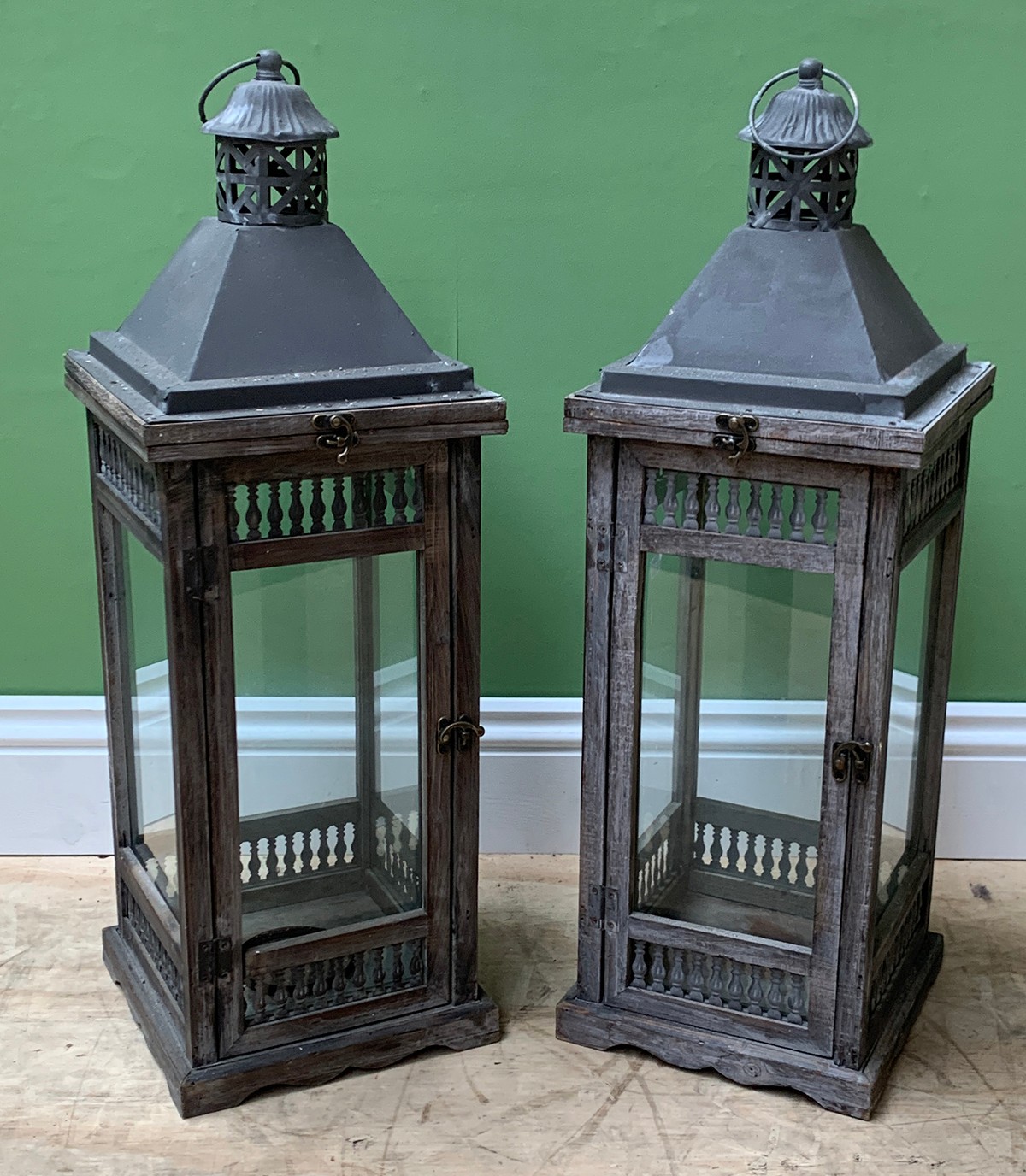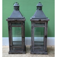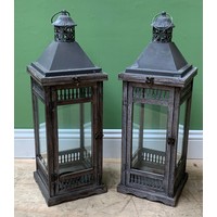 A pair of wood, tin and glazed lanterns, the doors with pierced baluster form motif, 71cmH