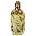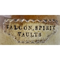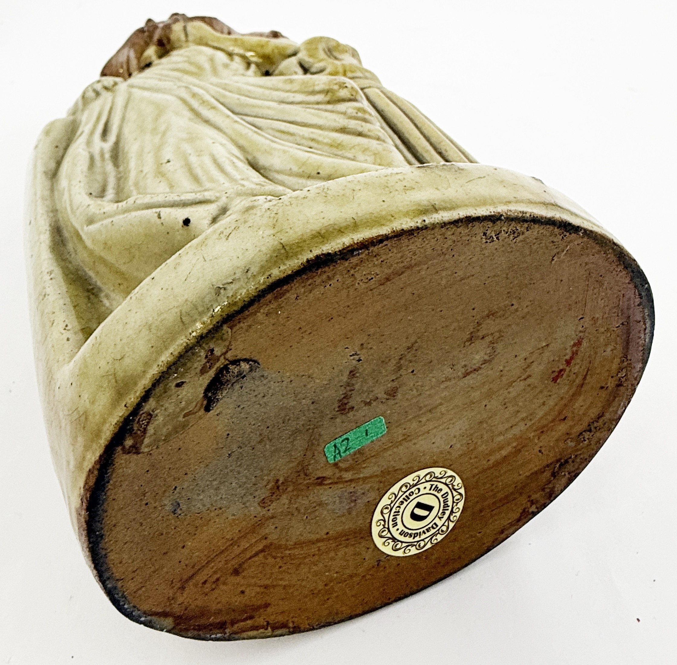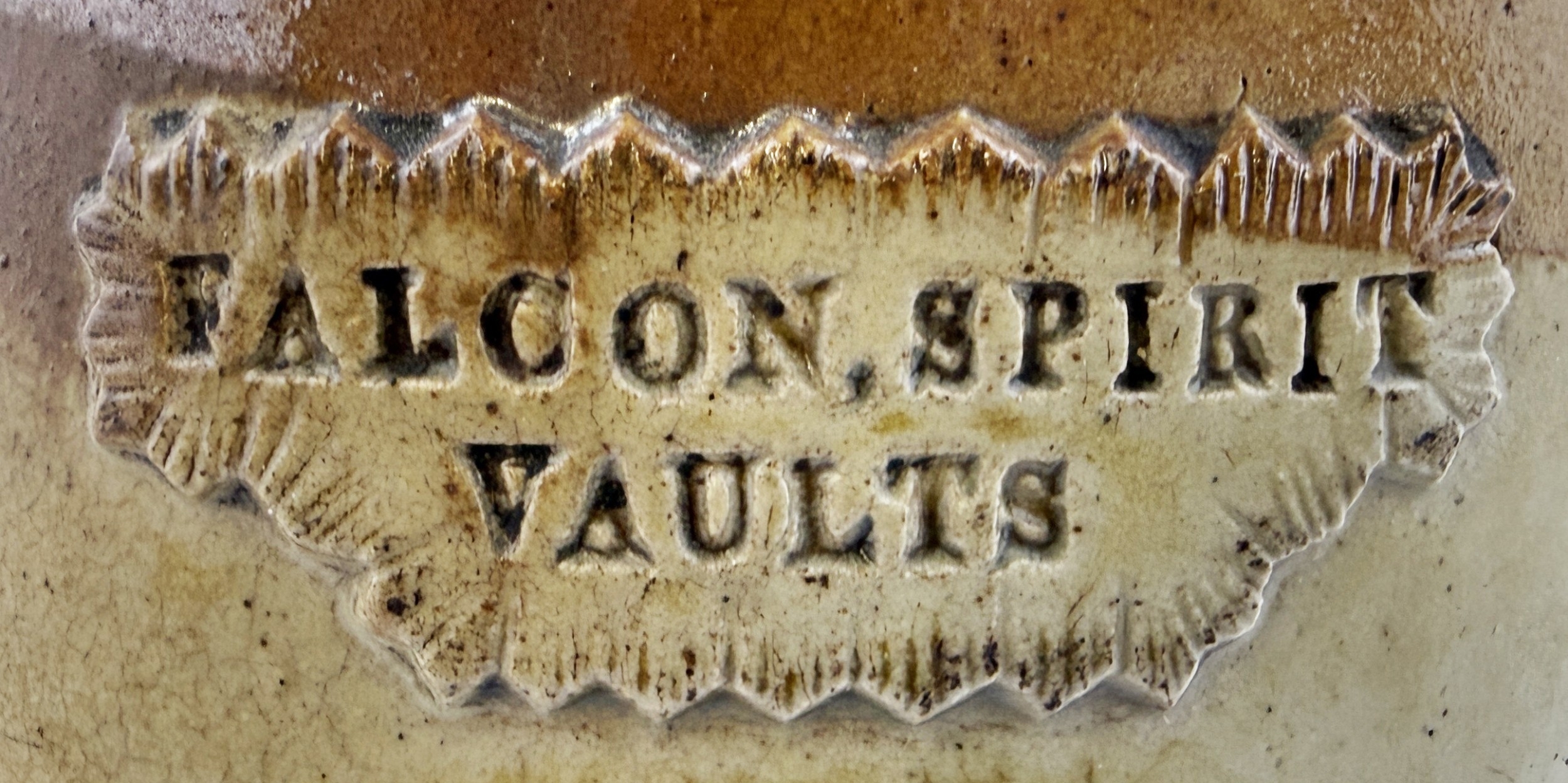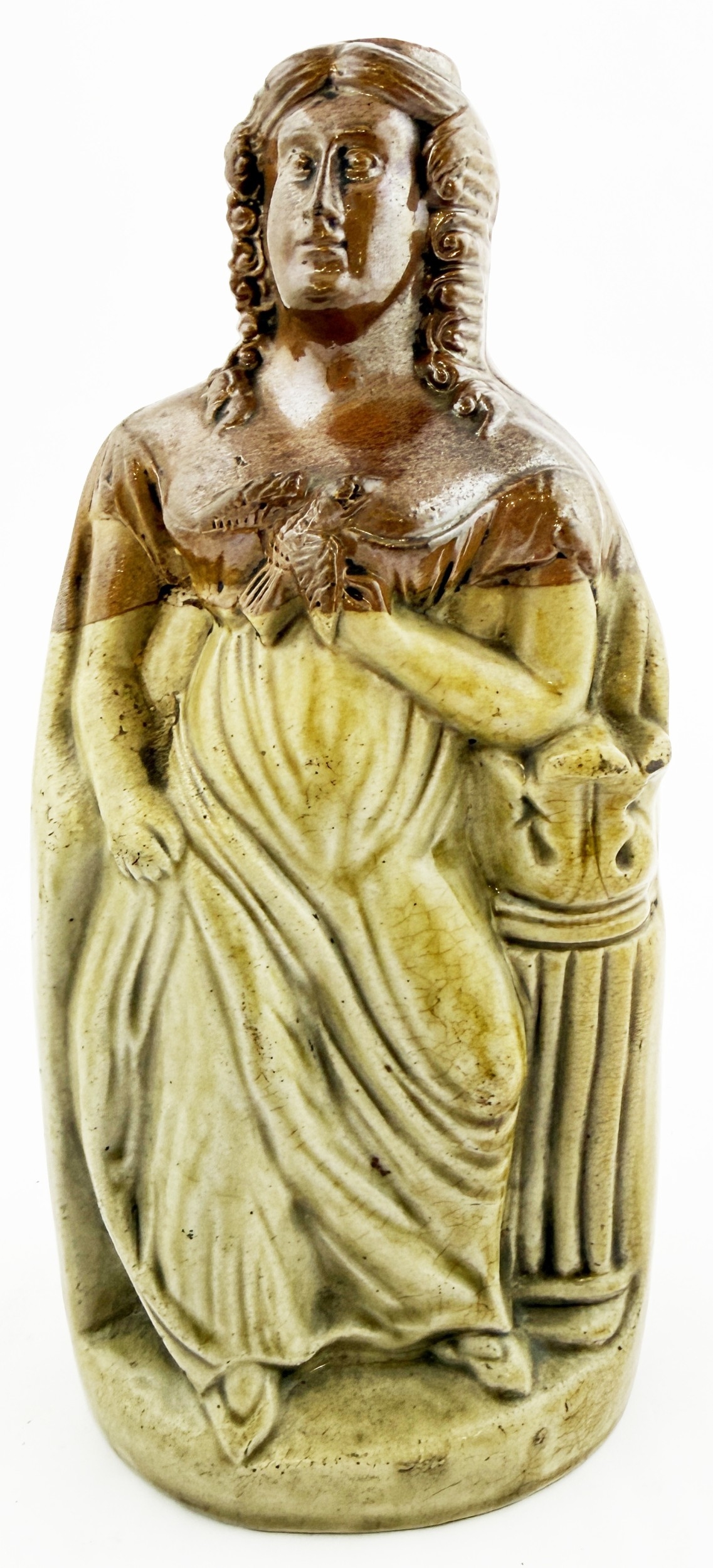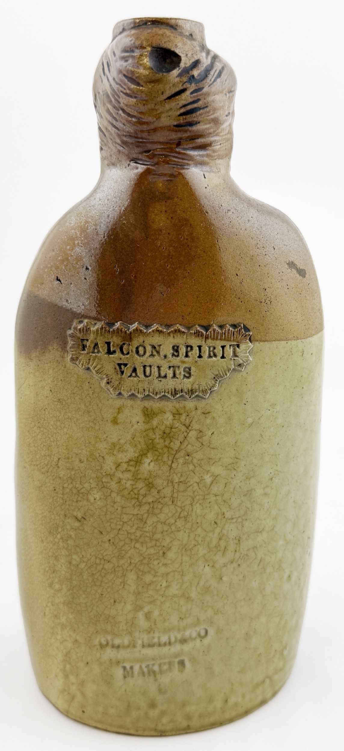 FALCON SPIRIT VAULTS LADY WITH BIRD REFORM FLASK. RF p27. 9.1ins tall. Very rare reform flask probably modelled as young Queen Victoria, collectors call it Lady with bird. Rear slab seal FALCON, SPIRIT/ VAULTS, impressed Oldfield & Co p.m. below. Dudley Davidson collection. Chip or kiln pull to rear of head, otherwise good