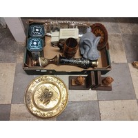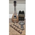 A mandolin, small painted table top box, French crucifix, etc.