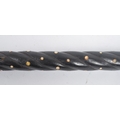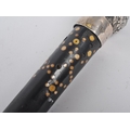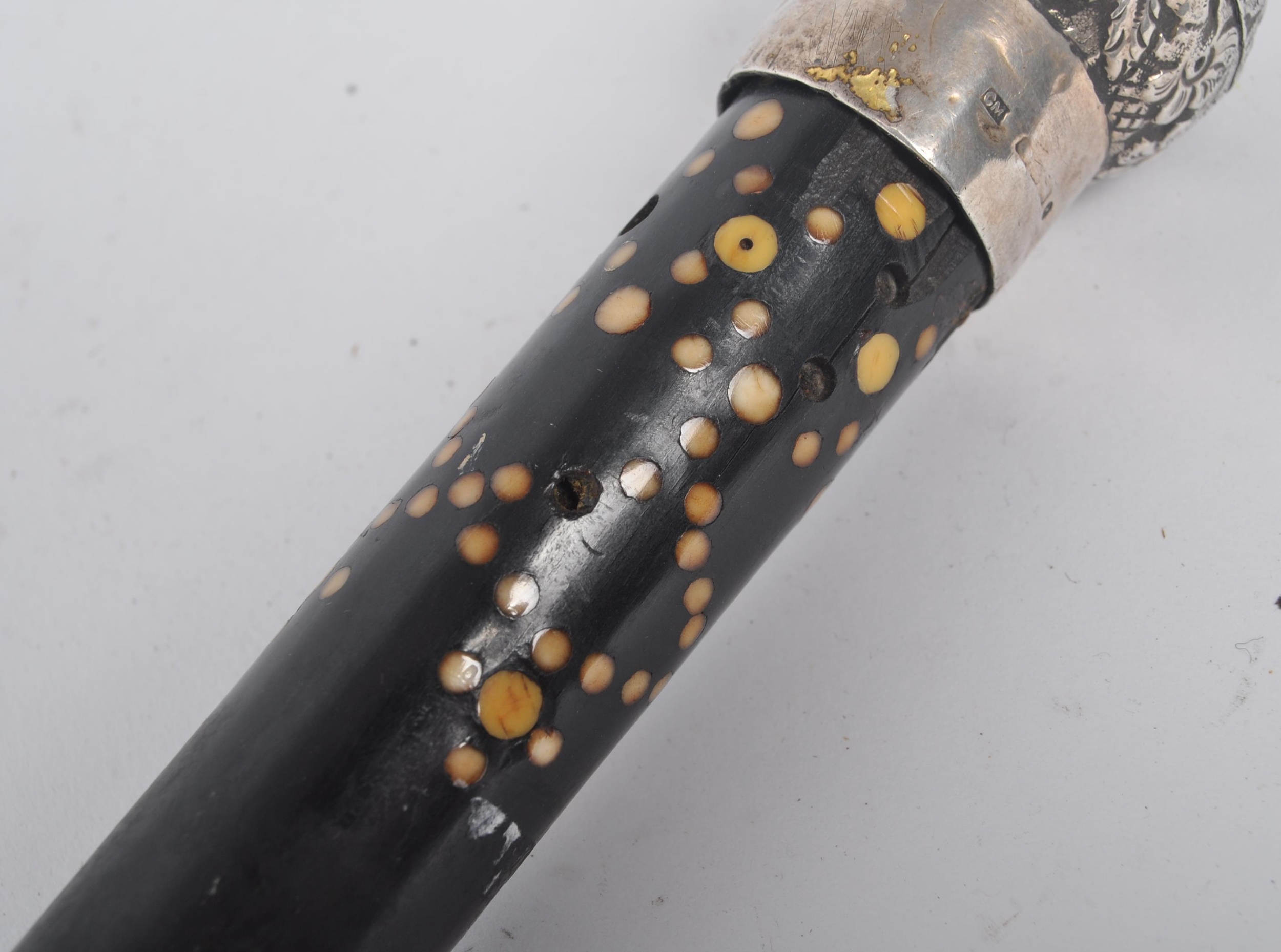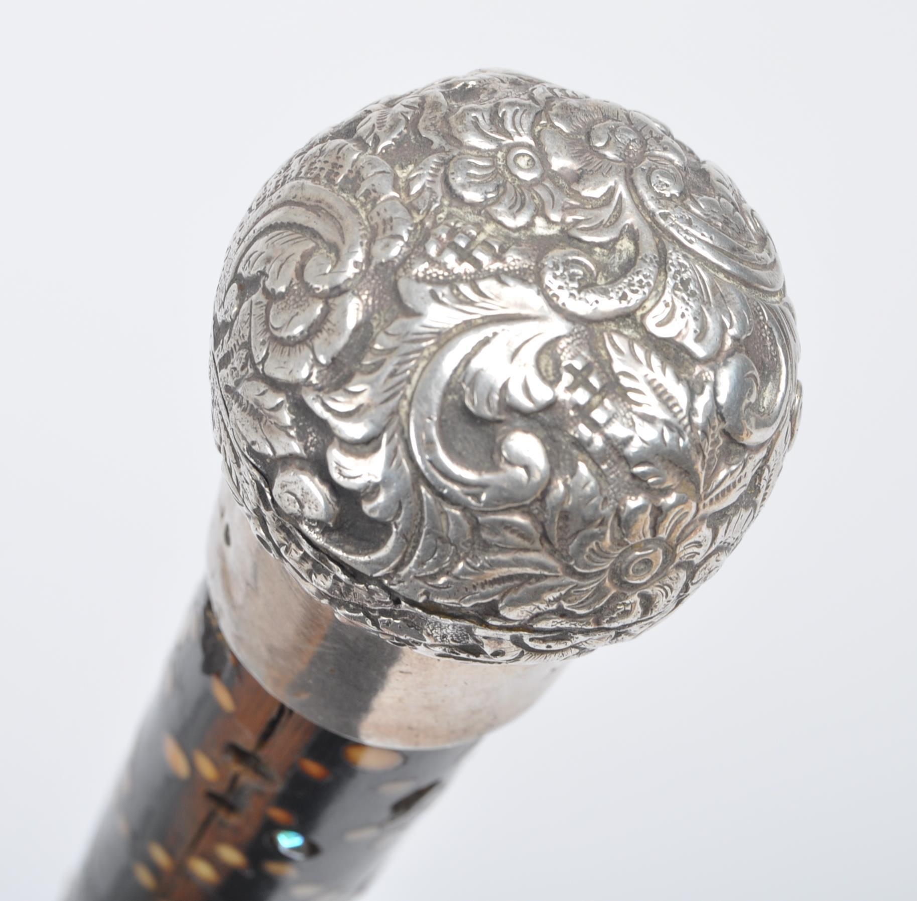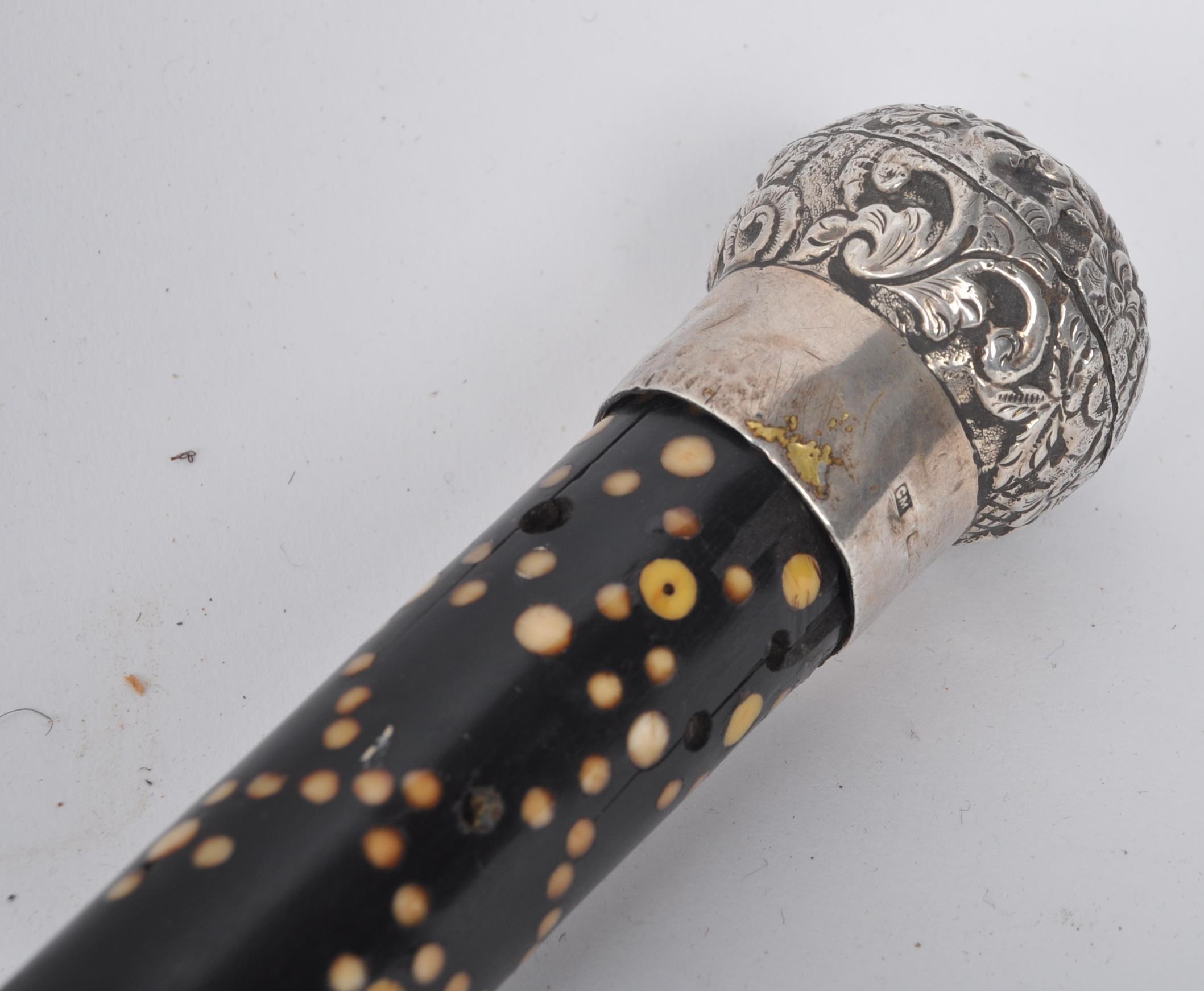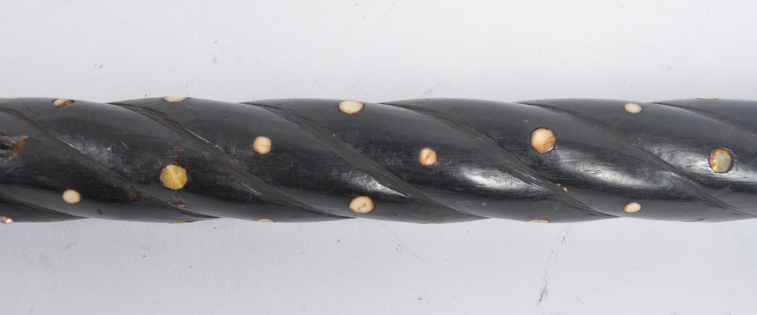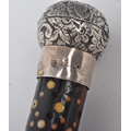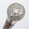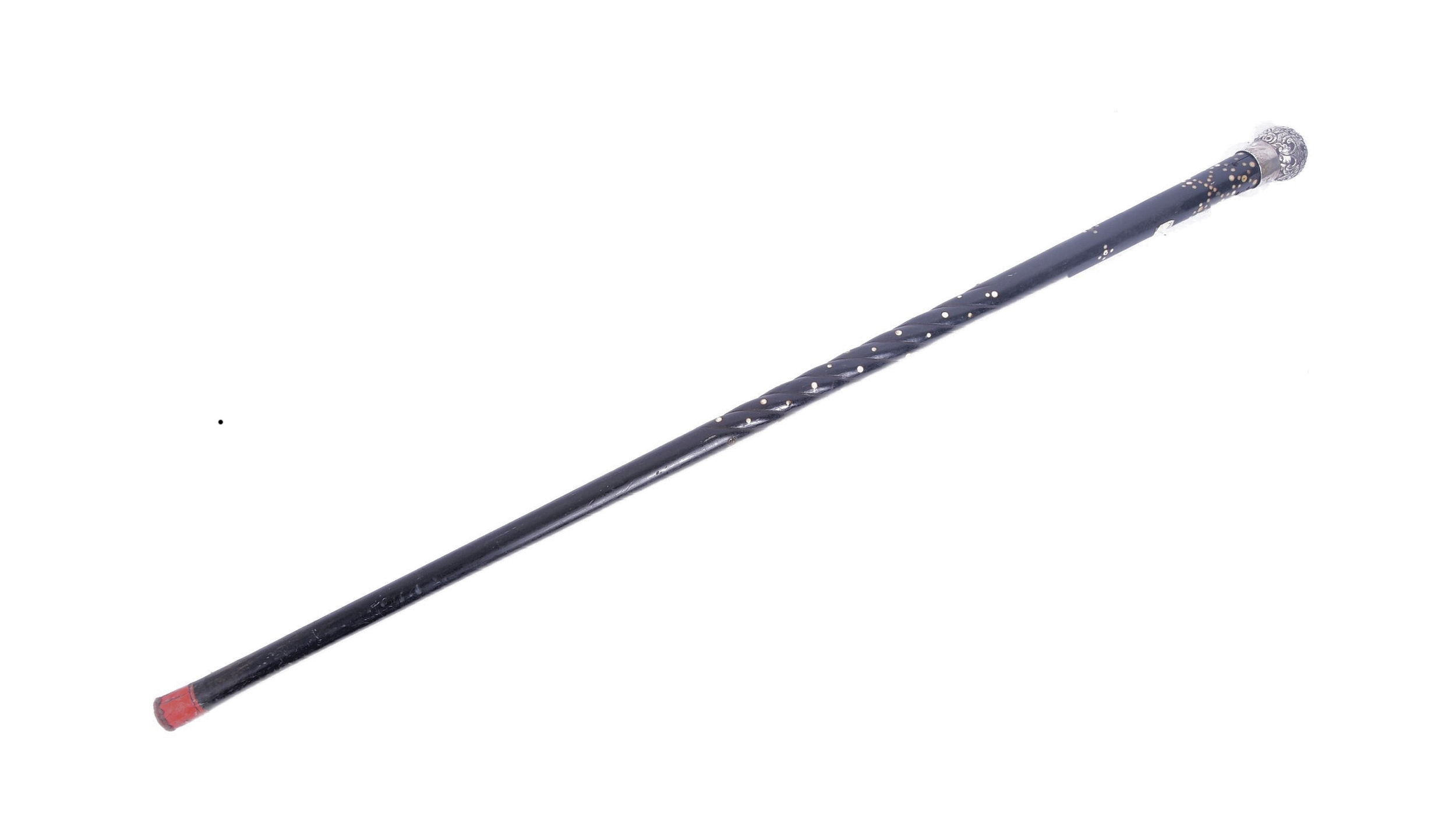 A High Victorian walking stick / cane with silver top, floral repousse decorated, on mahogany stick with spherical bone insert spots (some lacking, some replaced with bedazzle), wooden carved twist halfway. Hallmarks worn, maker's marks CM; 85cm tall.