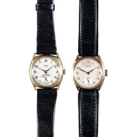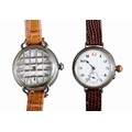 with manual wind movement, white dial, black Roman numerals, dark blue steel hands, subsidiary seconds dial, caseback stamped with military crow's foot, with a steel frame cage watch protector, circa 1930s, case diameter approx. 32mm; together with another nickel plated trench watch (2)