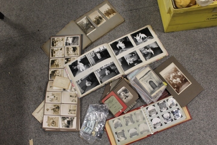 A tray of assorted vintage photographs etc