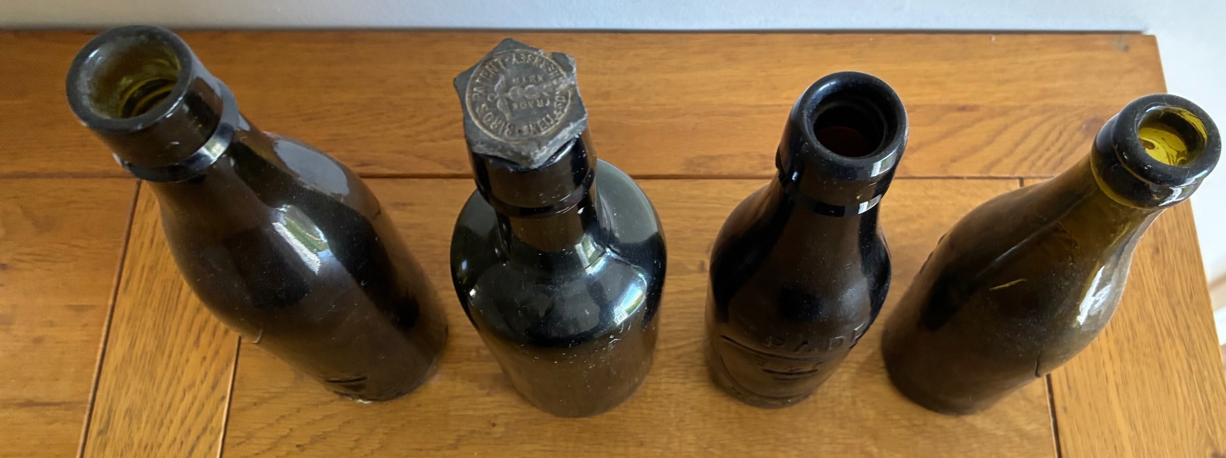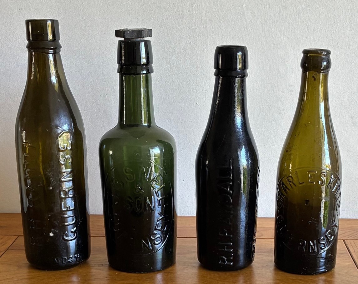 Four coloured glass beer bottles, two R.H.Randall Guernsey, J. & G. Snell & Son Guernsey & Charles H. Kitts Guernsey (4).