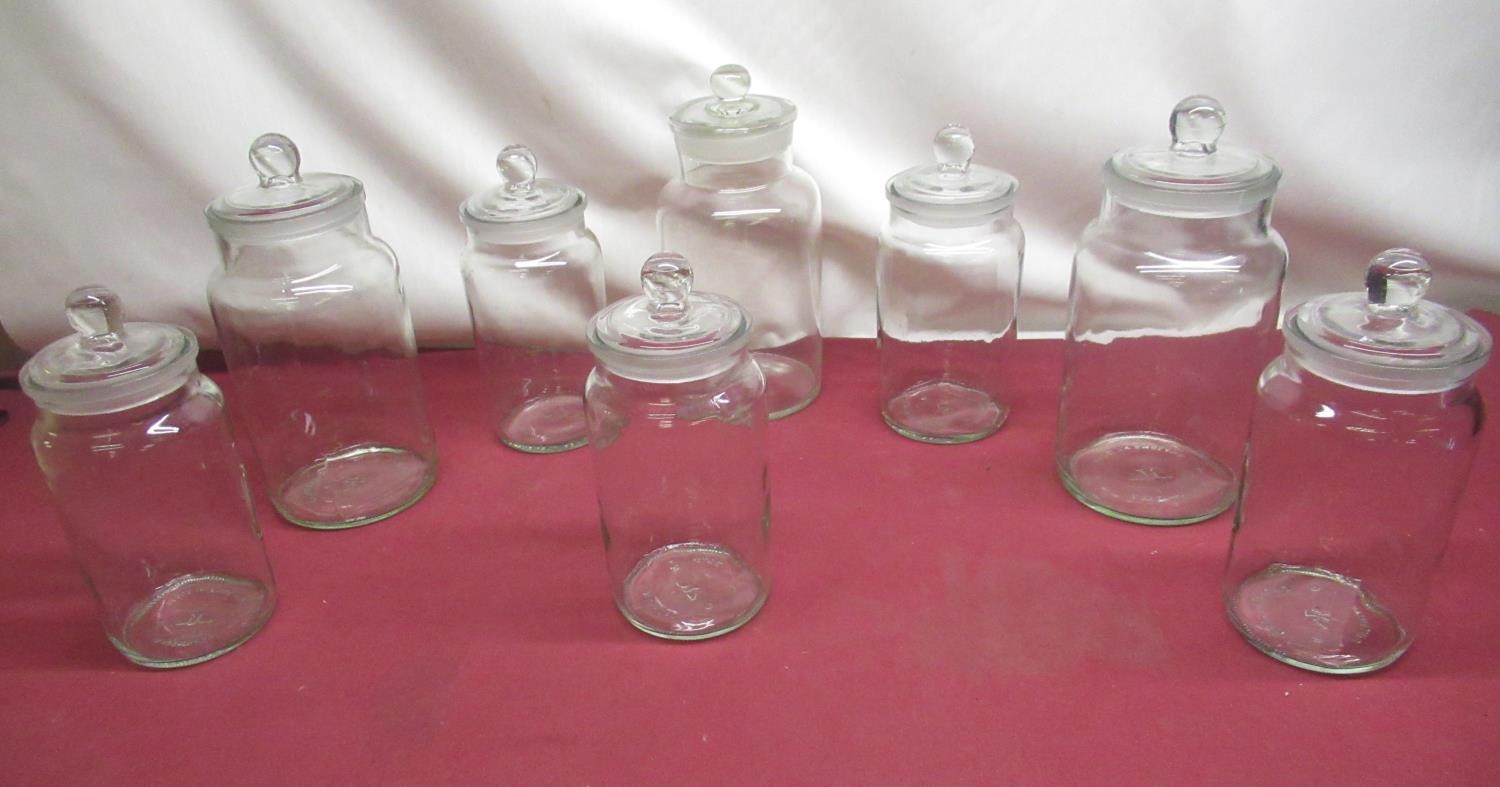 3 large glass storage jars with lids and 5 medium glass storage jars with lids