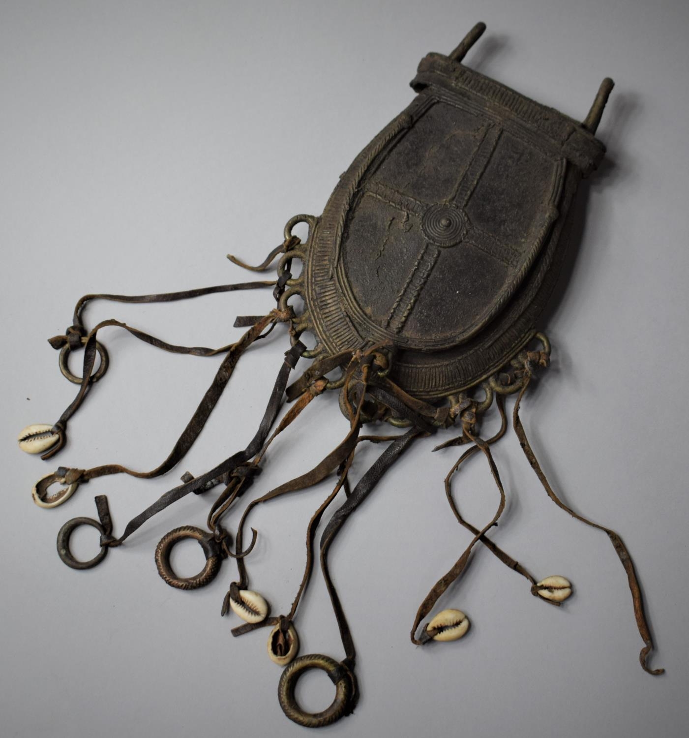 An African Benin Bronze Pouch with Leather Tassels Decorated with Seashells etc, 20cm high