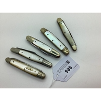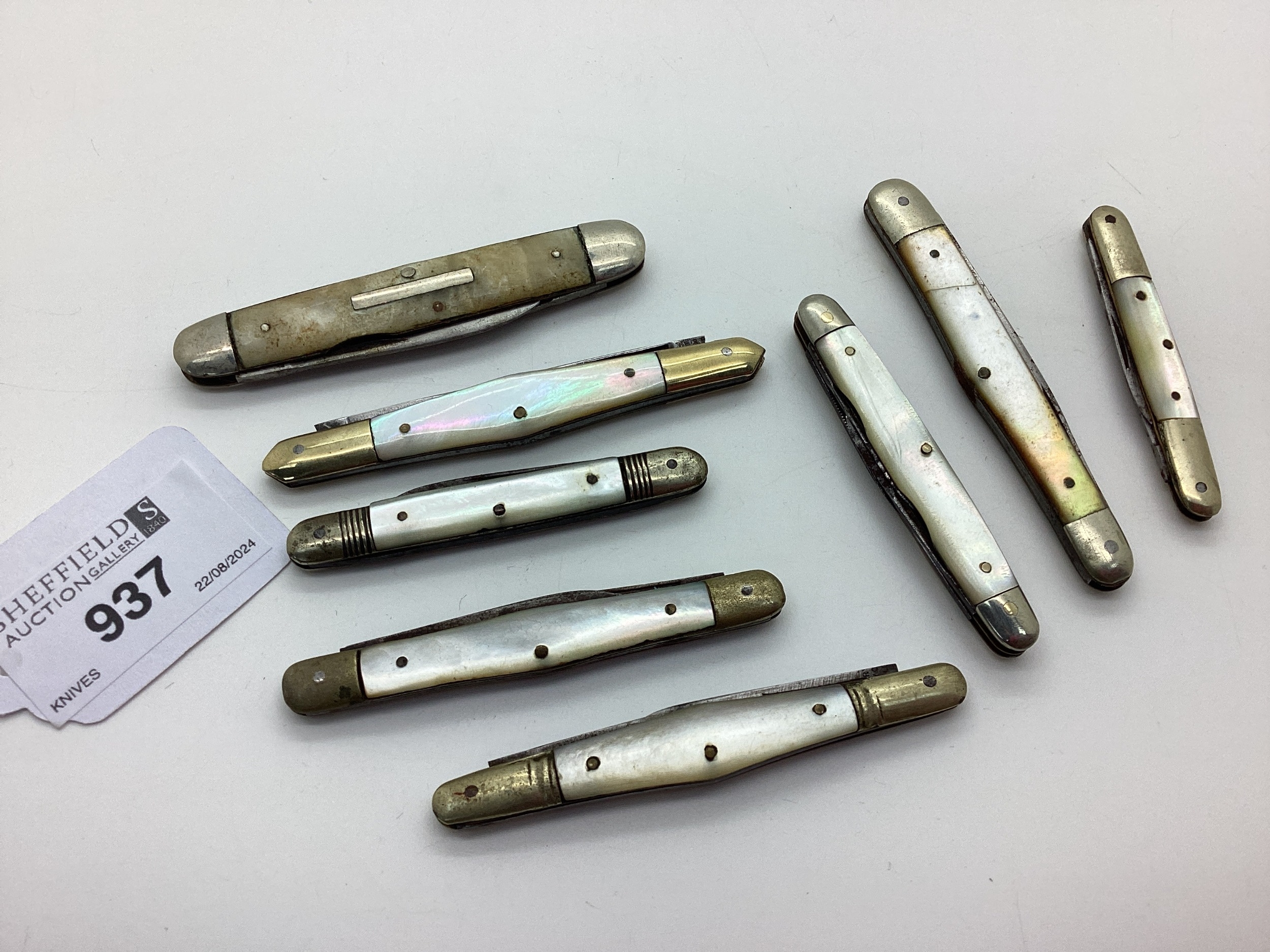 A Collection of Assorted Folding Pocket / Penknives, mother of pearl scales, nickel bolsters (5.1cm-8cm closed). (8)