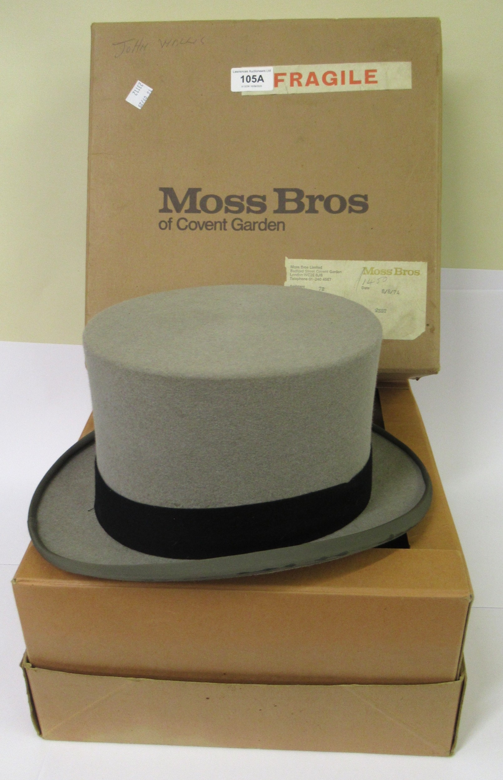 Moss Bros of Covent Garden, grey felt top hat, in original box