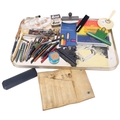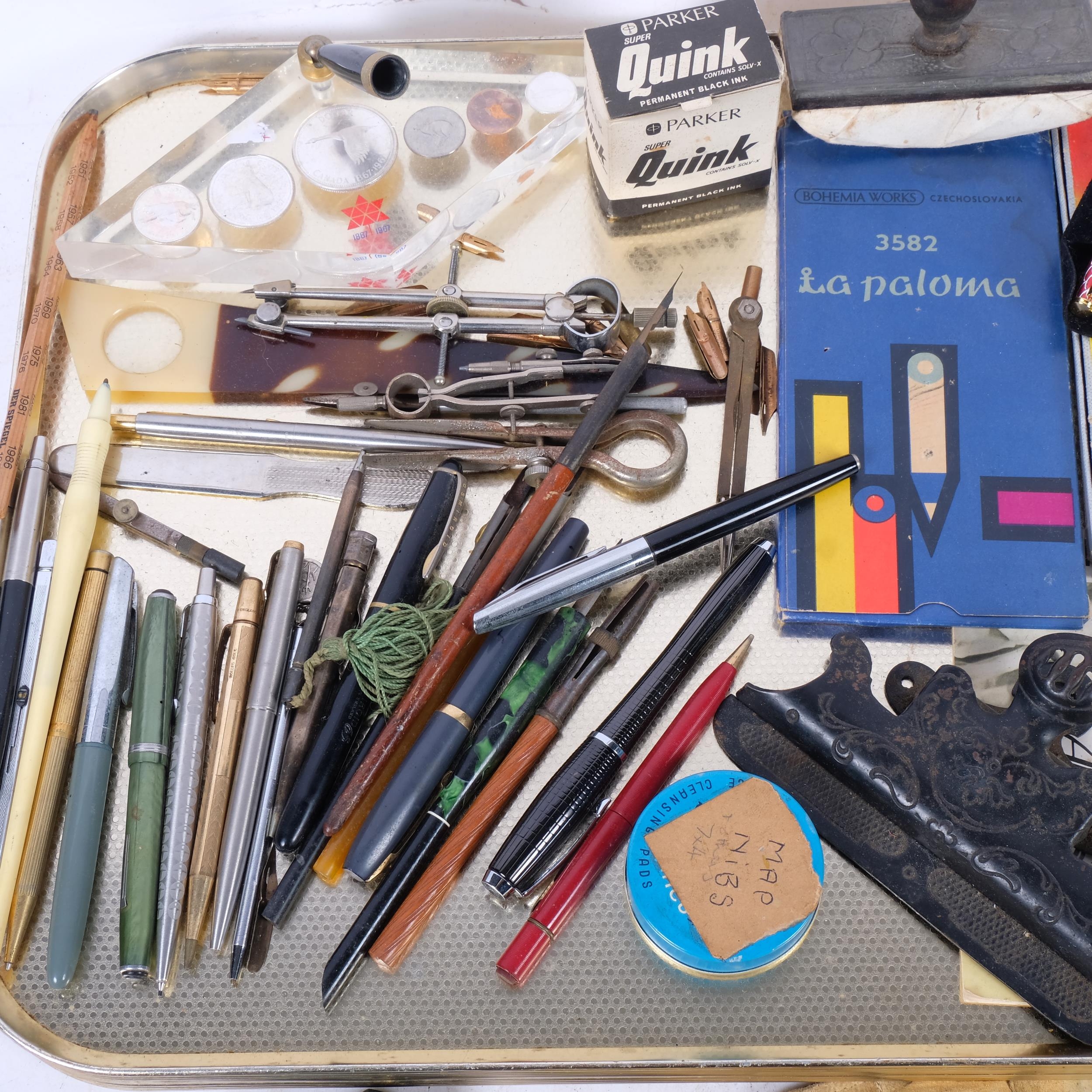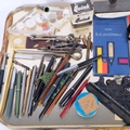 A group of various desk stands, paperclips, fountain and other pens, etc