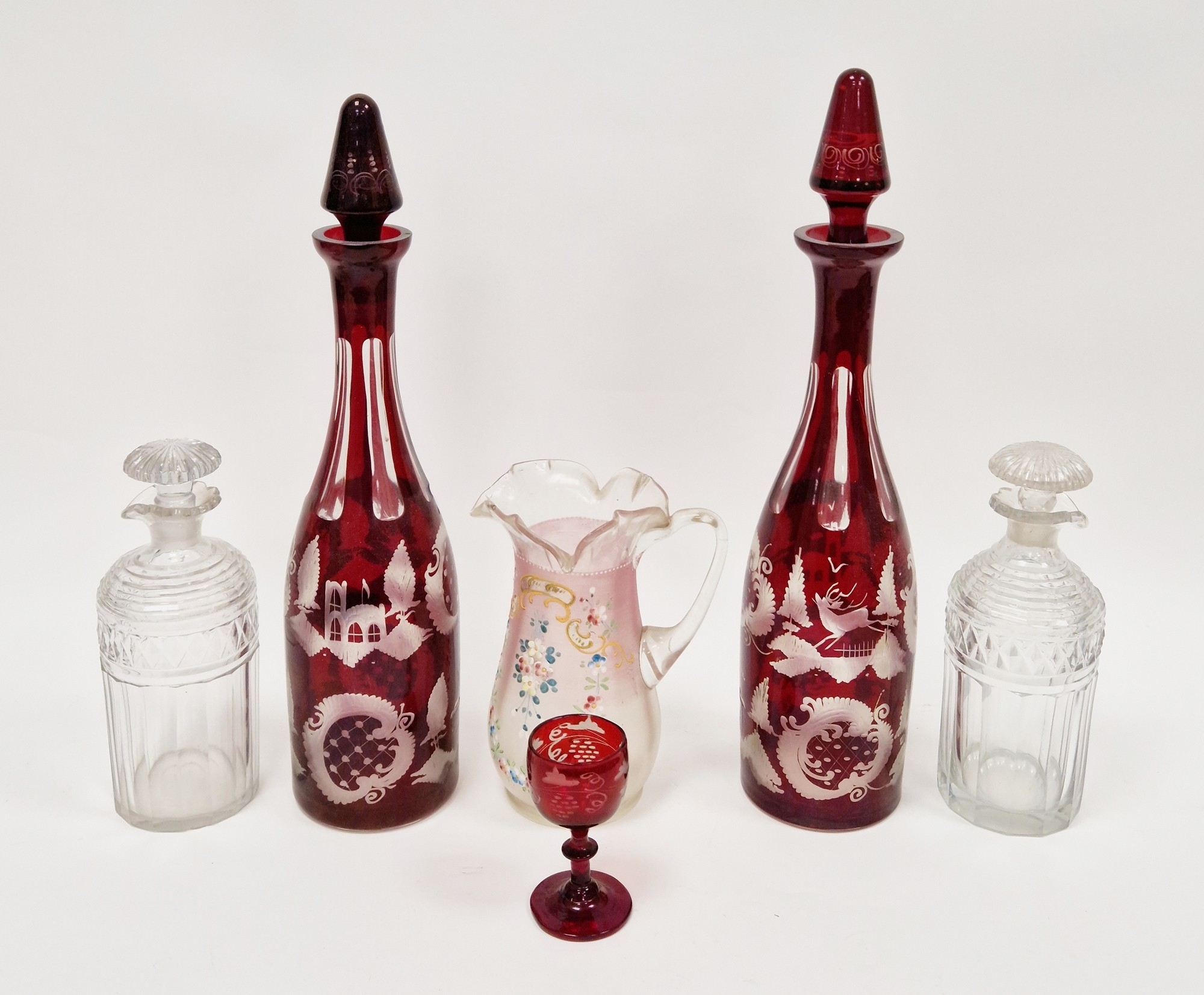 Pair of 19th century Bohemian ruby flashed and engraved decanters and stoppers, decorated with stag, hunts and buildings, 38cm high, a small goblet similar, a pair of Victorian panel and diamond cut cruet bottle decanters and stoppers and an opaque glass and enamelled baluster jug (6)