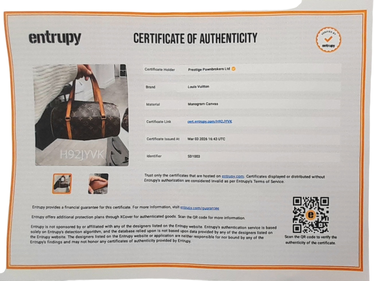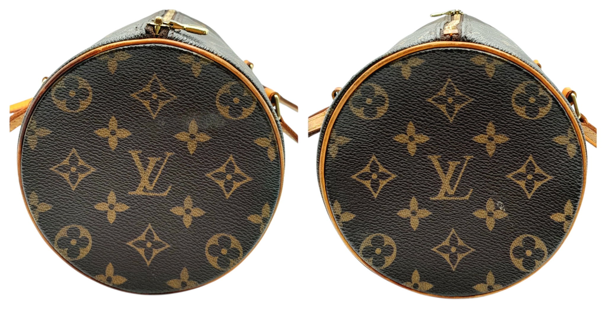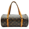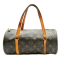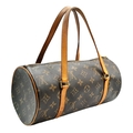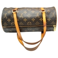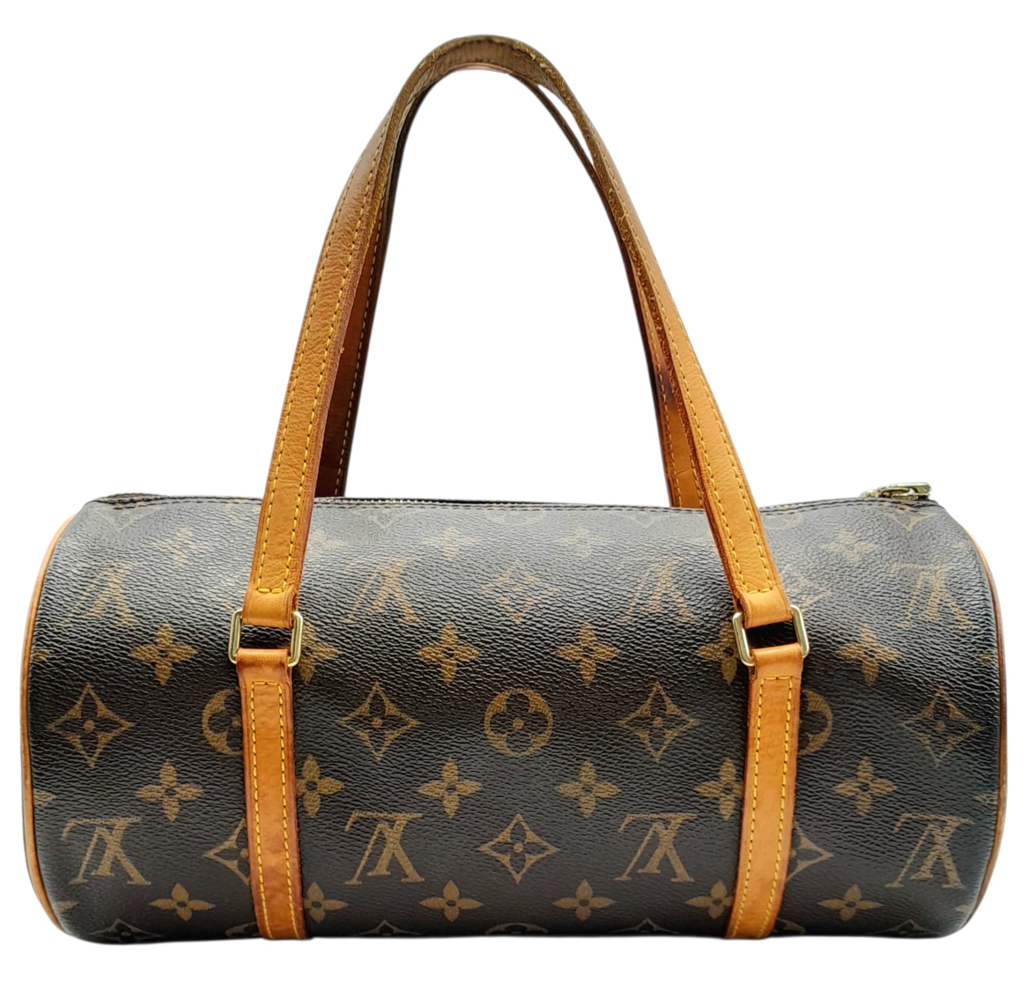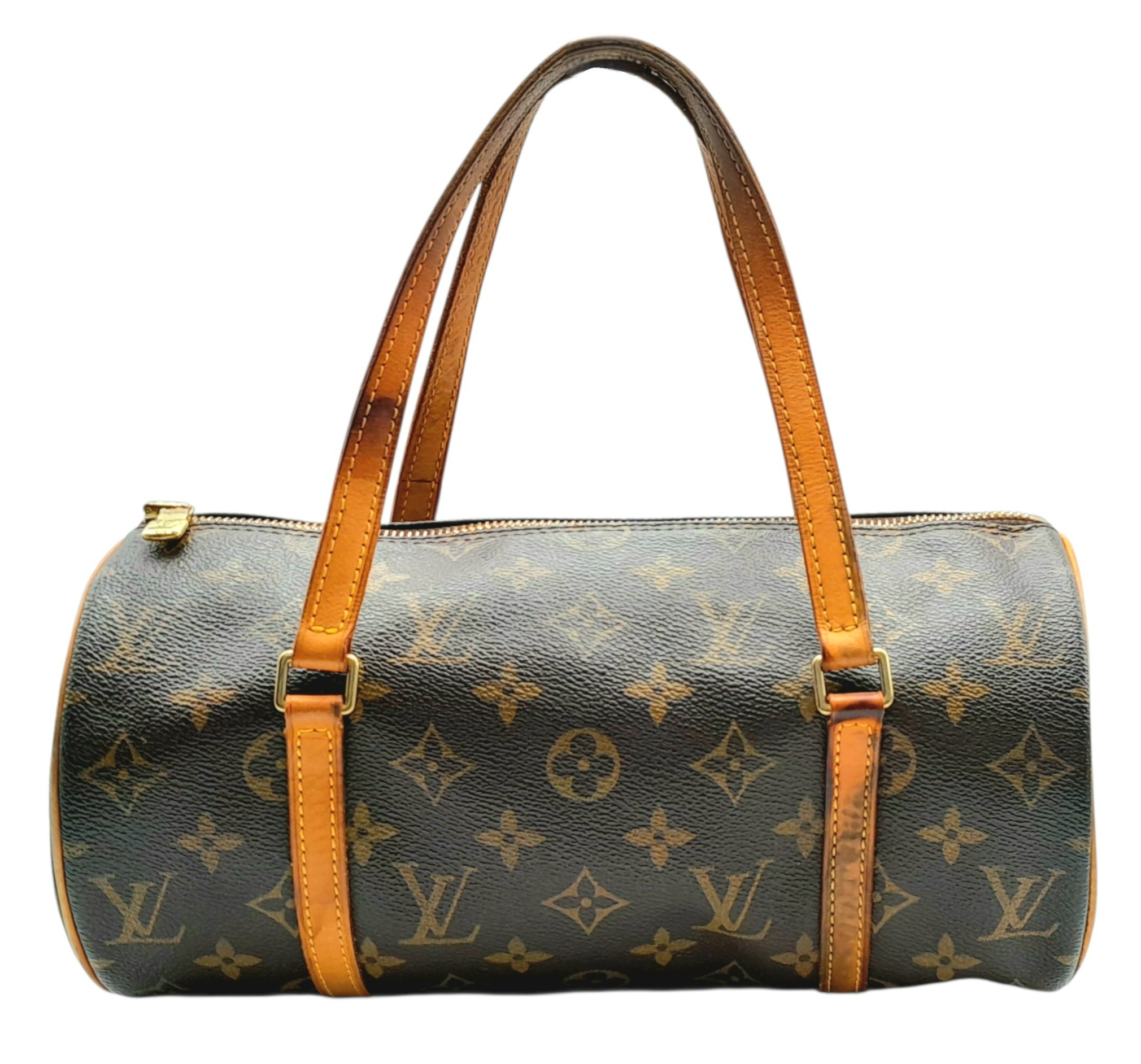 A Louis Vuitton Monogram Papillon 26 Hand Bag. Crafted in brown LV monogram coated canvas with light brown vachetta leather trim and dual top handles, finished with gold-toned hardware and a zip-top closure. The cylindrical barrel design opens to a brown cross-grain leather-lined interior with a single main compartment. Comes with certificate of authenticity. Approximately 27.5cm length x 13.7cm height. Discolouration to the leather trim and signs of wear to the hardware, but in good condition overall. Please see photos or request a condition report. Ref: 27099
