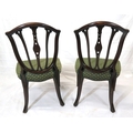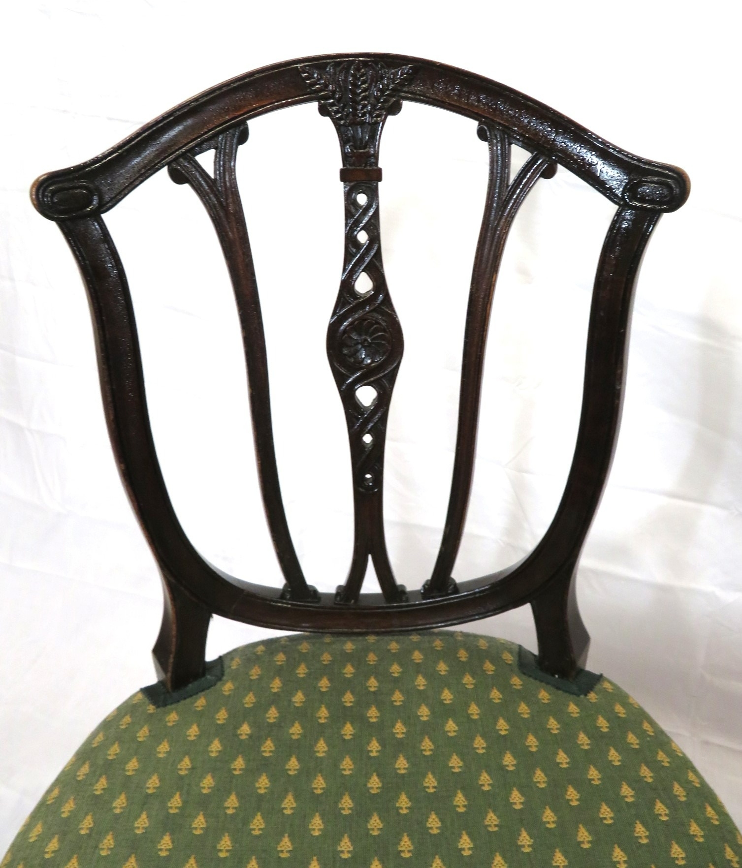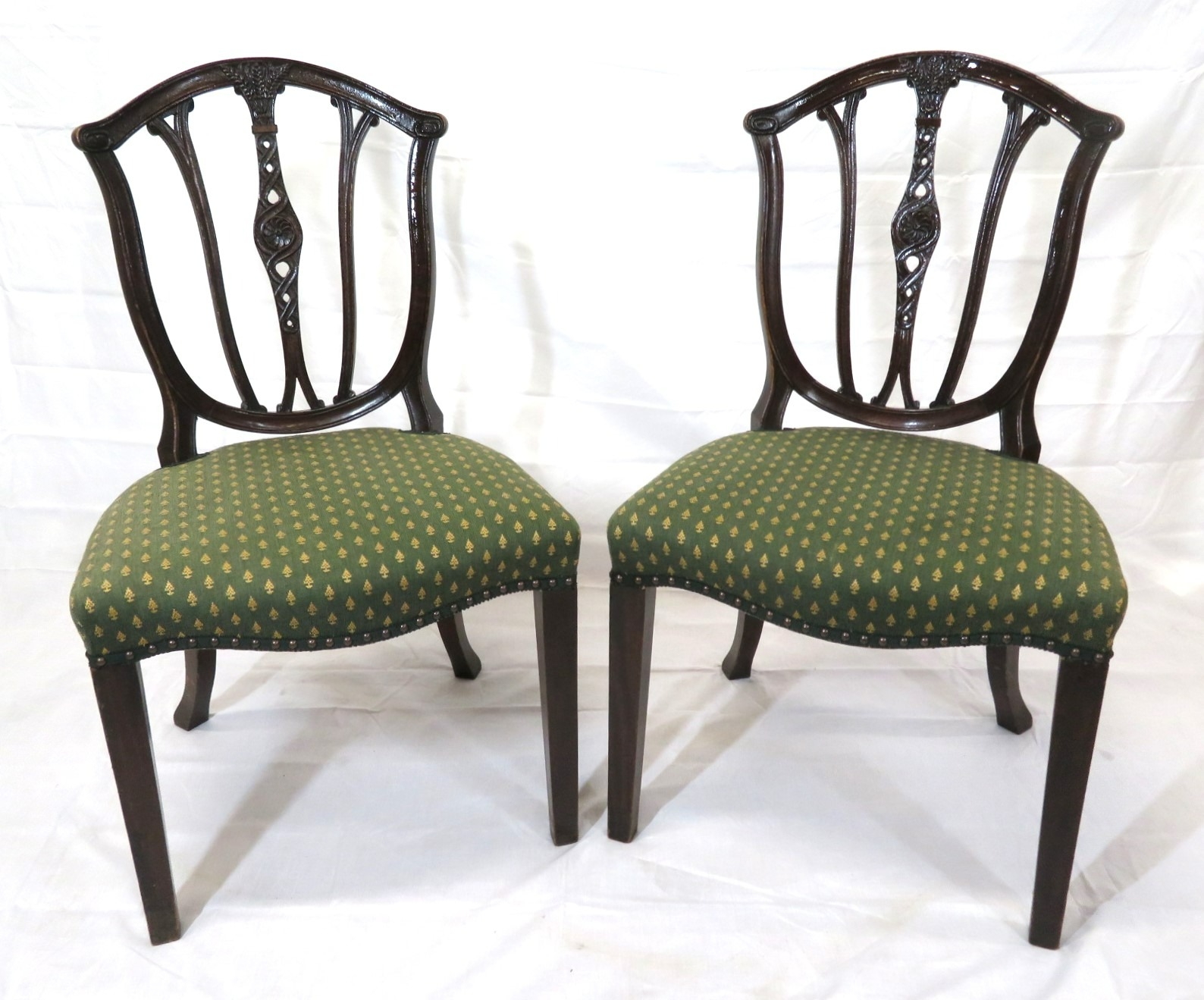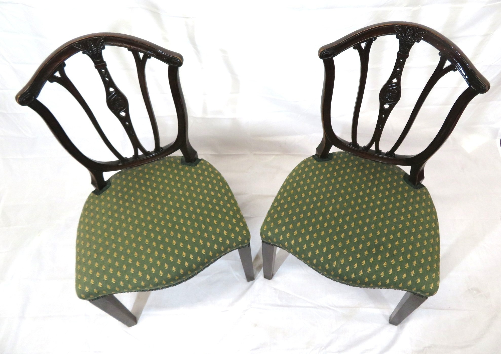 Pair of Victorian mahogany occasional chairs with shaped rails, wheatsheaf carving, serpentine upholstered seats, on square tapering legs