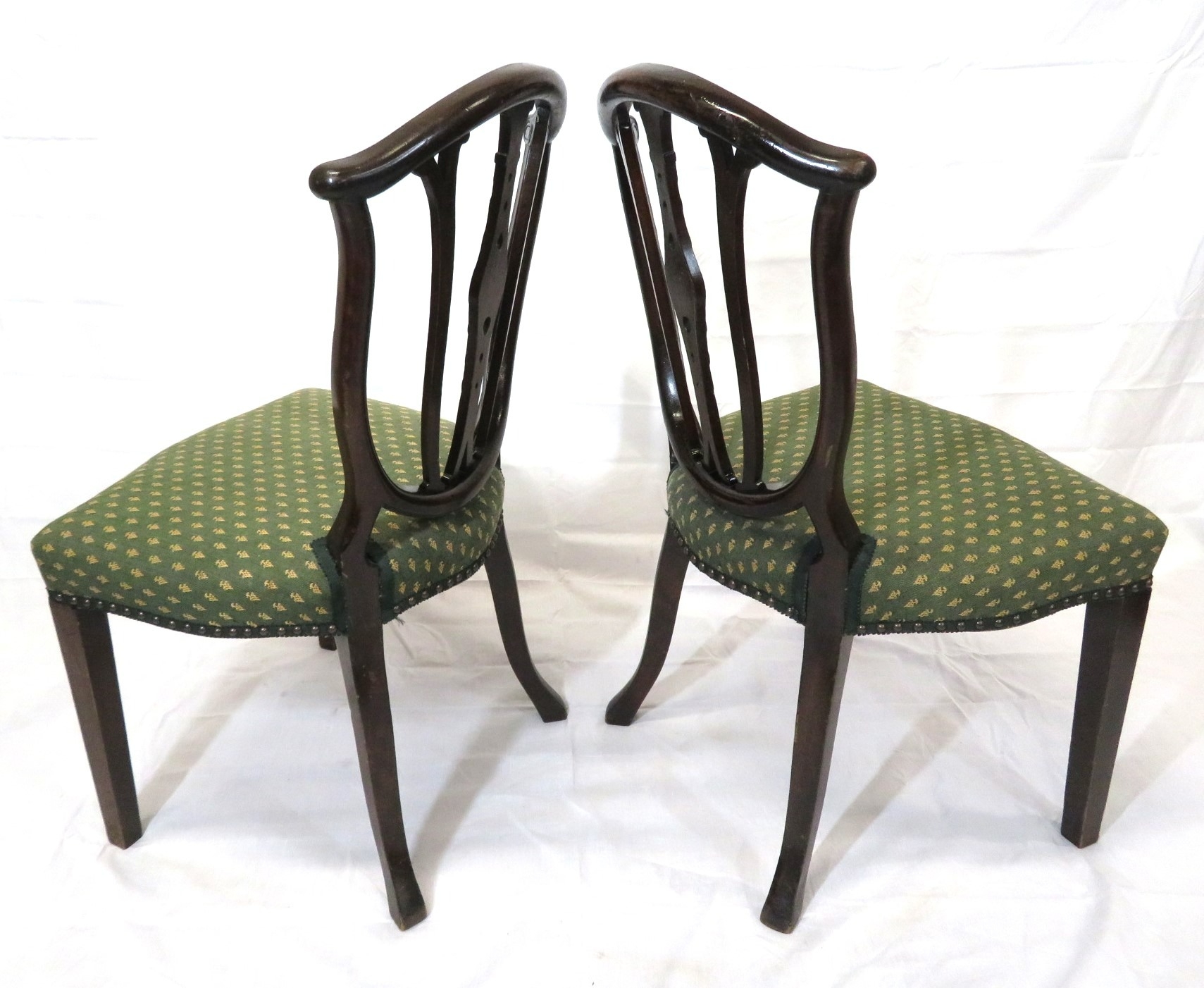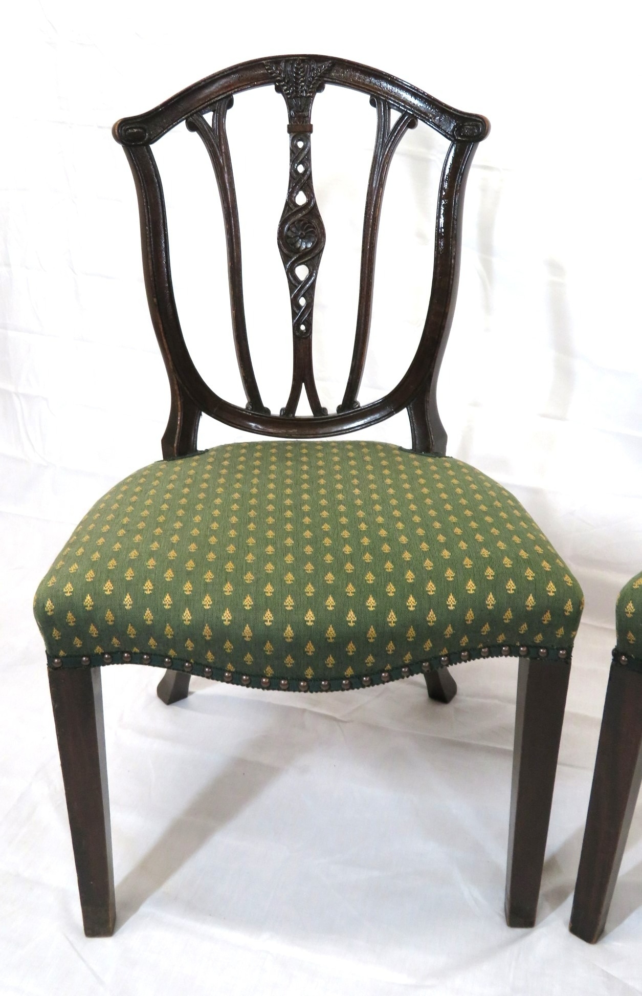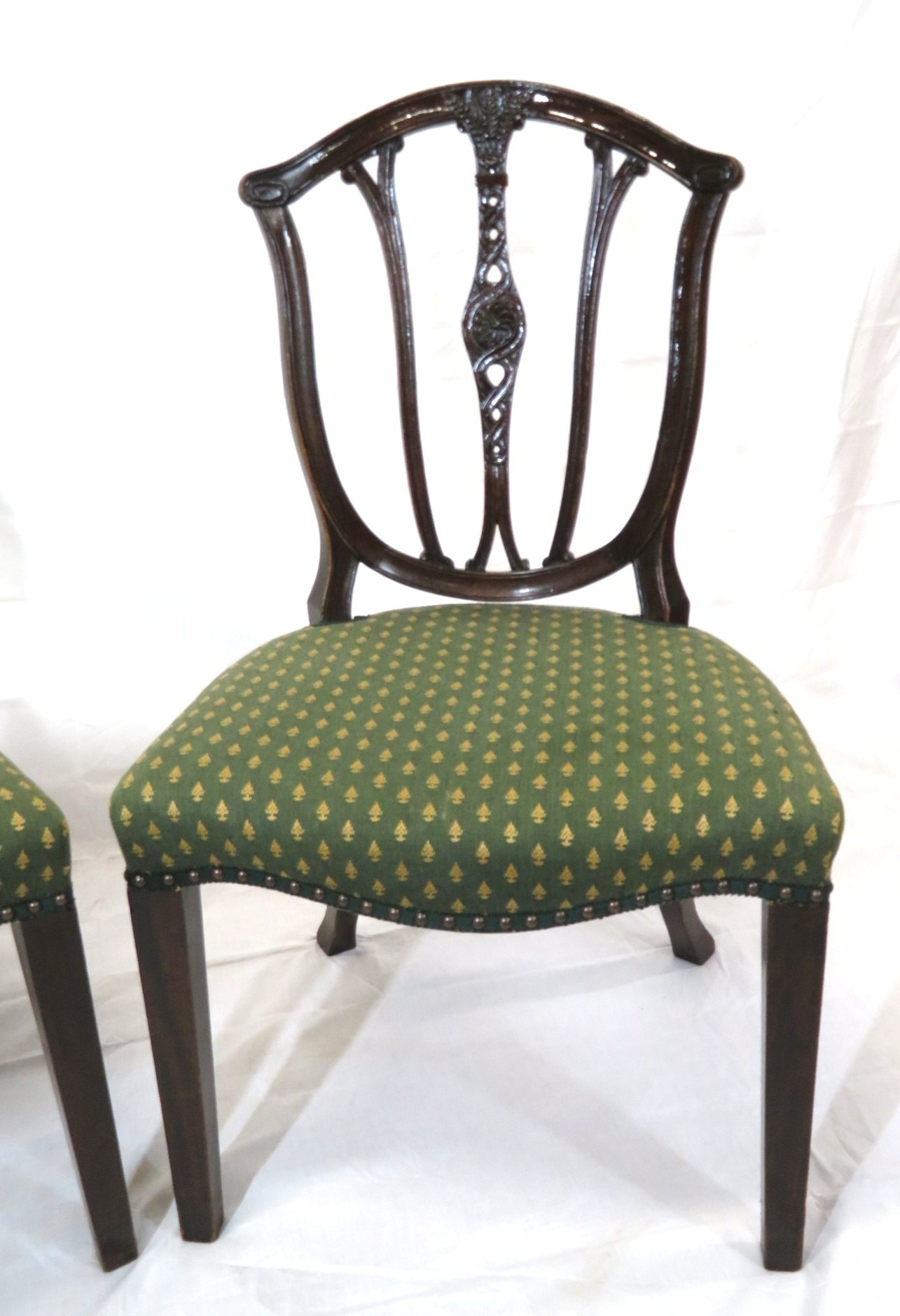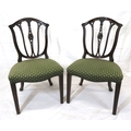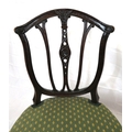 Pair of Victorian mahogany occasional chairs with shaped rails, wheatsheaf carving, serpentine upholstered seats, on square tapering legs
