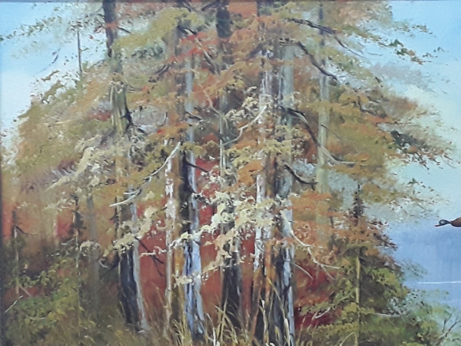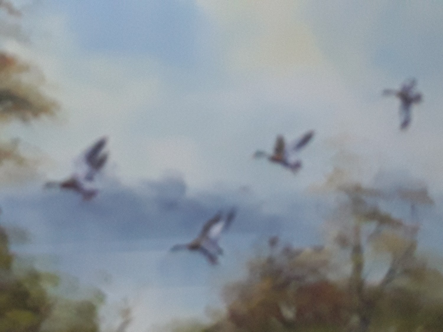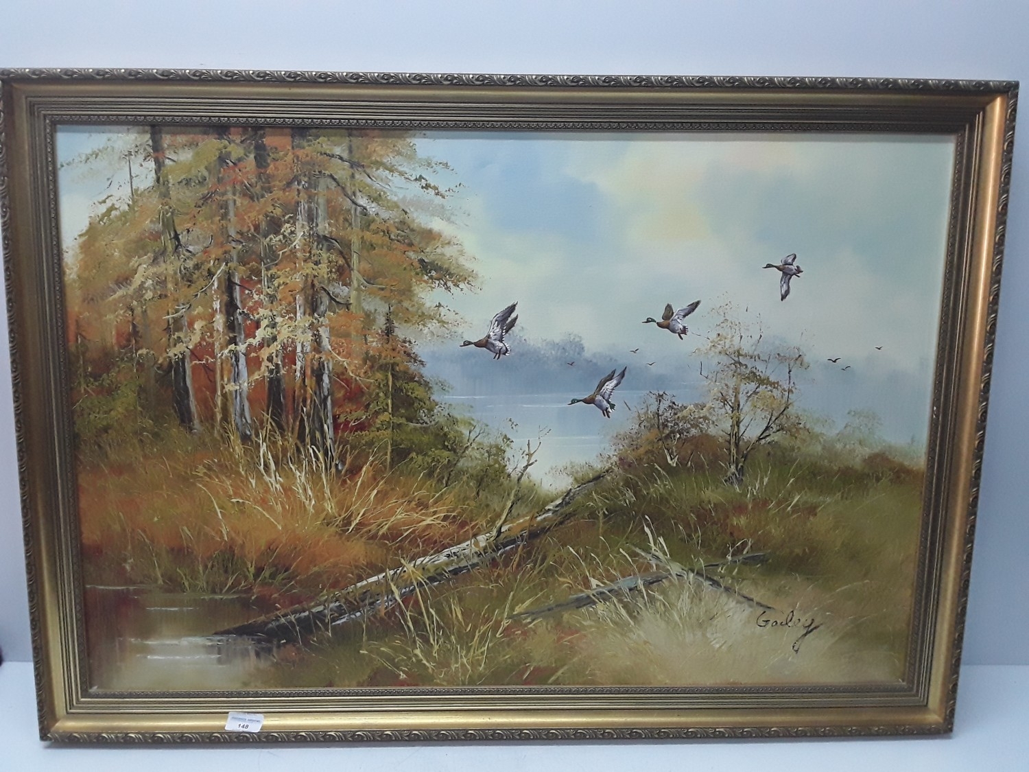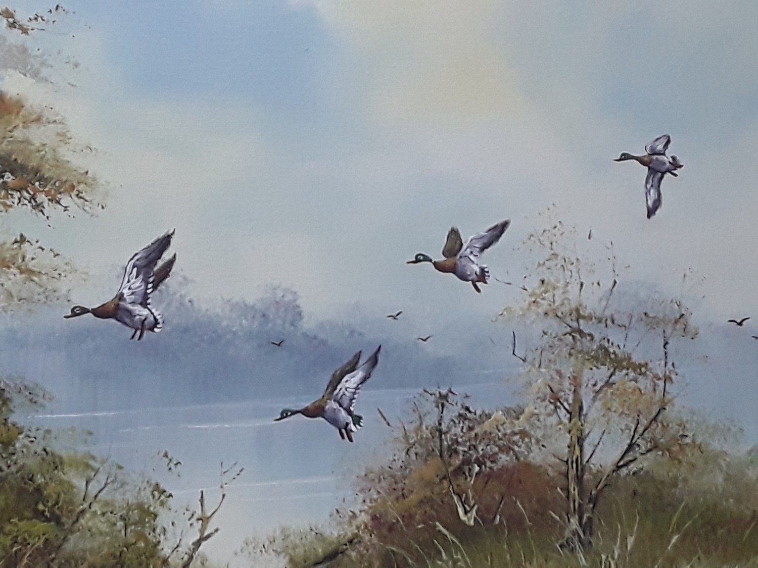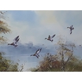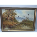 Large framed oil on board of ducks in flight country scene, signed by the artist, 100 x 71cms