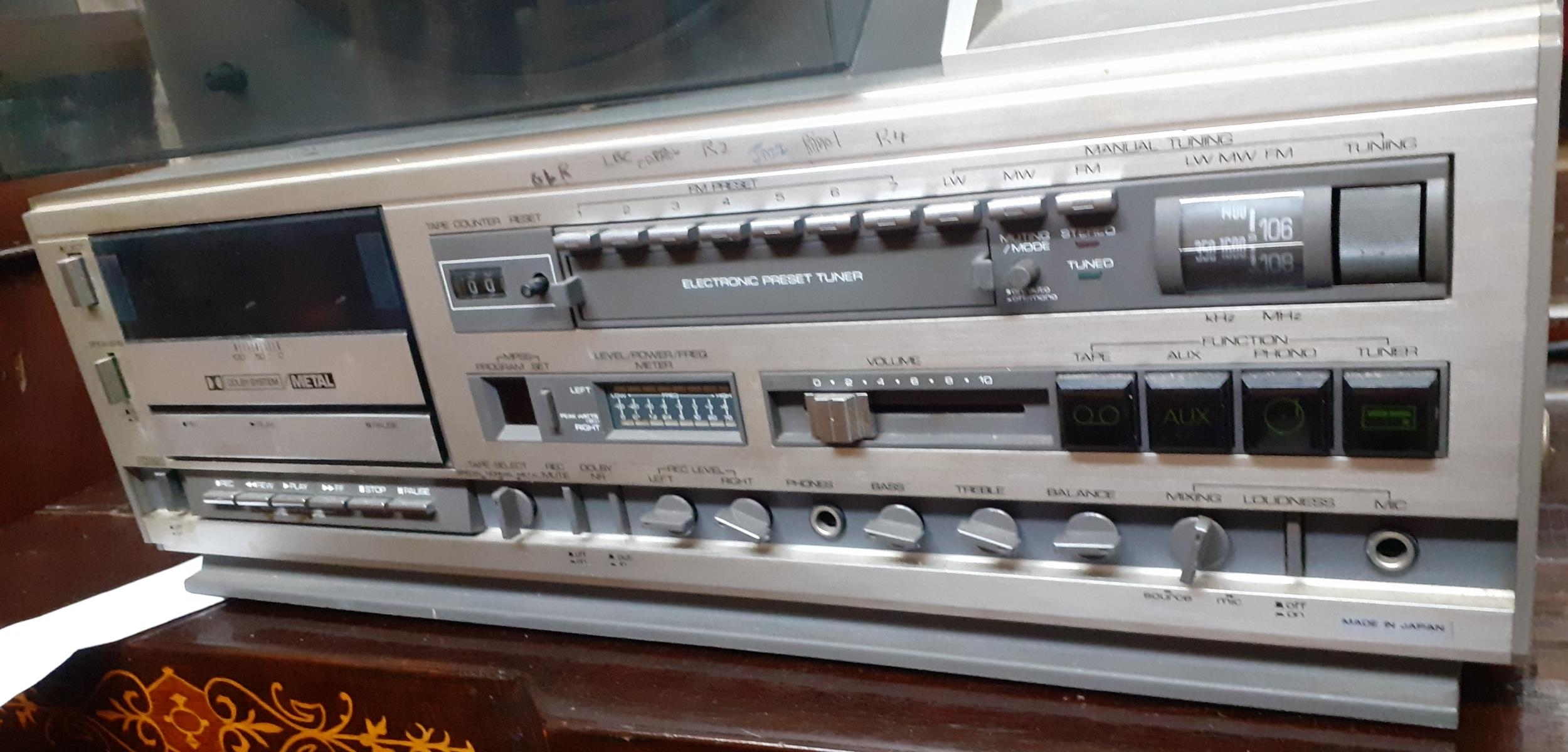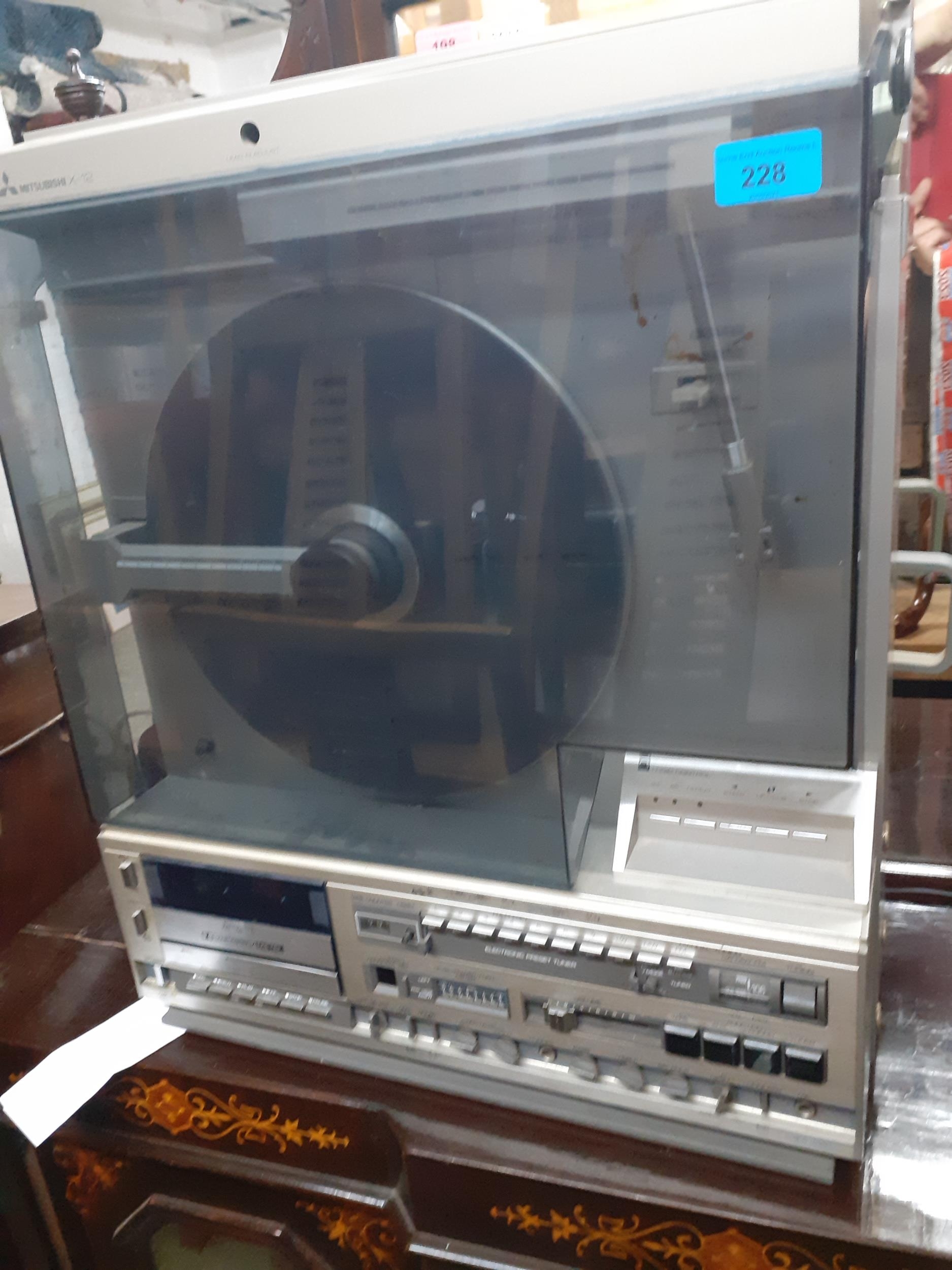 A Mitsubishi vertical X-12 turntable and stereo audio system with radio tuner and cassette deck Location: G