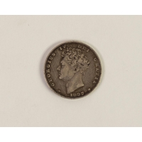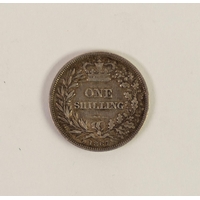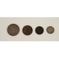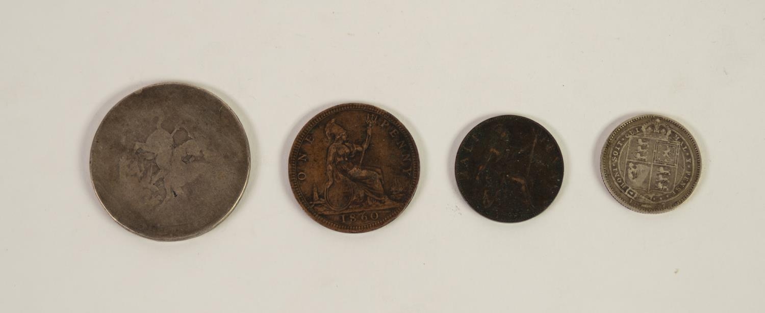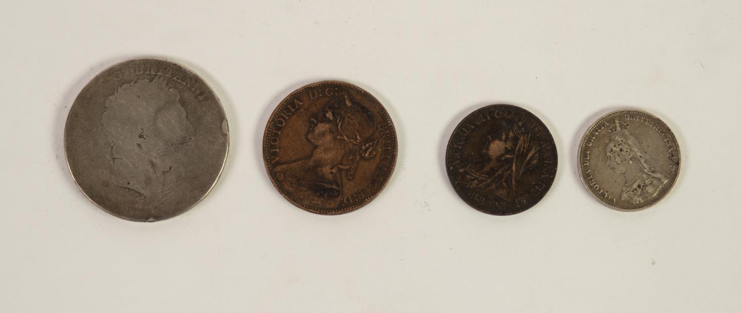 QUEEN VICTORIA 1860 BRONZE BUN HEAD PENNY, with date on the obverse (EF); VICTORIA 1896 HALF PENNY (EF); VICTORIA 1887 SMALL HEAD SHILLING (VF); GEORGE III CROWN, George & dragon, circa 1818 (Poor) (5)