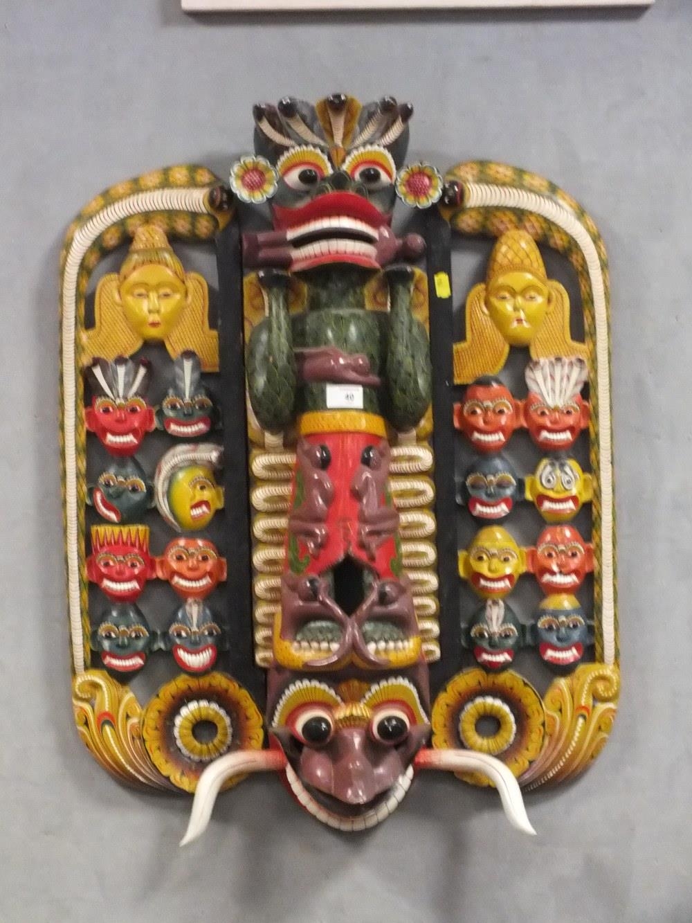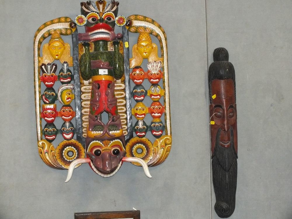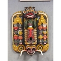 A LARGE UNUSUAL CARVEN WOODEN WALL HANGING MASK - OVERALL HIGHT 75CM - WIDTH 55CM TOGETHER WITH ANOTHER