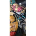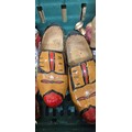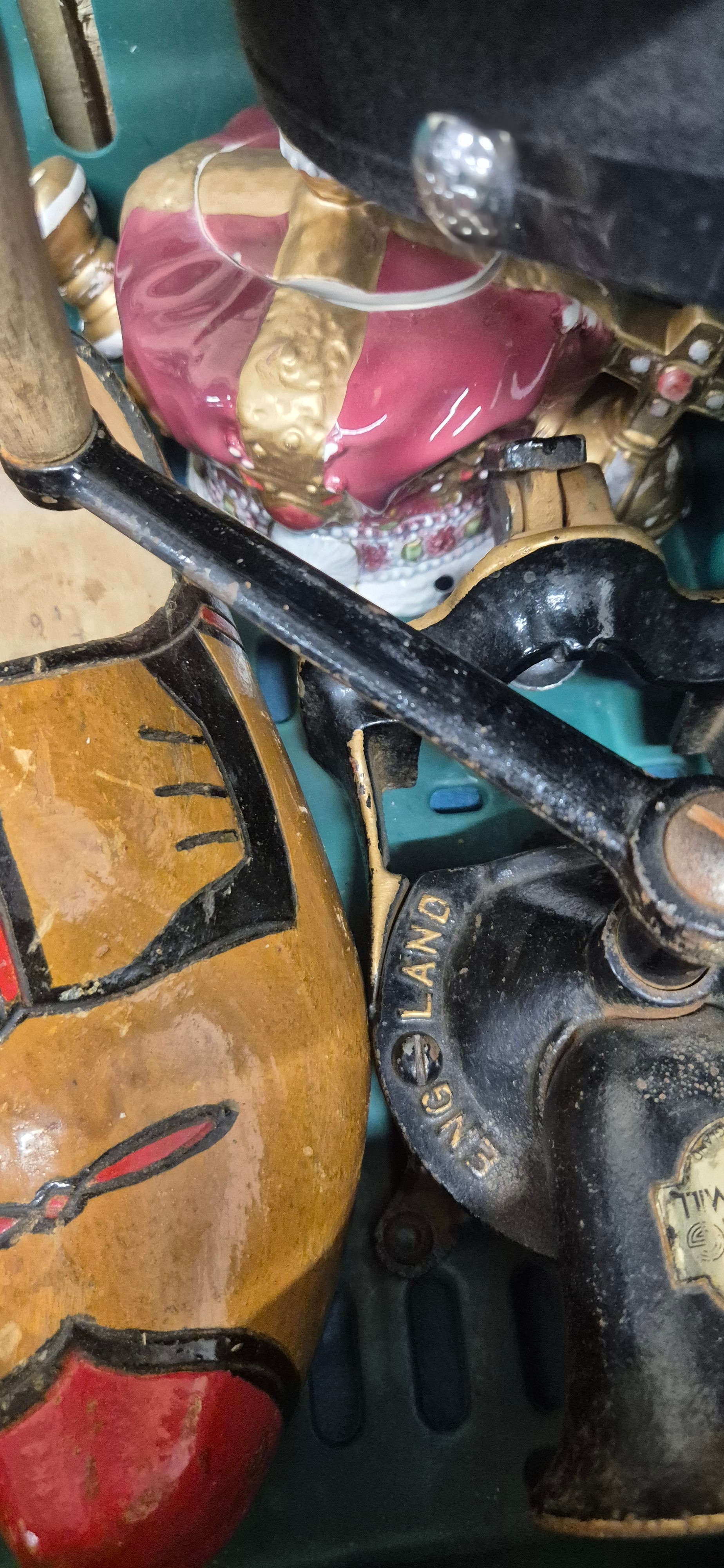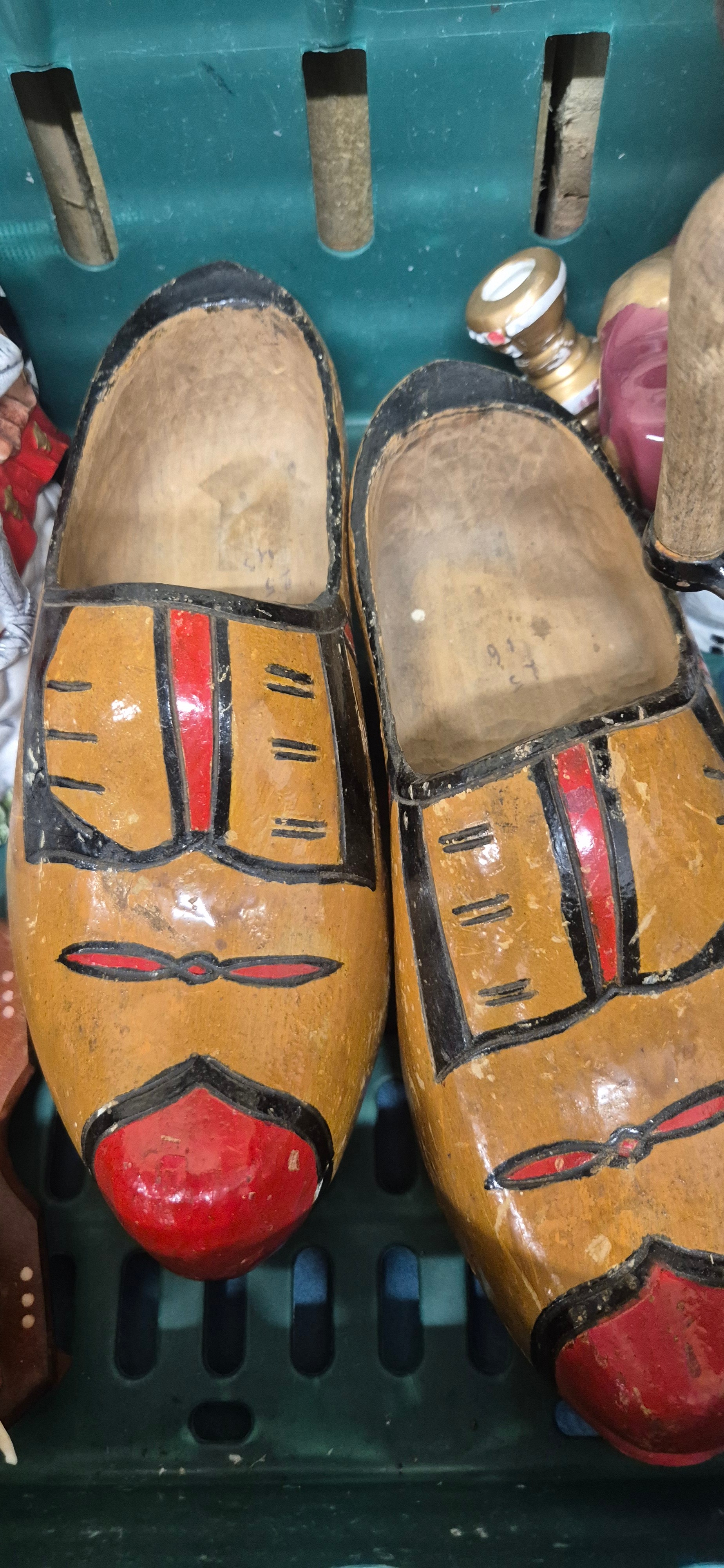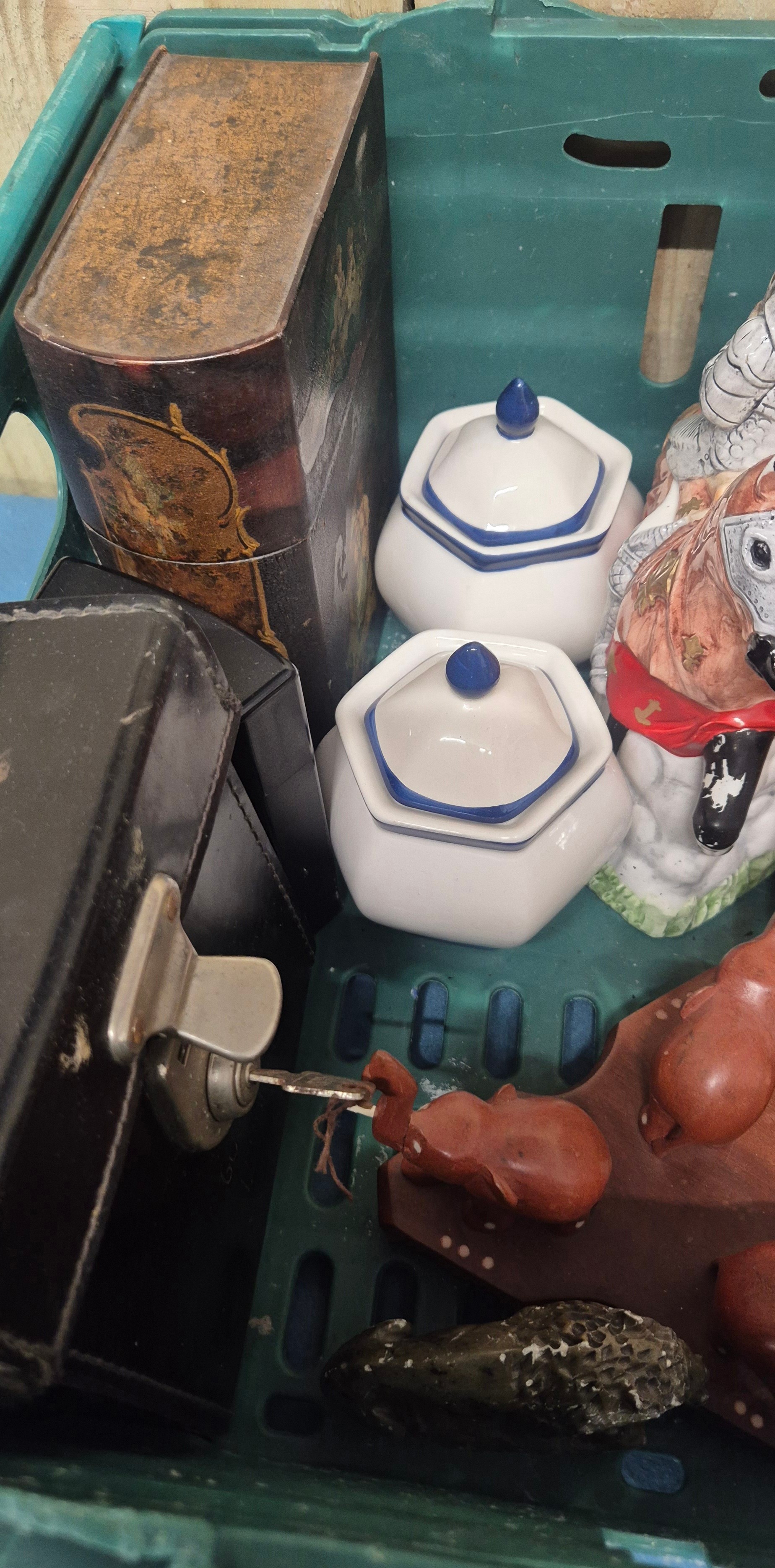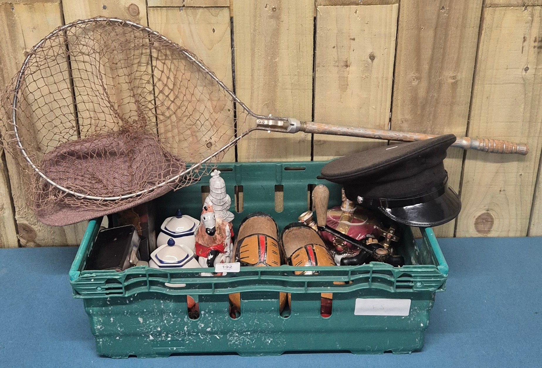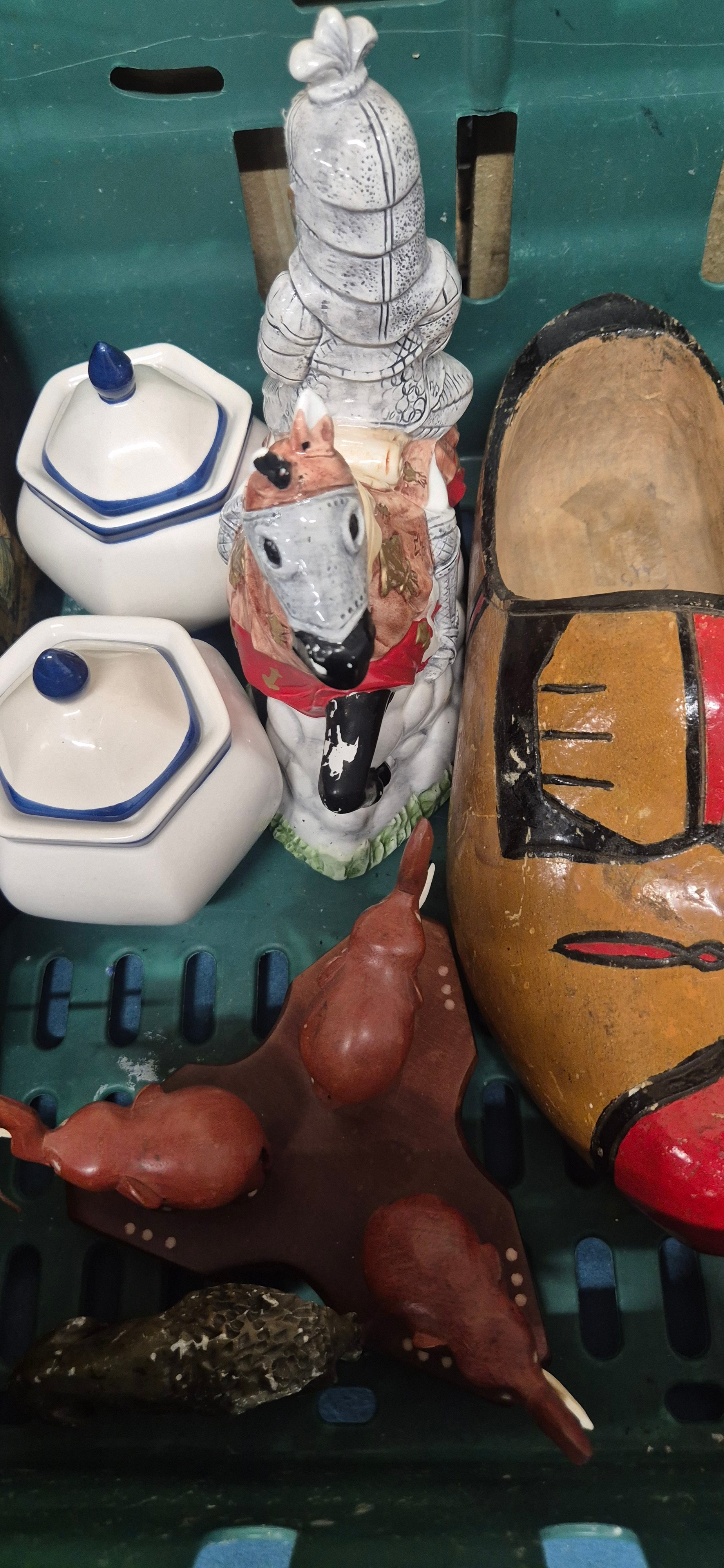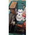 A Crate of collectables; Regency style paper mache box, Novelty tea pots, Wooden clogs, hats and other collectables.