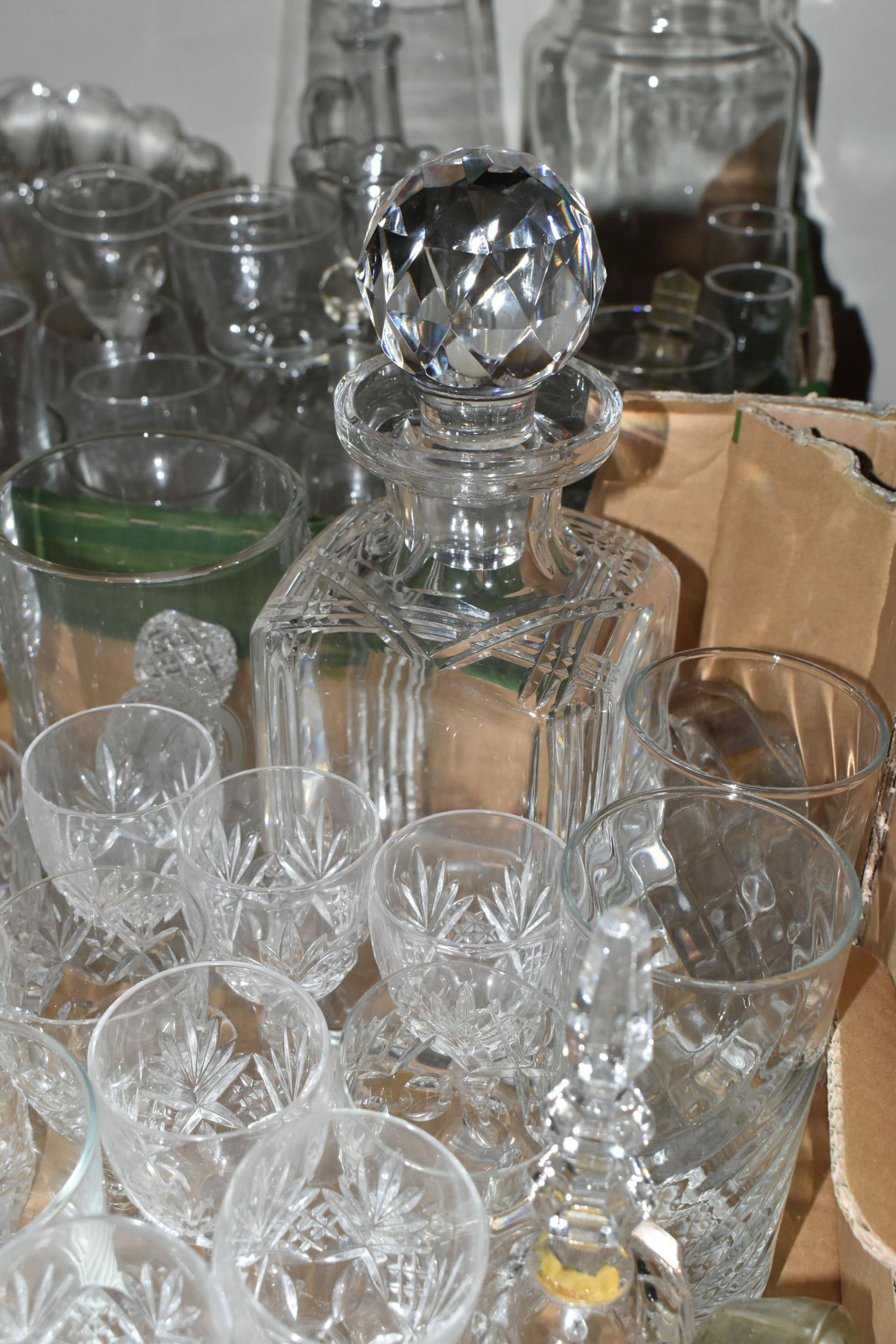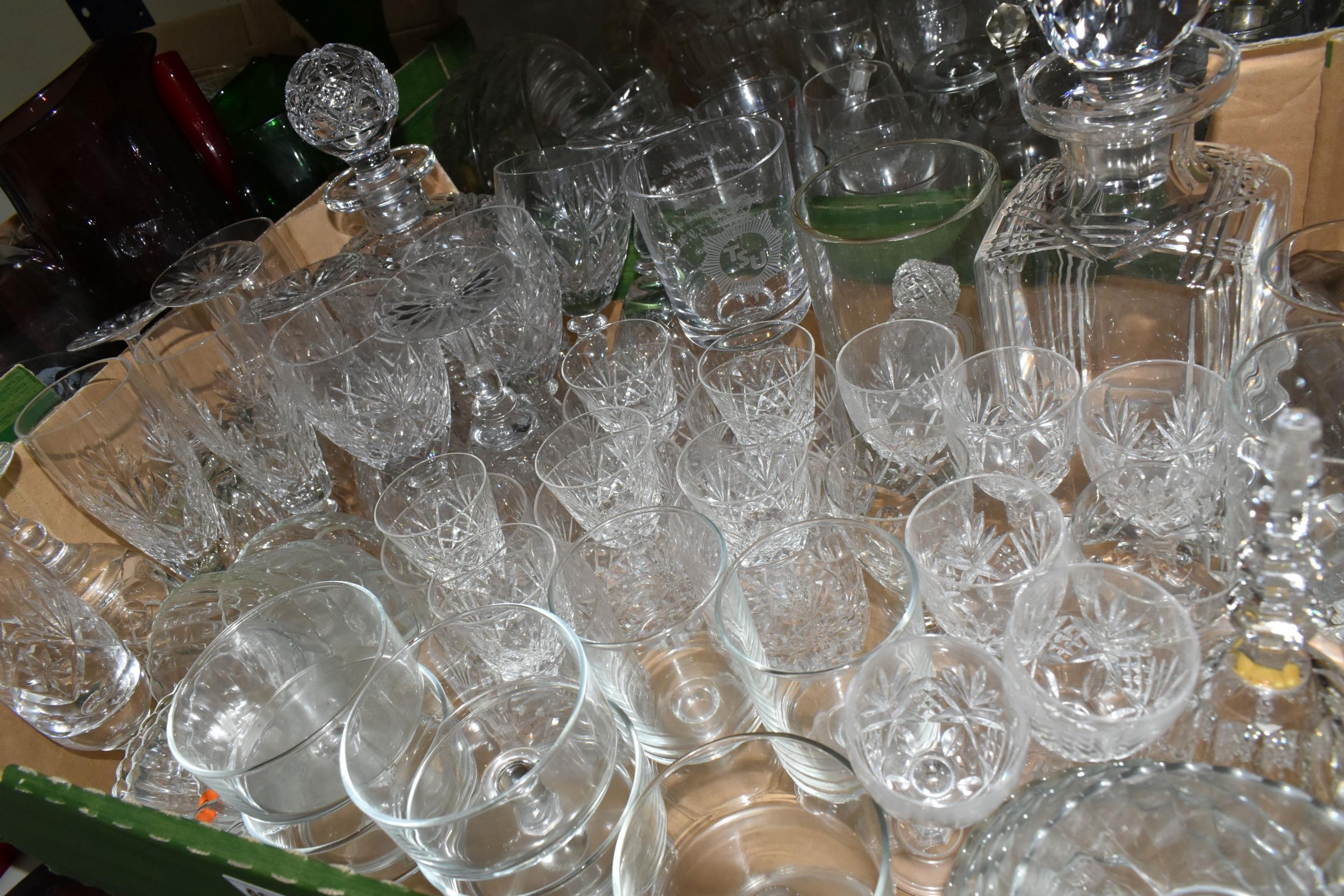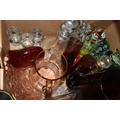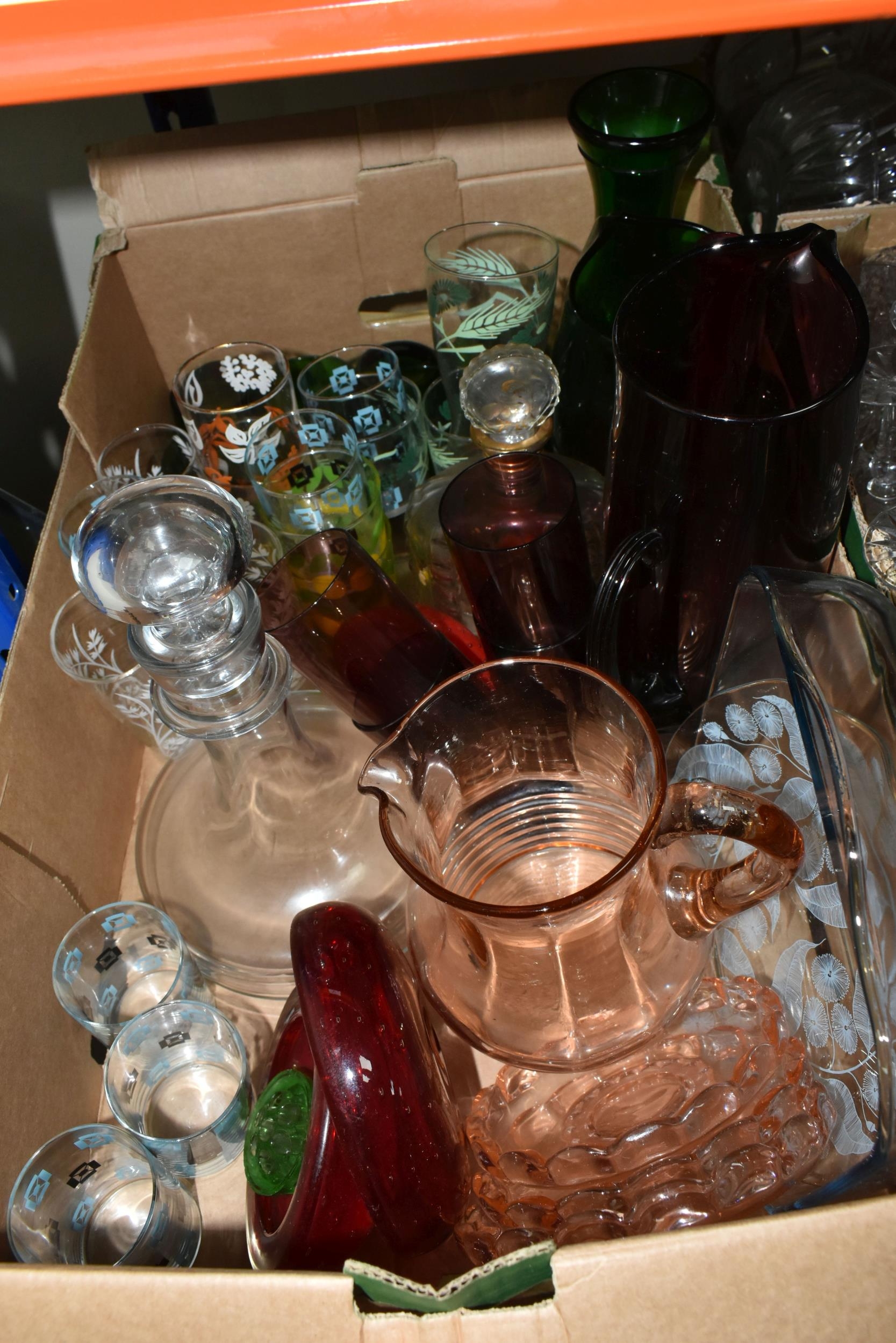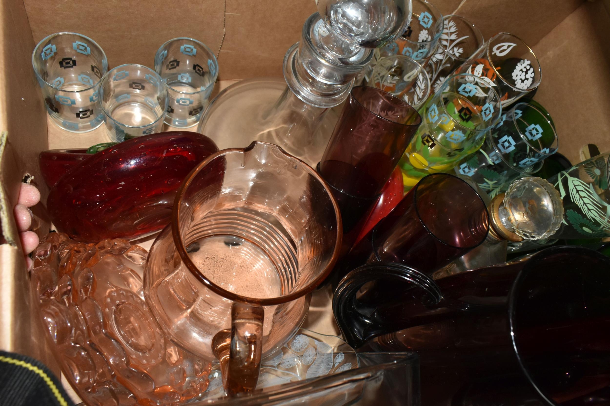 THREE BOXES OF GLASS WARE, to include two red Whitefriars bowls with controlled bubbles, crystal drinking glasses by makers including Richardson, coloured glass jugs, amethyst lemonade set, vintage printed hi-ball glasses, an Italian hand painted decanter, etc (3 boxes) (sd)