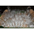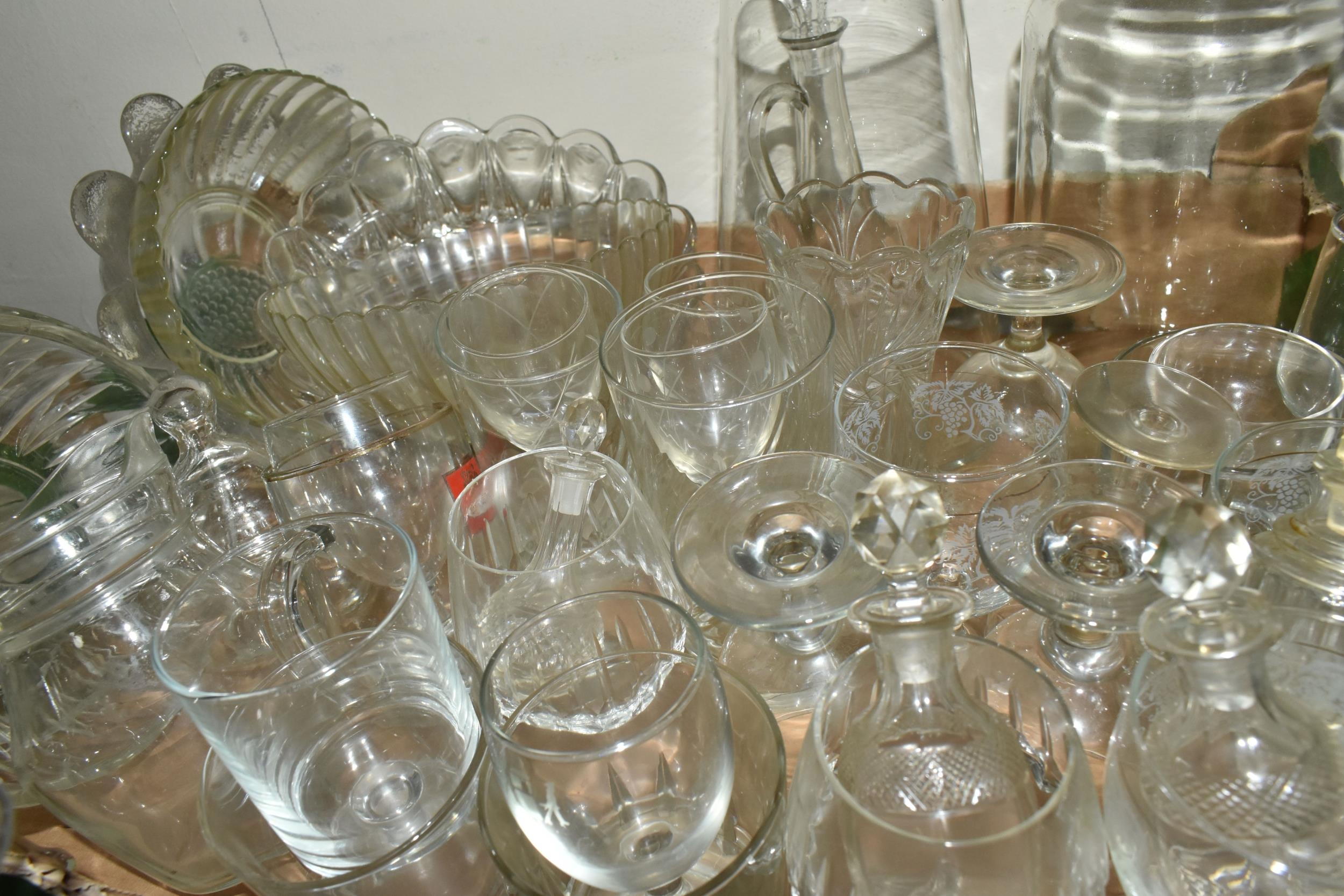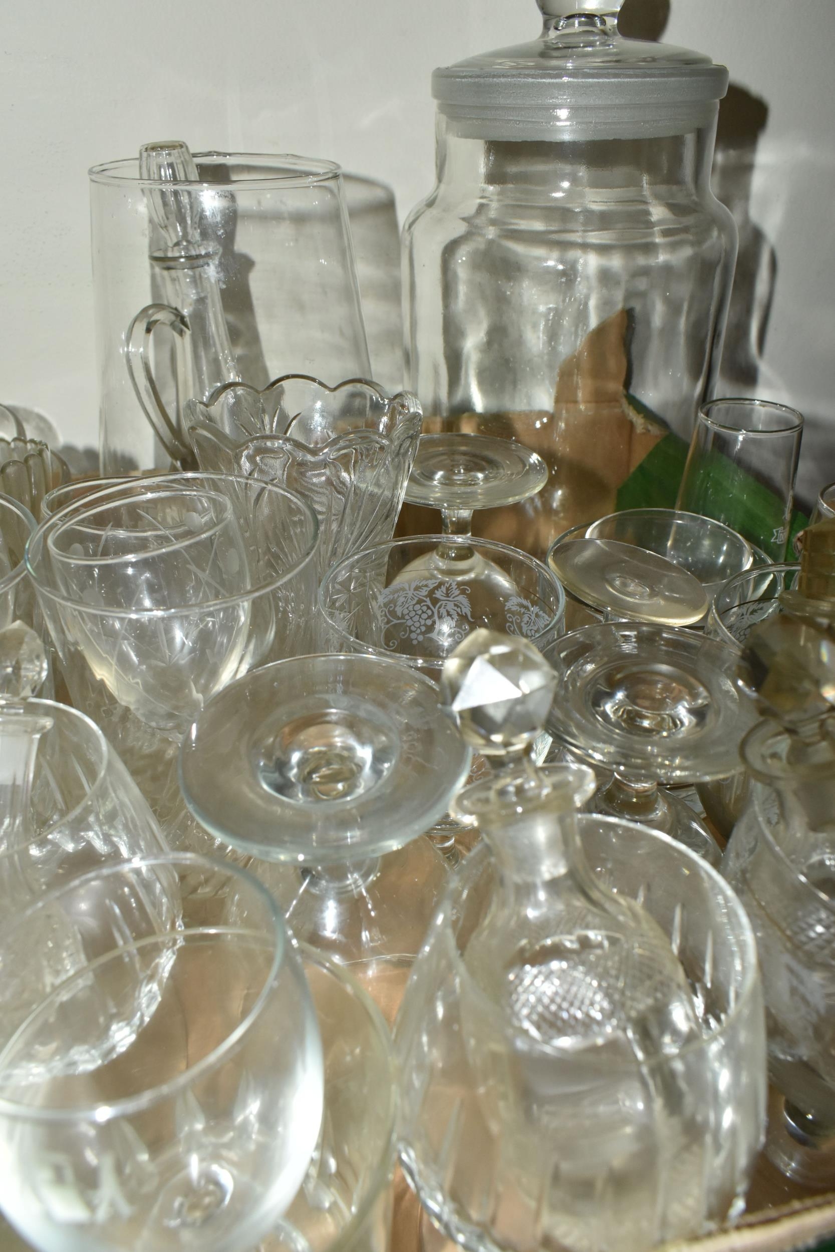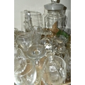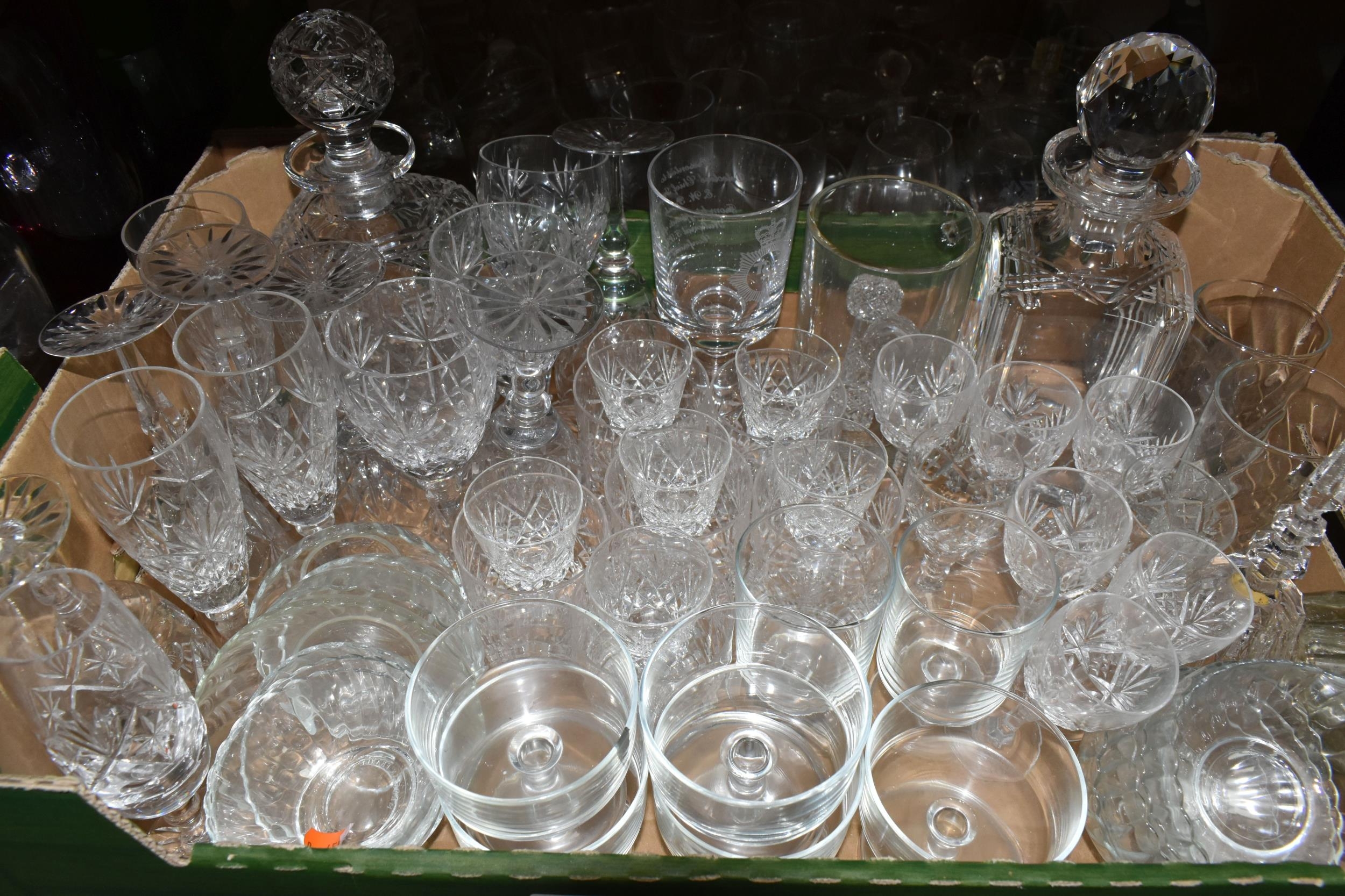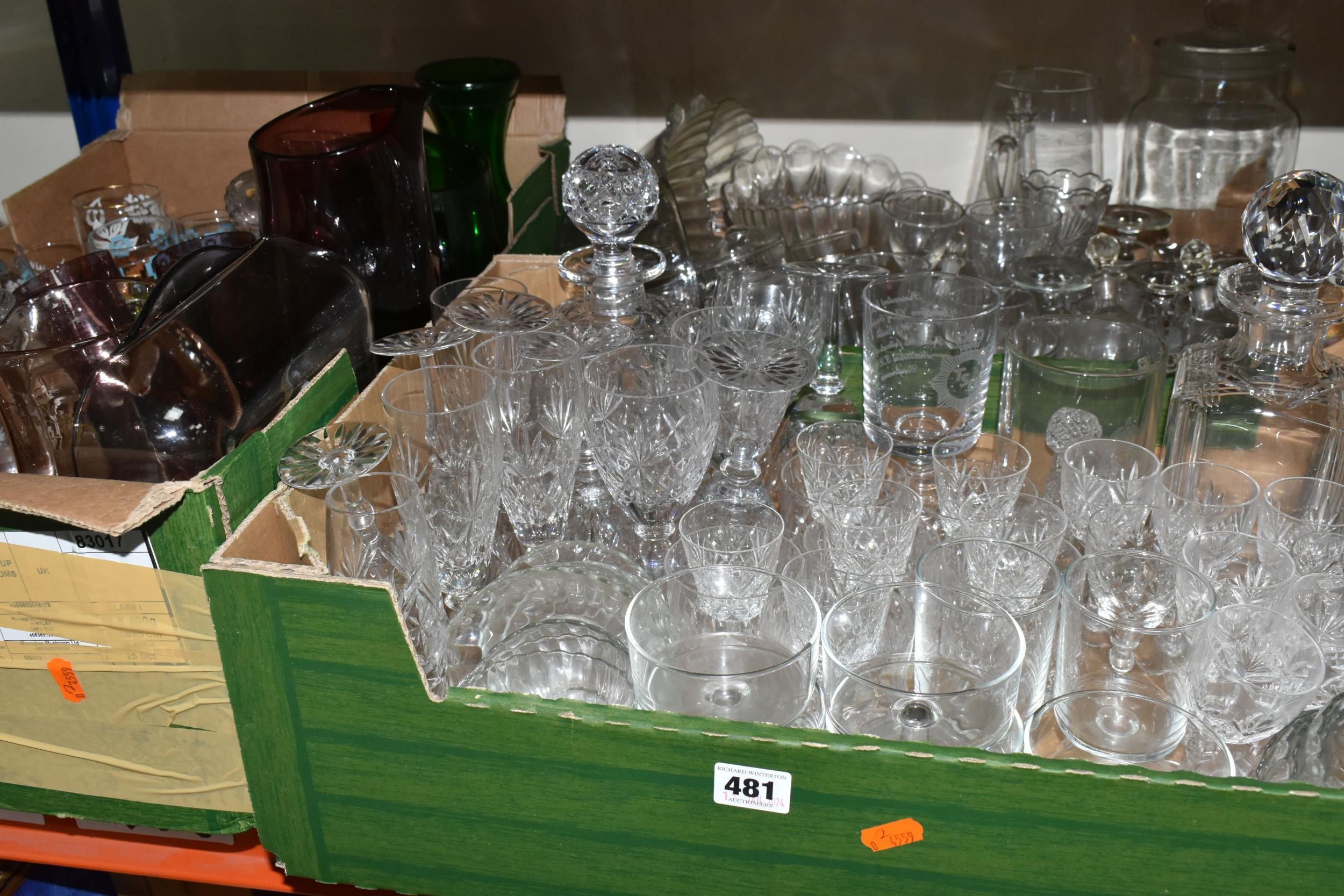 THREE BOXES OF GLASS WARE, to include two red Whitefriars bowls with controlled bubbles, crystal drinking glasses by makers including Richardson, coloured glass jugs, amethyst lemonade set, vintage printed hi-ball glasses, an Italian hand painted decanter, etc (3 boxes) (sd)