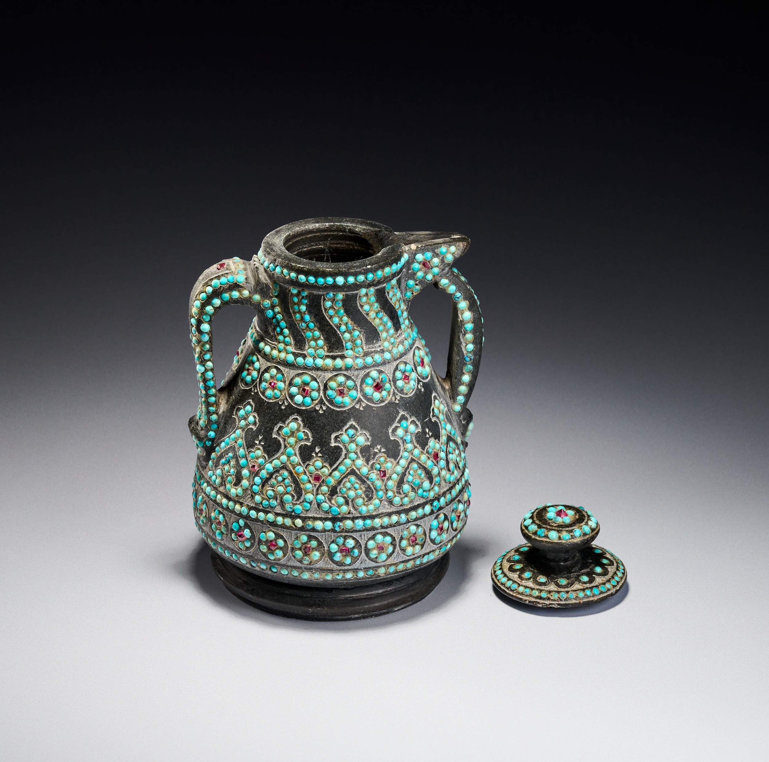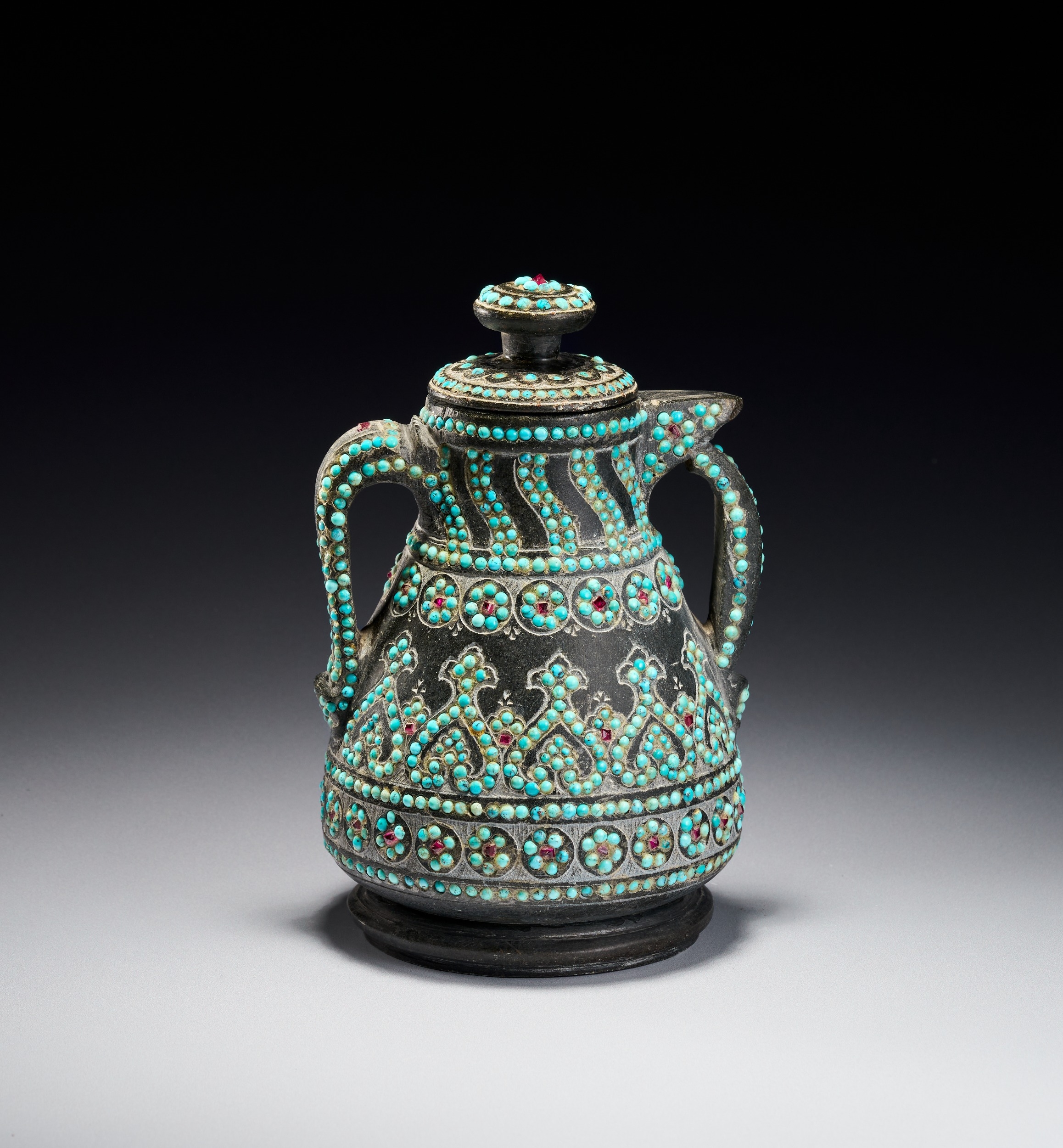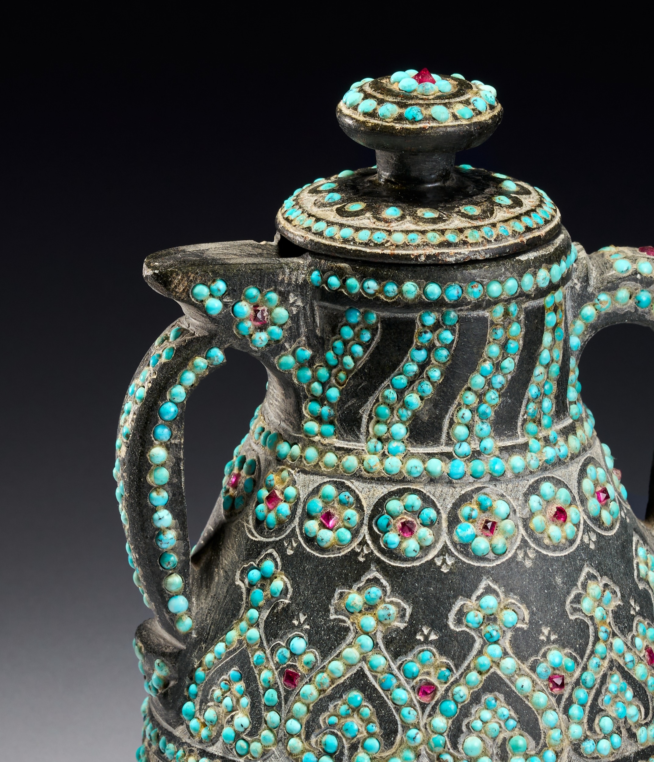 The vessel is carved from a dark hardstone, such as chlorite or soapstone, and features a matte patina. The body is heavily ornamented with inset gemstone cabochons, including turquoise and small red stones, possibly rubies or garnets. The construction includes two curved handles and a short, integrated spout. The decoration consists of fine incised scrolling and geometric patterns. The lid is topped with a central red stone surrounded by concentric rings of turquoise. The neck displays slanting bands of turquoise dots, while the shoulder and lower body feature registers of circular floral rosettes centered with red stones. The main body is adorned with a wide repeating band of interlocking palmette motifs densely filled with turquoise.