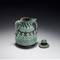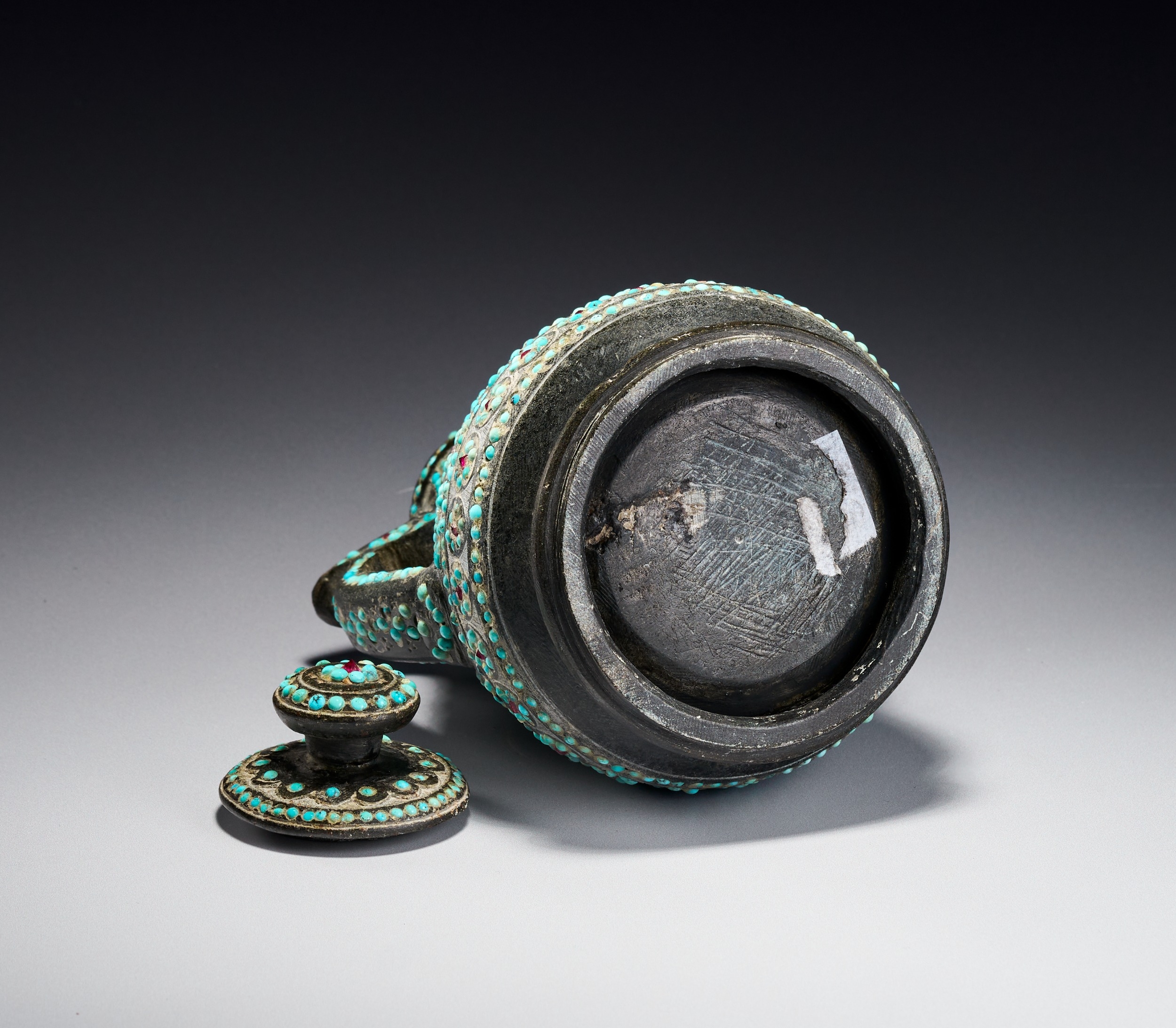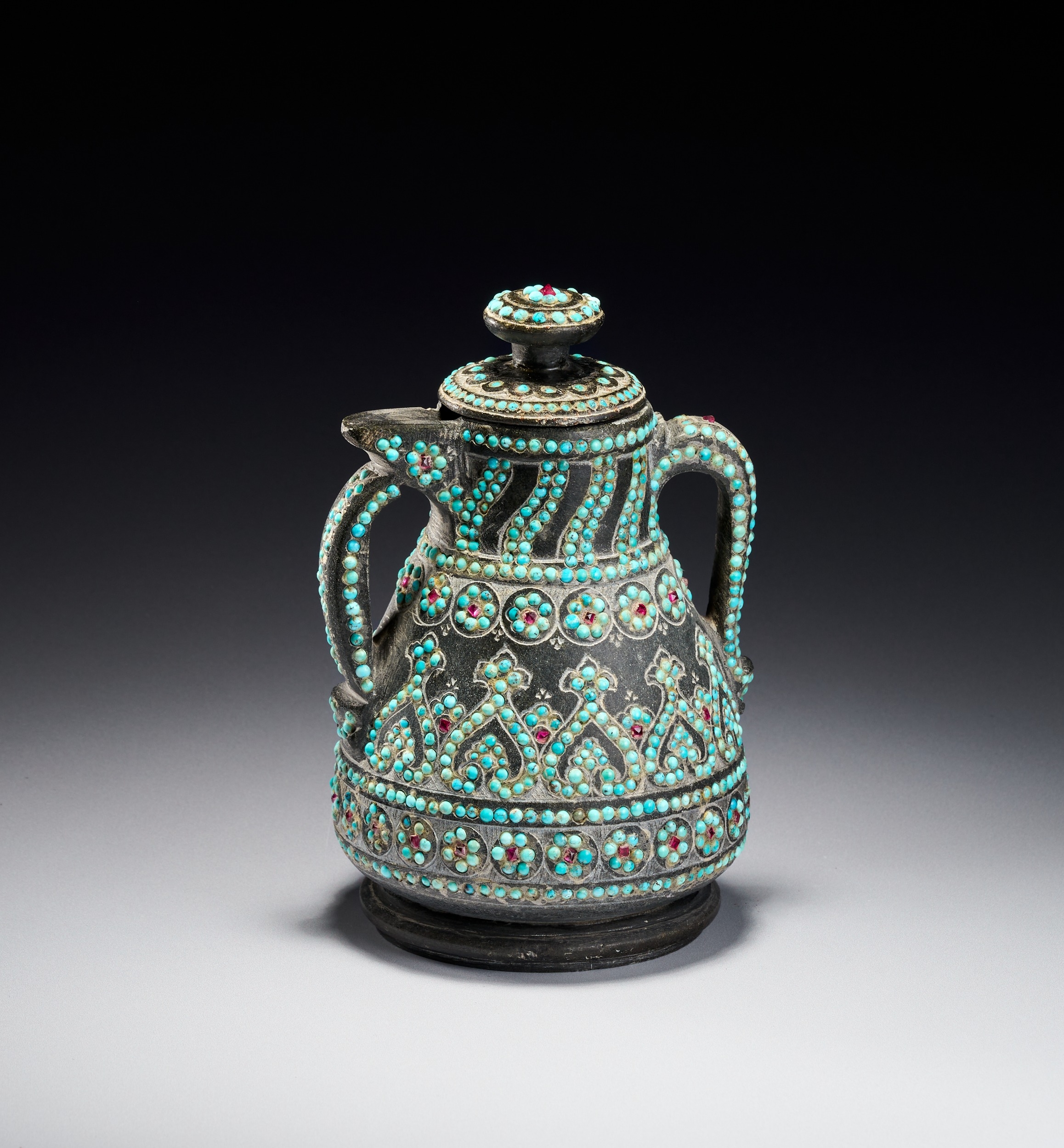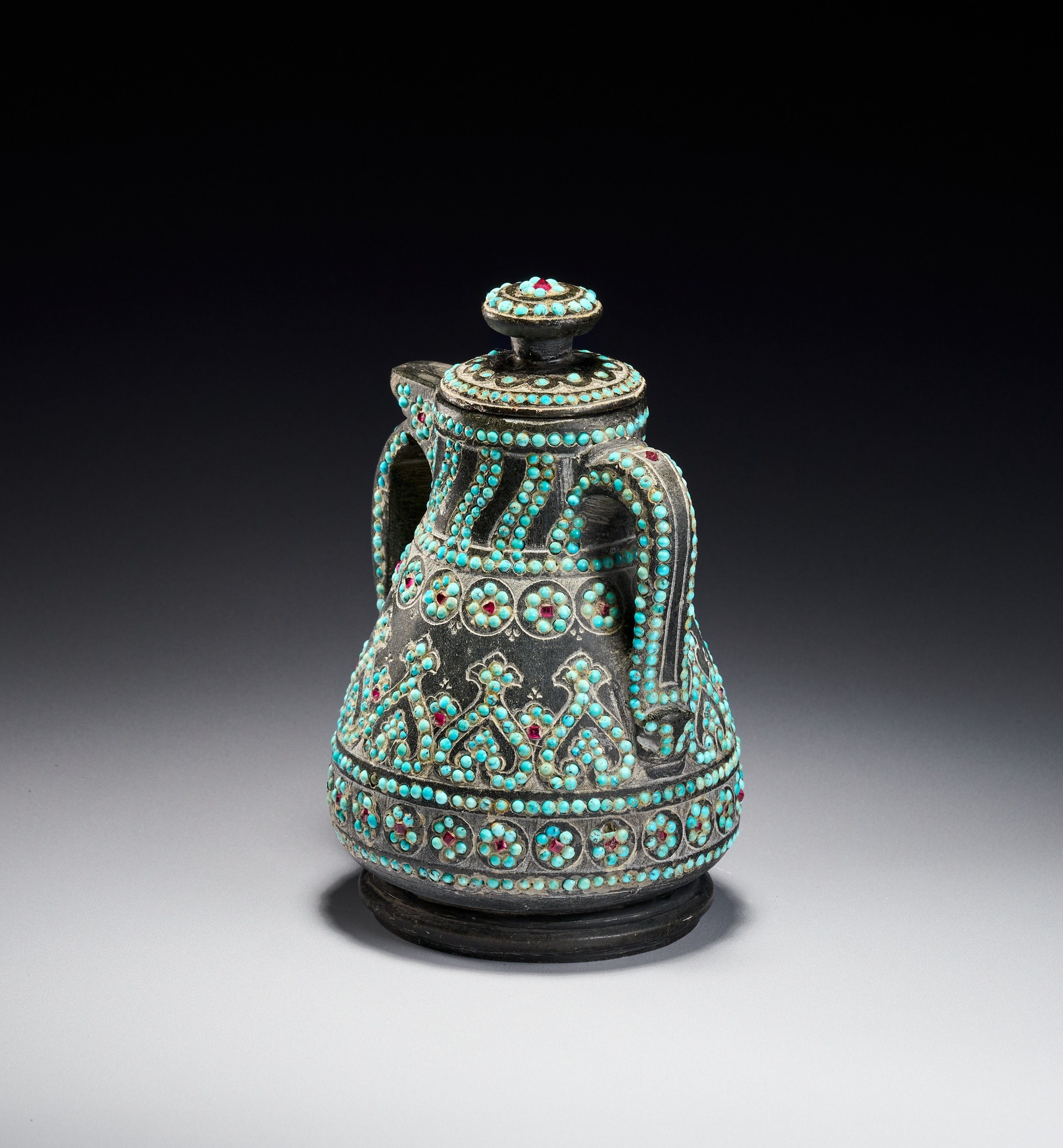 The vessel is carved from a dark hardstone, such as chlorite or soapstone, and features a matte patina. The body is heavily ornamented with inset gemstone cabochons, including turquoise and small red stones, possibly rubies or garnets. The construction includes two curved handles and a short, integrated spout. The decoration consists of fine incised scrolling and geometric patterns. The lid is topped with a central red stone surrounded by concentric rings of turquoise. The neck displays slanting bands of turquoise dots, while the shoulder and lower body feature registers of circular floral rosettes centered with red stones. The main body is adorned with a wide repeating band of interlocking palmette motifs densely filled with turquoise.