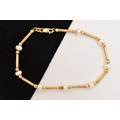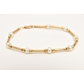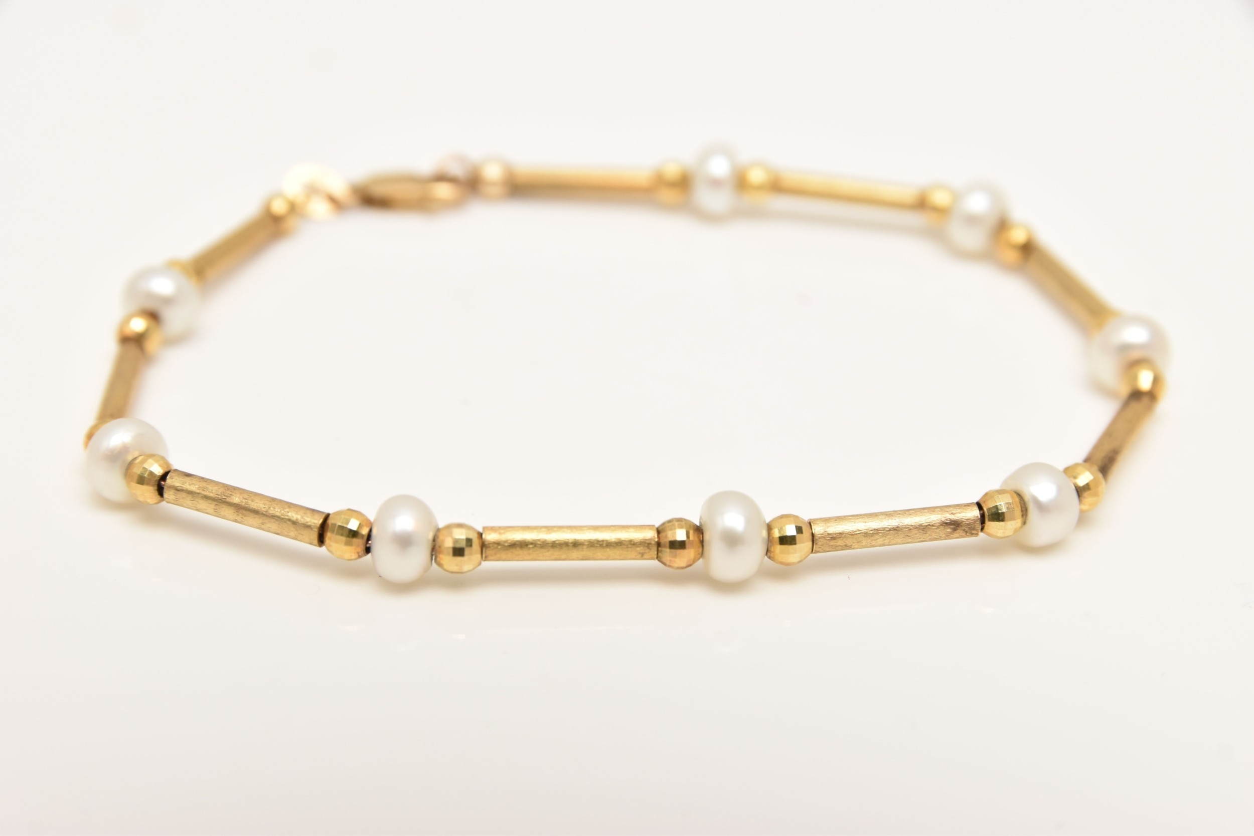A 9CT GOLD BRACELET, designed as eight cultured pearls interspaced between faceted ball and cylinder beads, fitted with a lobster clasp, approximate length 185mm, hallmarked 9ct Sheffield, approximate gross weight 4.6 grams, (condition report: general moderate wear, overall condition good)