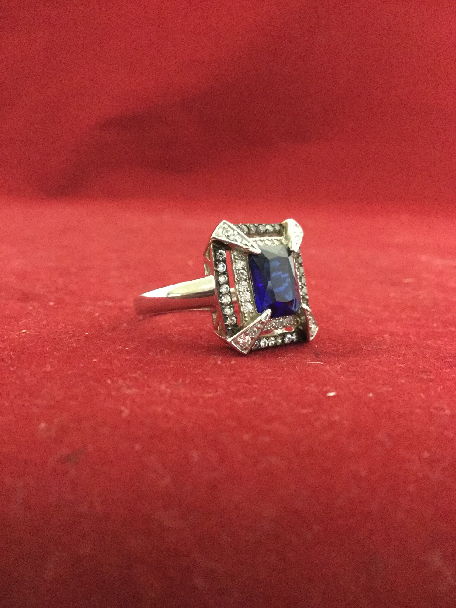 A silver CZ and sapphire cluster ring -