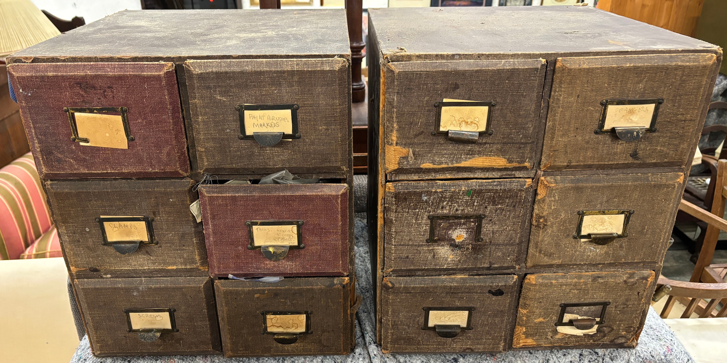 Two canvas clad pine sets of six drawers containing a quantity of vintage tools and fittings, each 38x43x41cmH