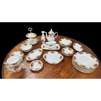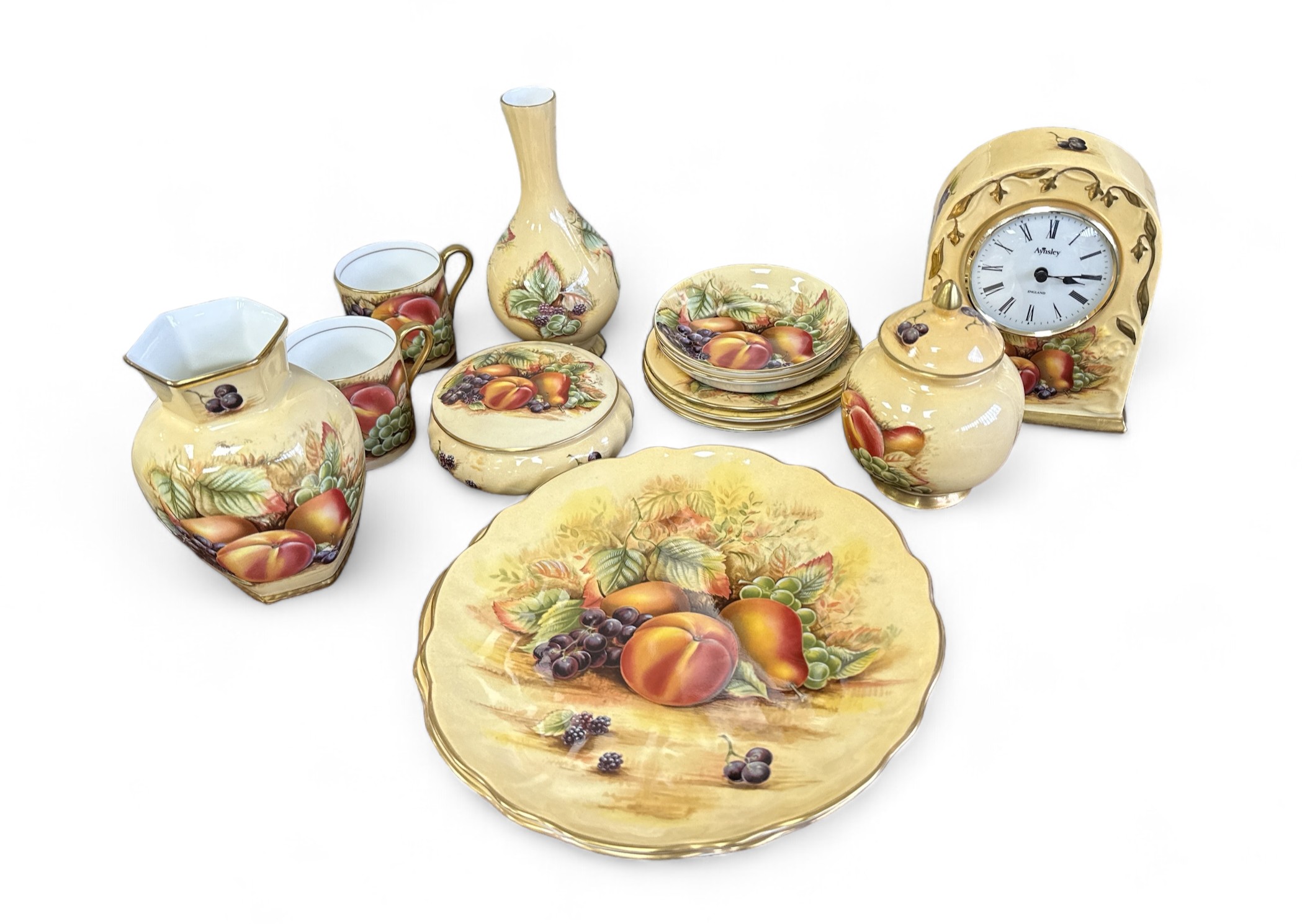 Aynsley Orchard Gold collection (14 pieces), to include 2 x plates (21cm), a clock (15cm), a vase (13cm), a posy vase (16cm), 2 x coffee cups with 3 x saucers, 2 x lidded bowls and 2 x small plates (11cm).