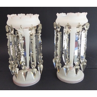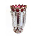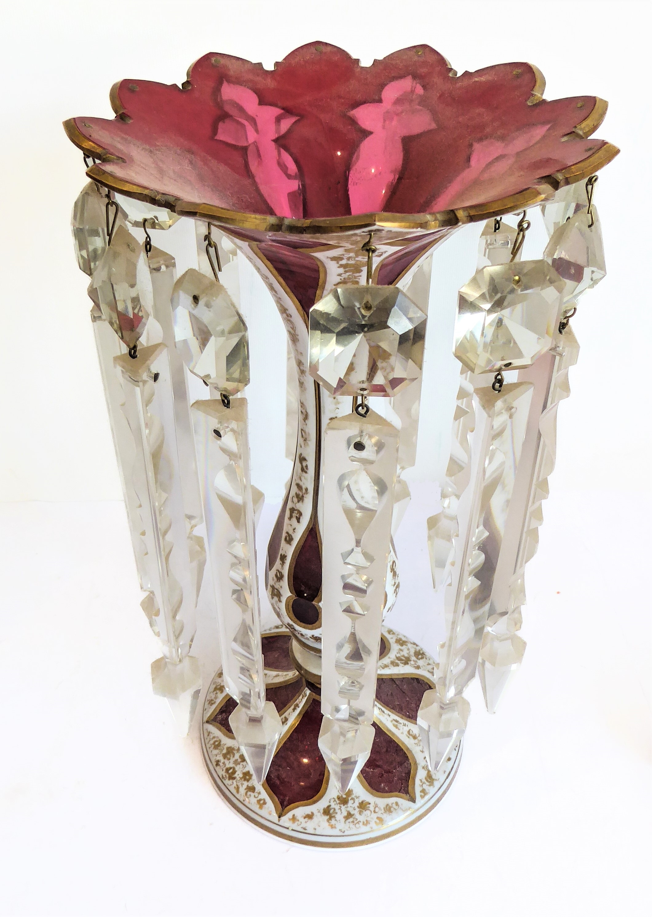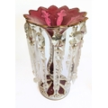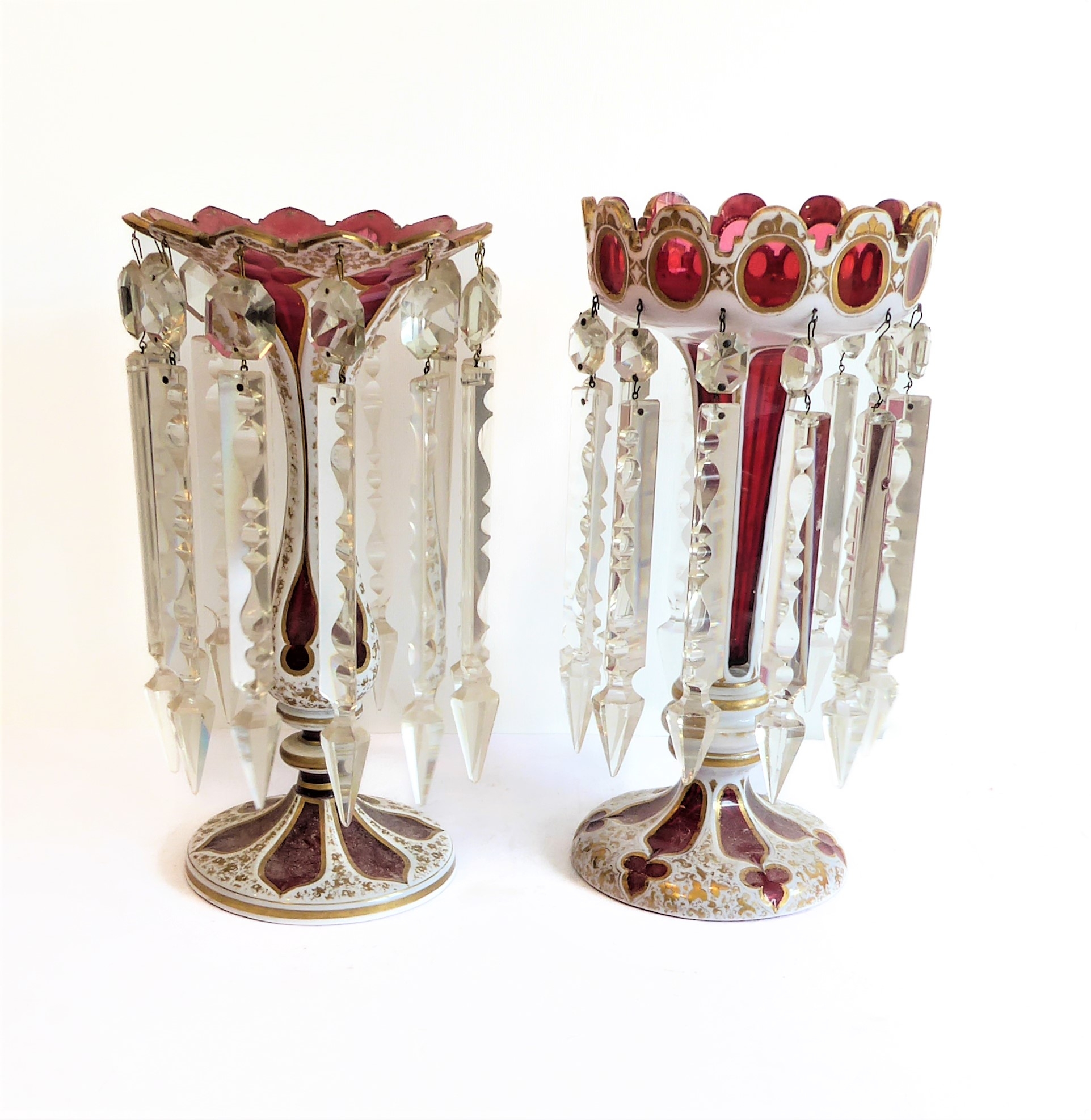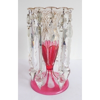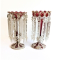 Two large and similar 19th century cranberry table lustres: cameo cut; long glass droplets; circular feet. (The (slightly) taller 32.5 cm high)
