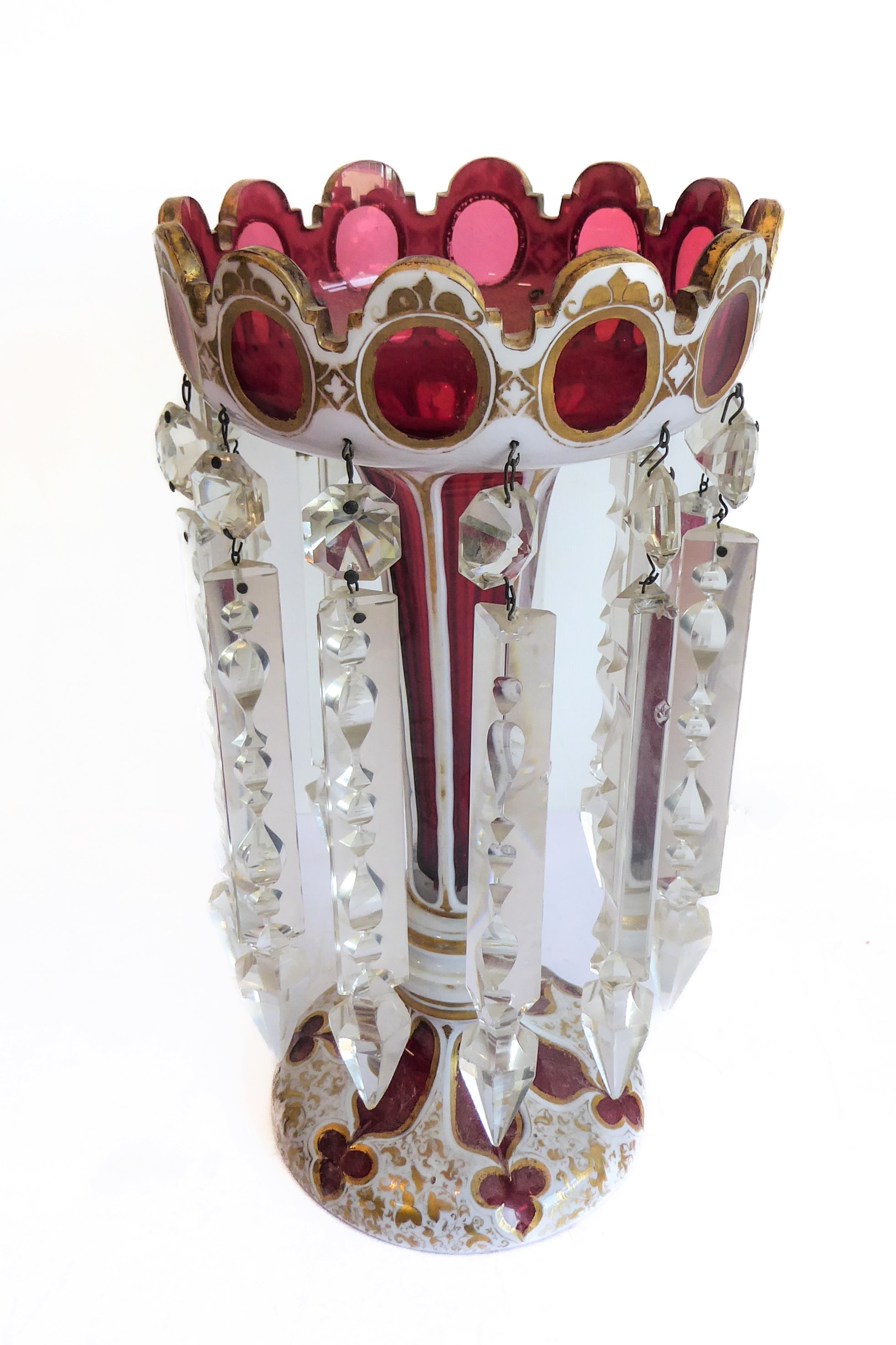 Condition Report: These items are similar but they are NOT a pair. The one with the baluster stem exhibits minor gilt rubbing to the decoration. Both are very dirty. The droplets look in good condition with no major cracks , chips or restorations. The other with a trumpet-shaped stem also has minor gilt rubbing but also in good overall condition with all droplets present.