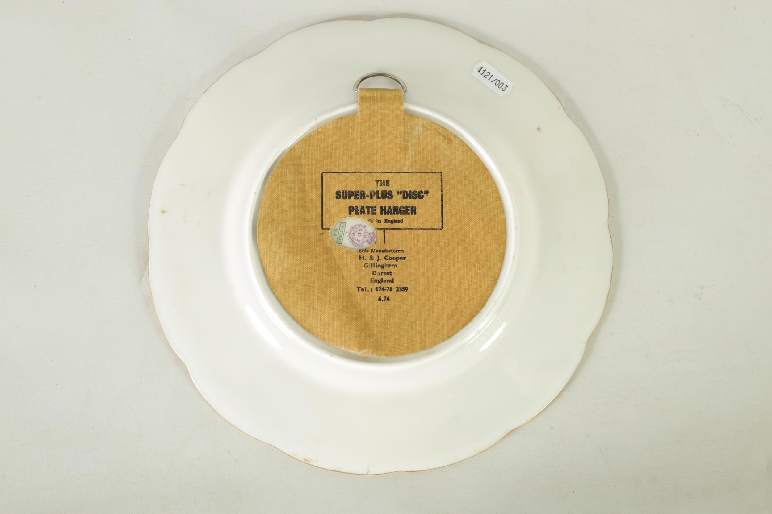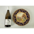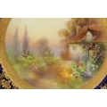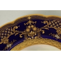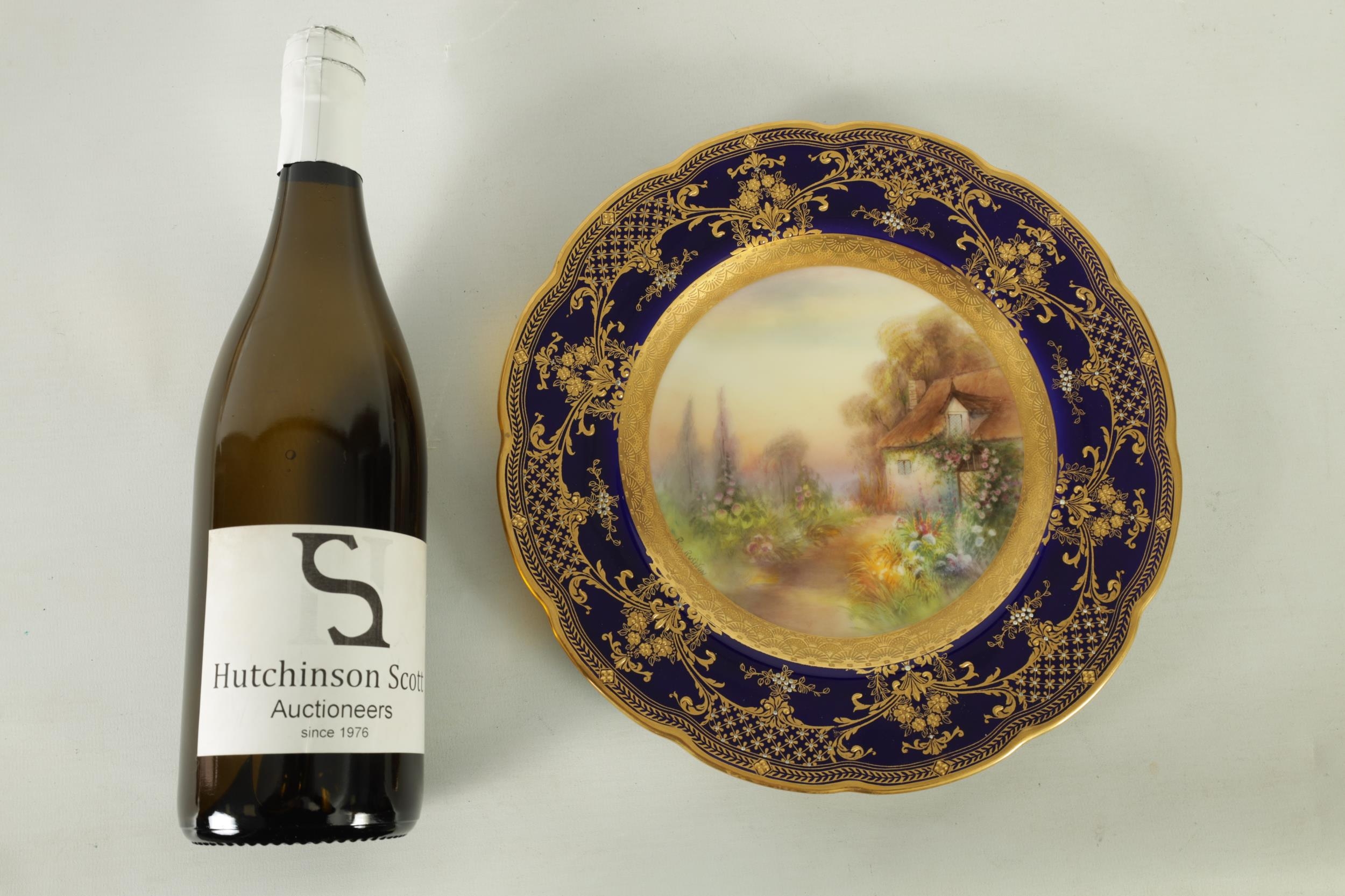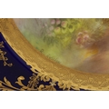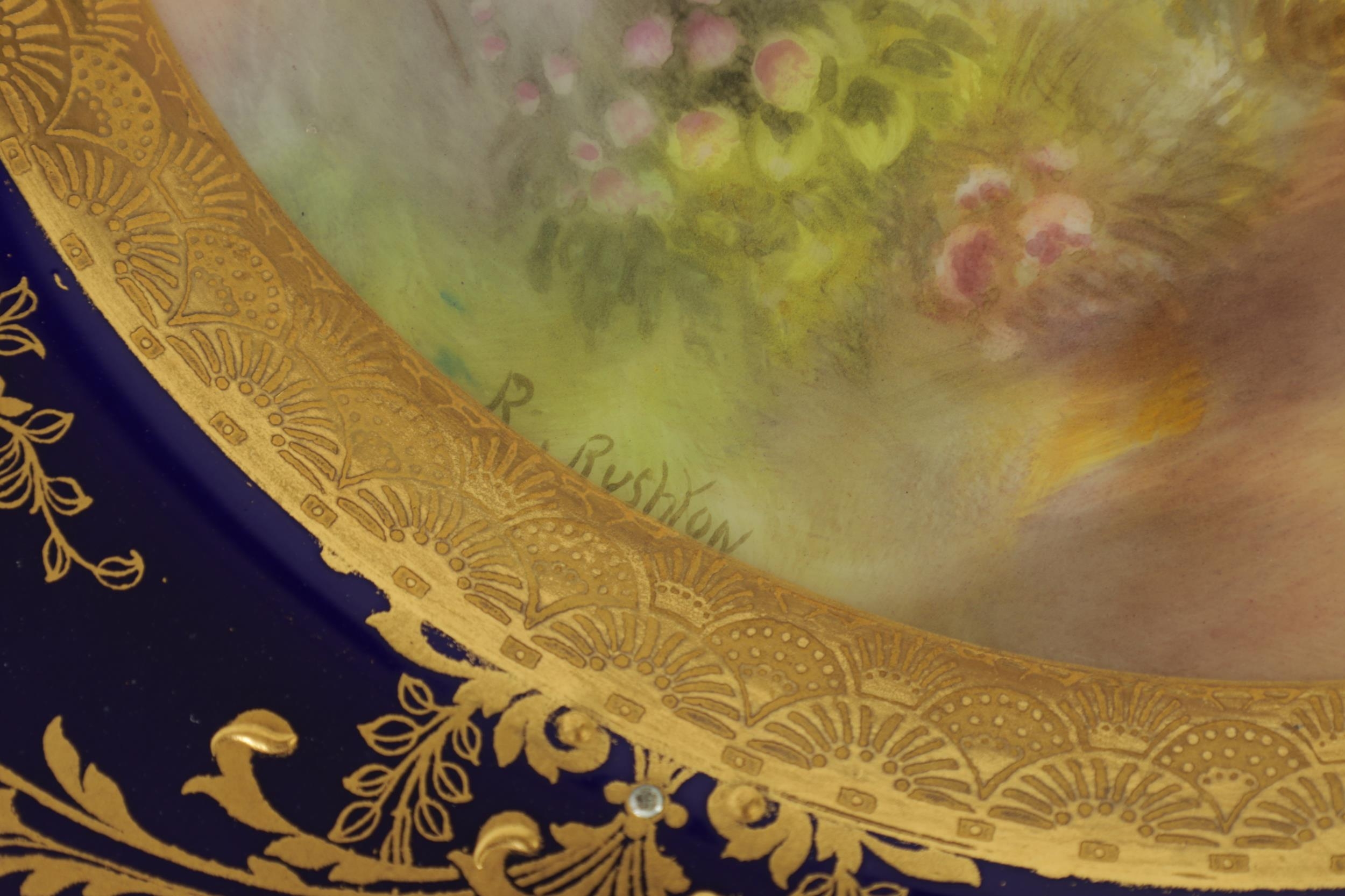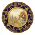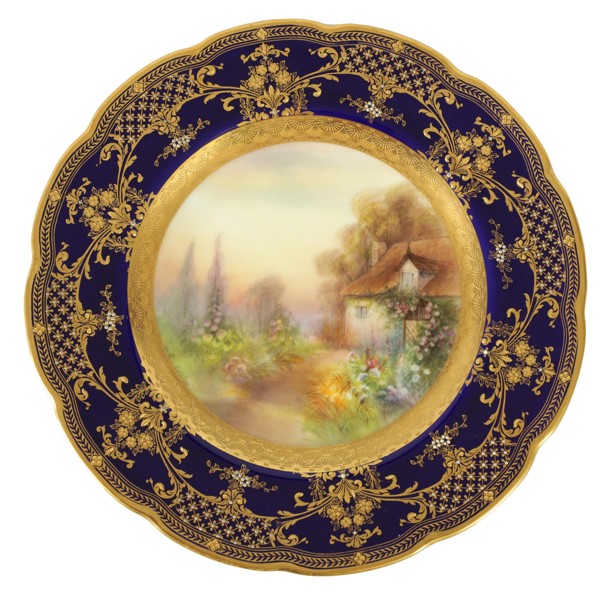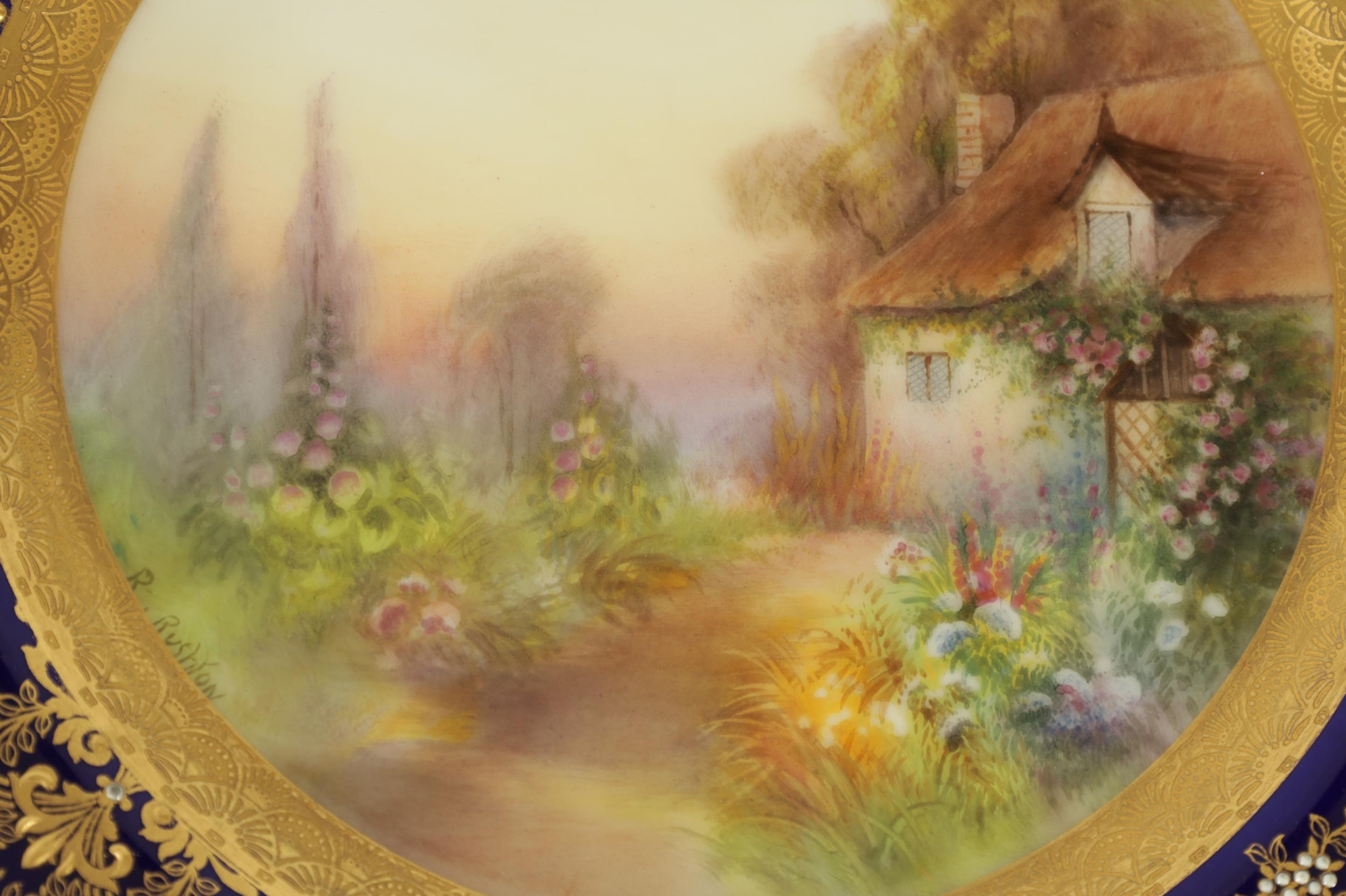 A ROYAL WORCESTER CABINET PLATE PAINTED BY R RUSHTON the scalloped richly gilt Royal Blue border with raised floral and leafwork sprays within hatched outer panels enclosing a painted summertime view of a thatched country cottage garden scene - signed, printed puce marke and date code for 1918. (26.5cm diameter)