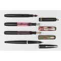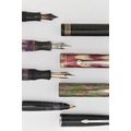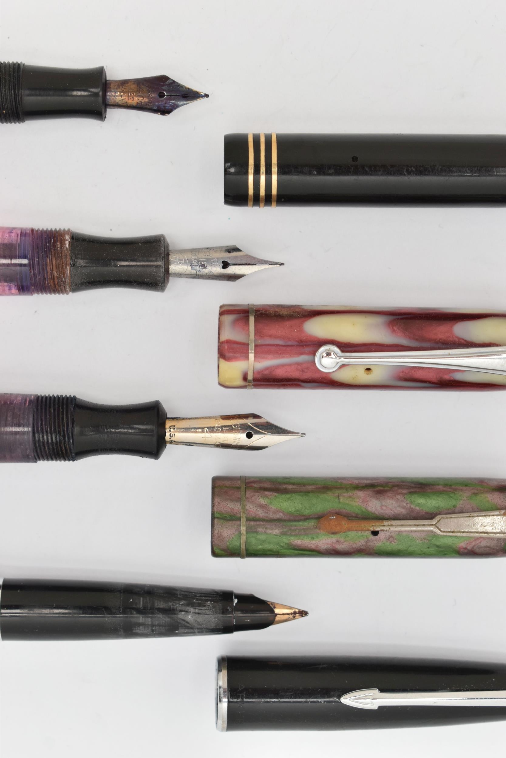FOUR PENS, to include two Platignum Visi-ink pens with marble effect lids, a Parker fountain pen, a further fountain pen, nib stamped 14ct