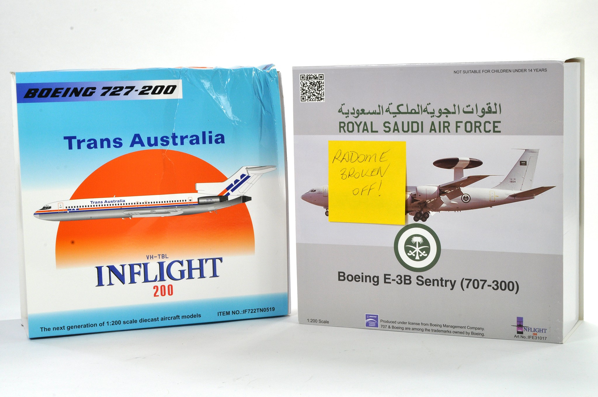 Diecast Model Aircraft Duo comprising Inflight 1/200 Boeing 727-200 Trans Australia, no damage recorded by vendor, box has wear plus Boeing E3 Sentry Saudi Air Force, Dome broken off. Otherwise assumed, (but with no guarantee) generally excellent ex-shop / Factory return. Further images can be provided if necessary.