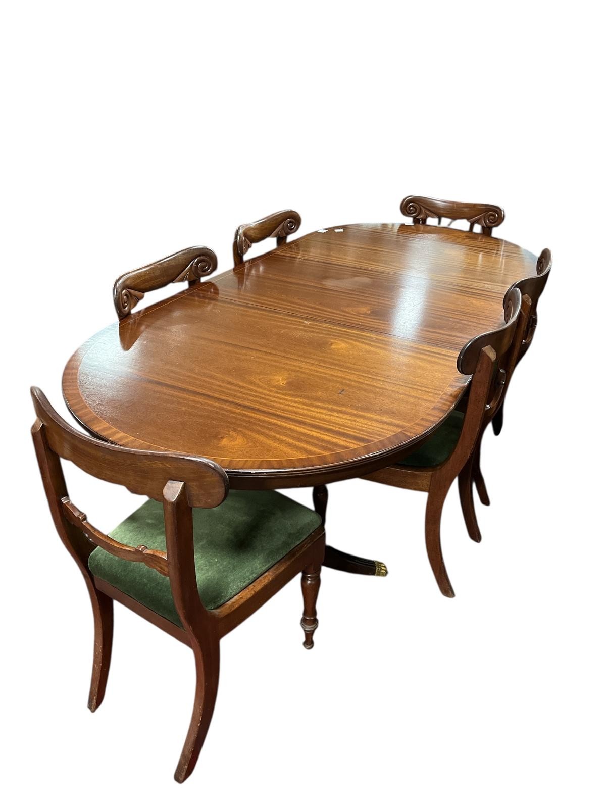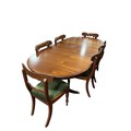 A SEVEN PIECE MAHOGANY DINING ROOM SUITE comprising a set of six Victorian mahogany chairs each with a carved top rail and splat with upholstered drop in seats on baluster legs the dining table of rectangular outline with rounded ends and one loose leaf raised on twin tripod supports with brass caps and castors 75cm (h) x fully extended 216cm (l) x 99cm (w) Loose leaf 55cm (w)