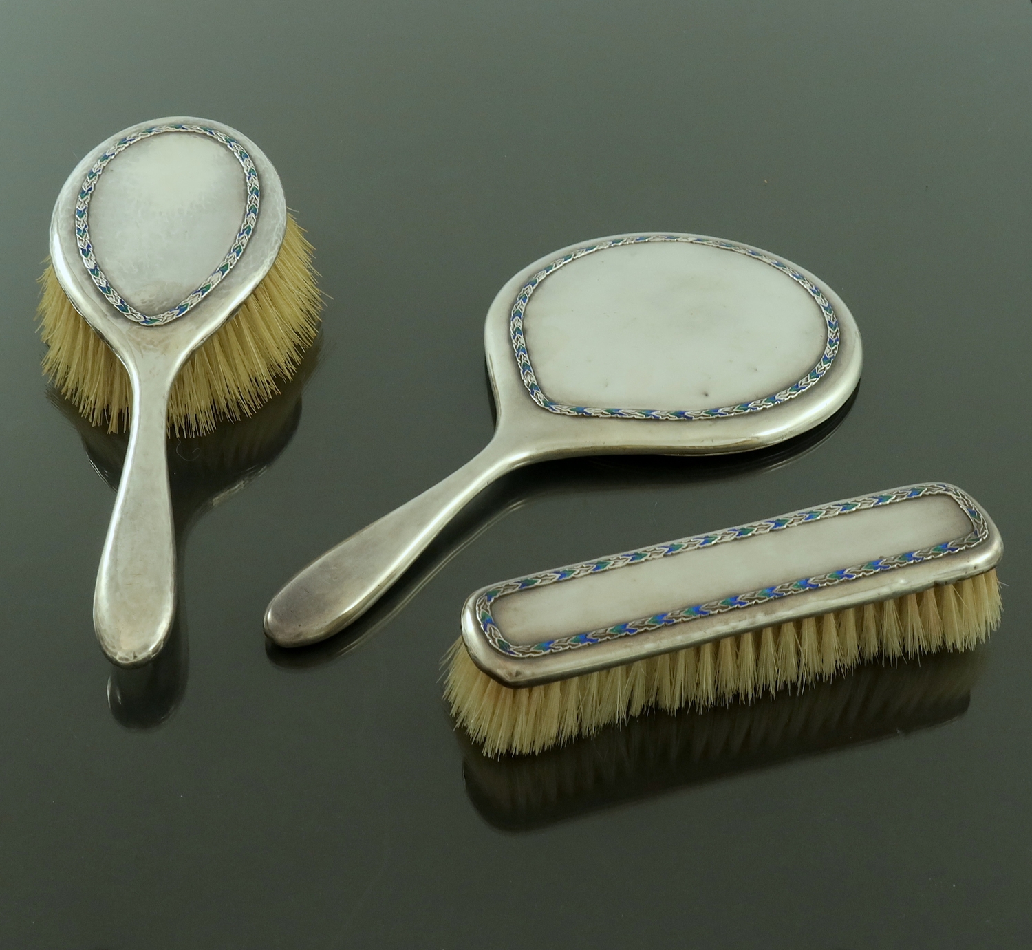 Bernard Cuzner for Liberty and Co., an Arts and Crafts silver and enamelled dressing table mirror and brush set, Birmingham 1913, each with a wreath of alternating blue green enamel and vacant leaf motifs, registration marks 50403, hand mirror 28cm long (3)