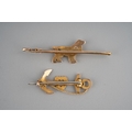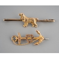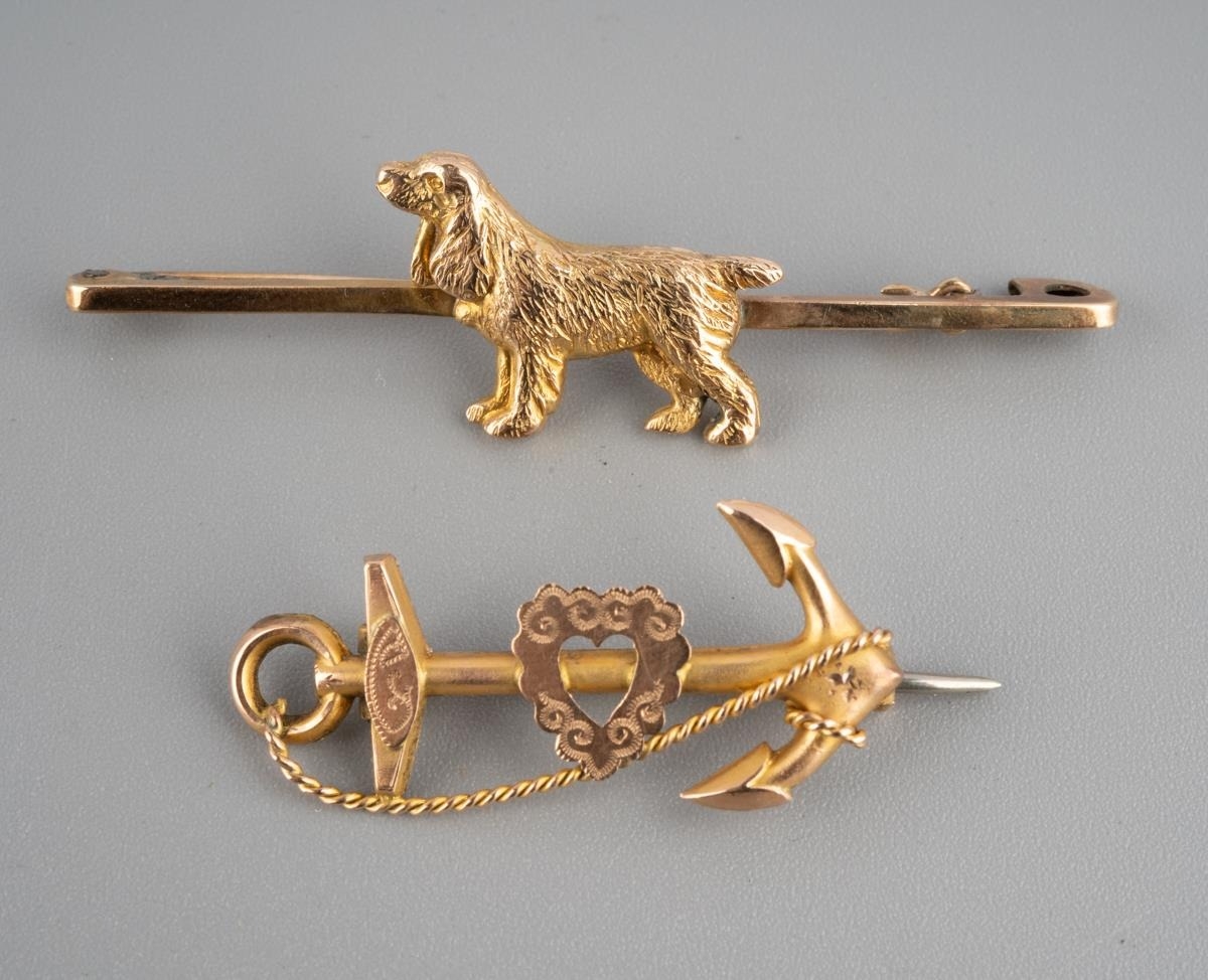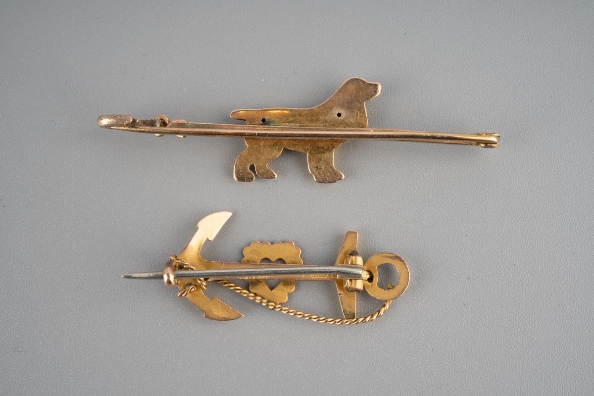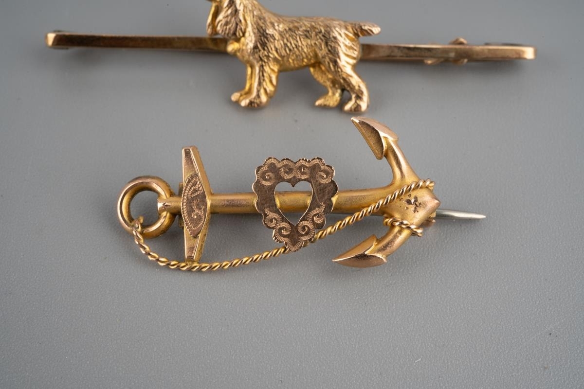 Two 9ct gold brooches to include bar brooch with a spaniel dog marked 9 ct and an anchor sweetheart brooch marked 375, gross total weight approx. 4.2g