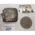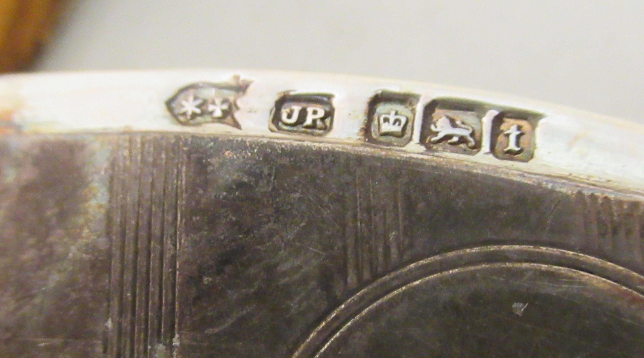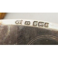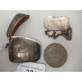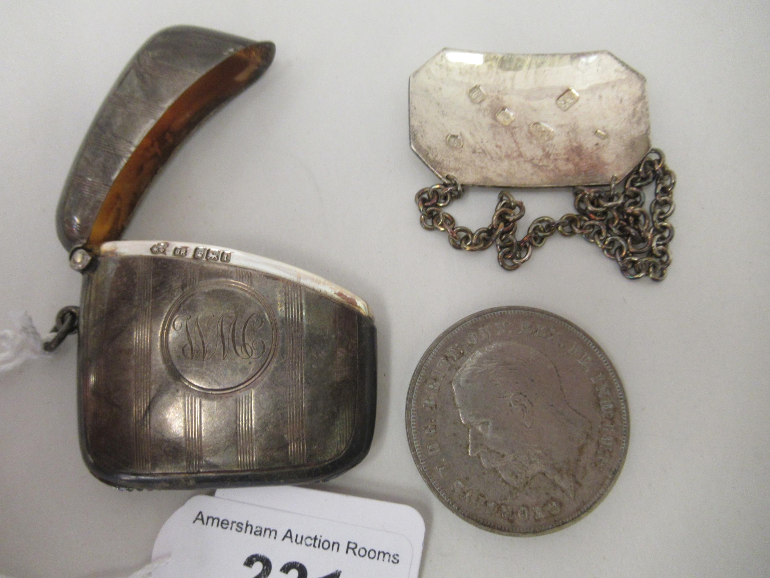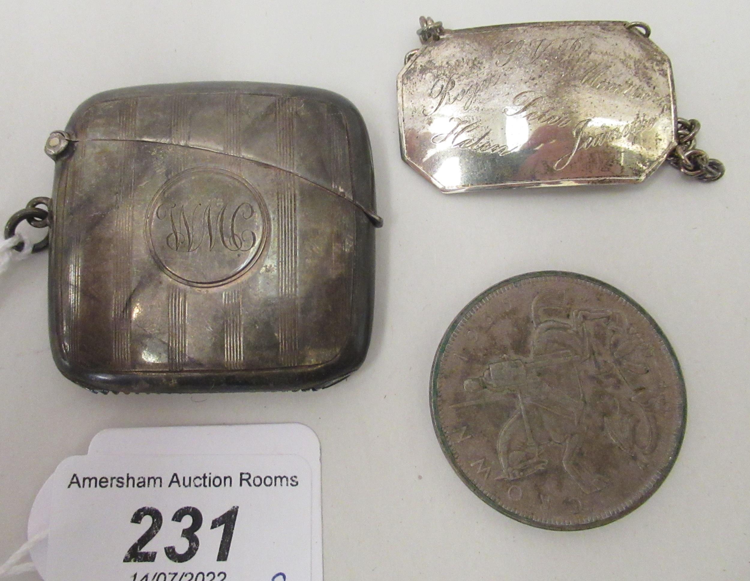 A silver vesta case with a strike plate, a pendant ring and hinged lid; and a silver wine label mixed marks