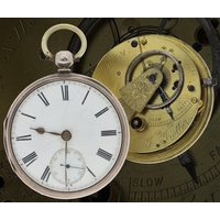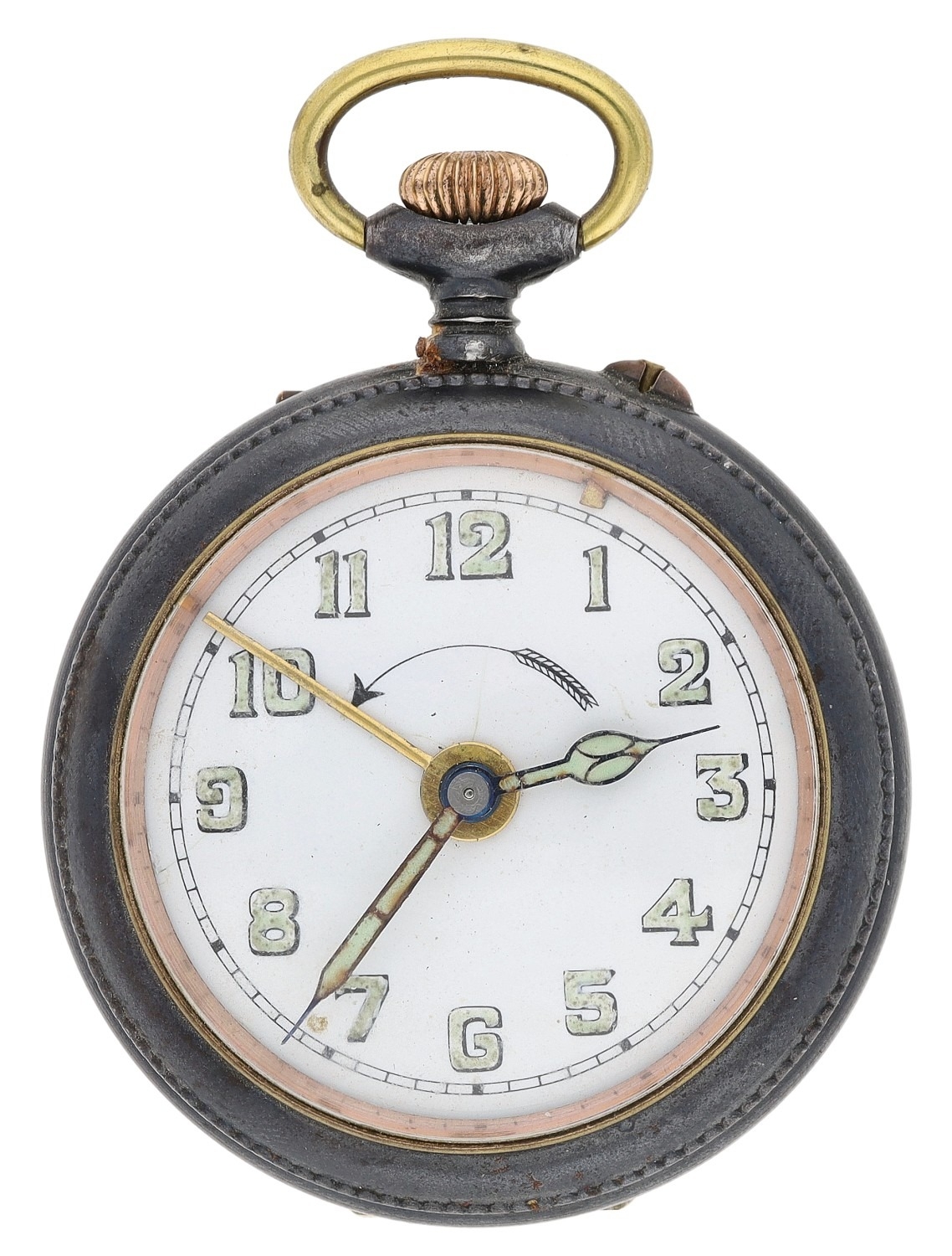 Swiss gunmetal alarm pocket watch, the dial with Arabic numerals, minute track and centre alarm indicator, rotating bezel with alarm minute indicator, Patent 41794, hinged case, 52mm