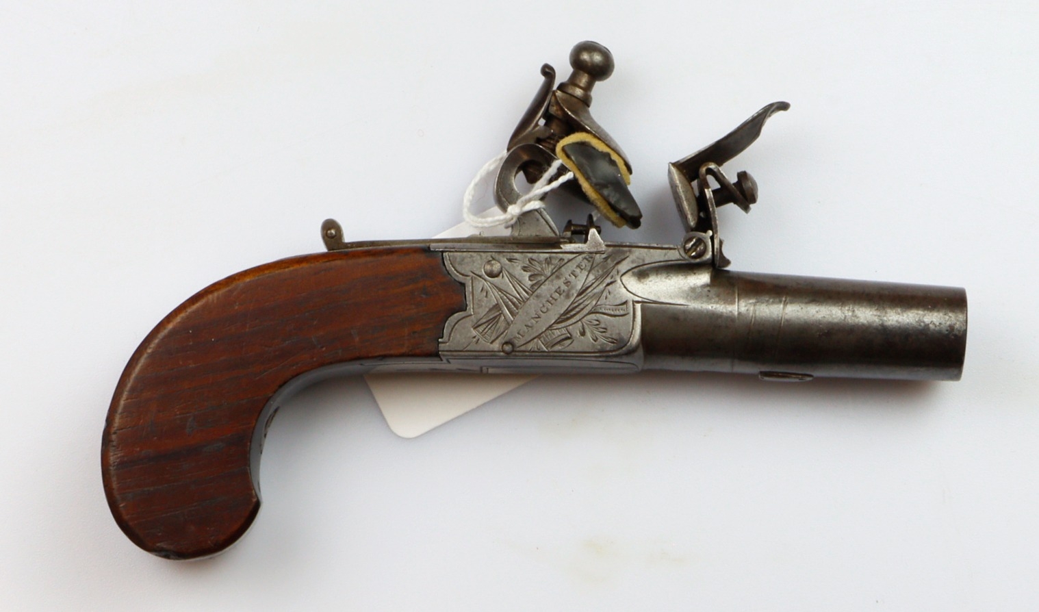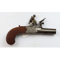 Flintlock Boxlock Pocket or Overcoat Pistol signed 'SHAW', early 19th Century, 42 bore 1 5/8 in. turn-off barrel, sharp, clear London proof-marks, border engraved action decorated with stands of arms signed 'SHAW' to one side and 'MANCHESTER' over, sliding safety, drop-down folding trigger, slab sided wooden butt with blank white metal oval wrist escutcheon, all elements operate correctly, crisp action, 6 in. length. William Shaw worked as a gunmaker in Manchester, circa 1810-1830.