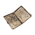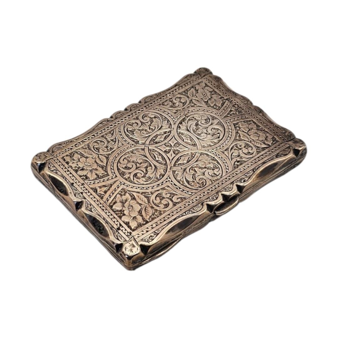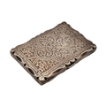 Hallmarked Birmingham, 1894, a Victorian card case style decorated extensively with engraved and chased scrolled leaf decoration with central shield cartouche to front, the reverse having similar decoration with additional floral and Celtic knot decorations.