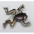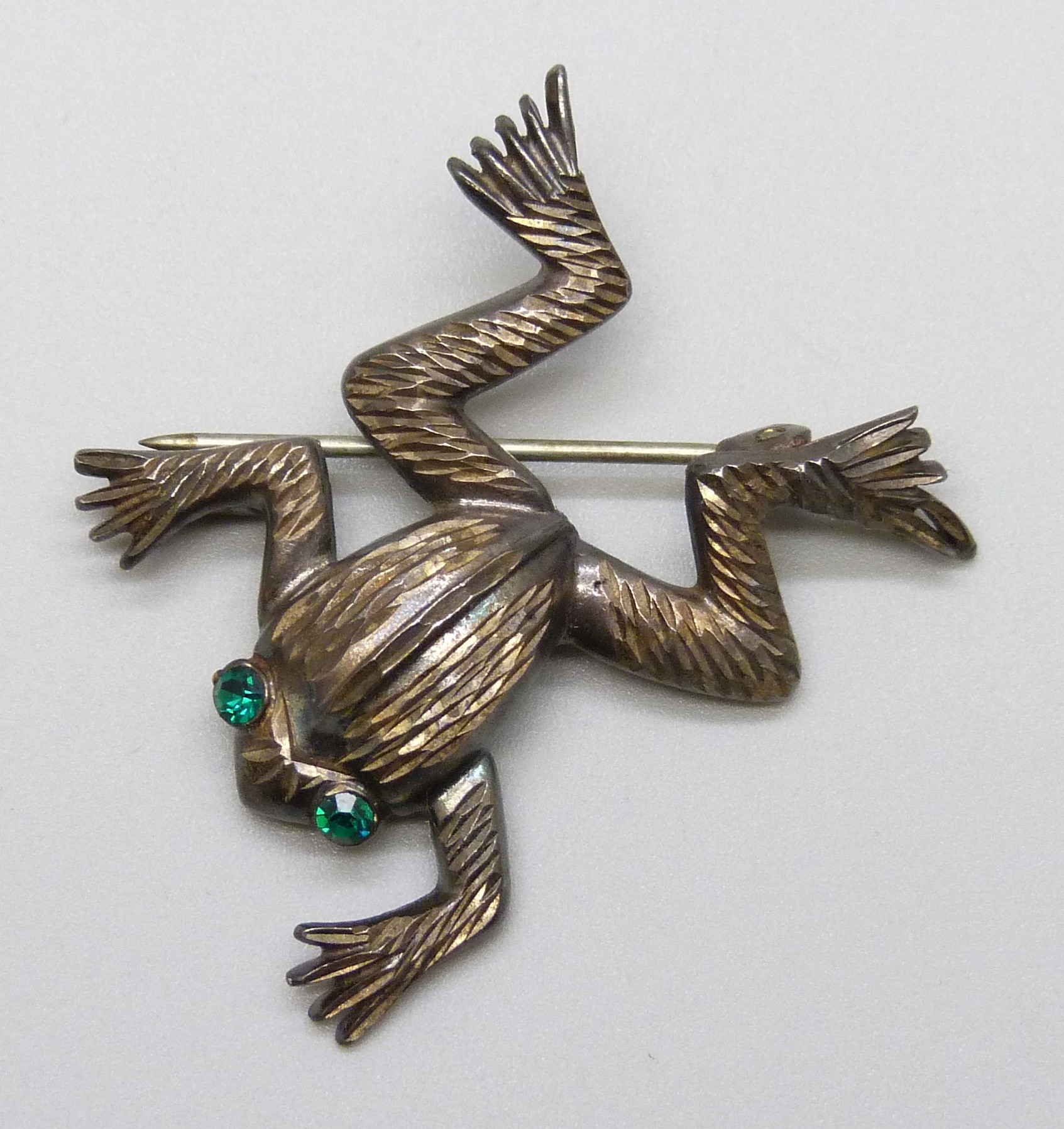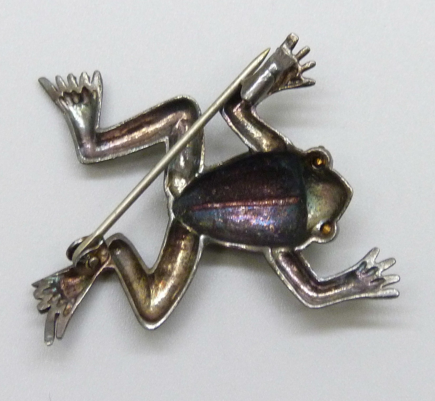 An Art Deco white metal brooch in the form of a frog set with green stone eyes, tests as silver, 3.7 x 2.9cm