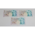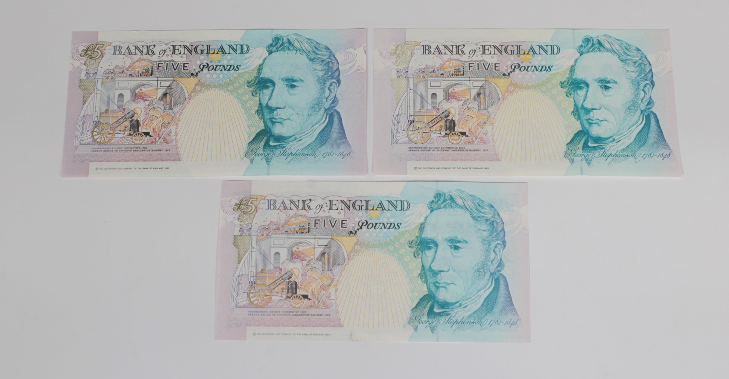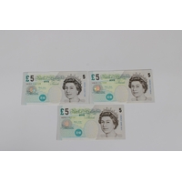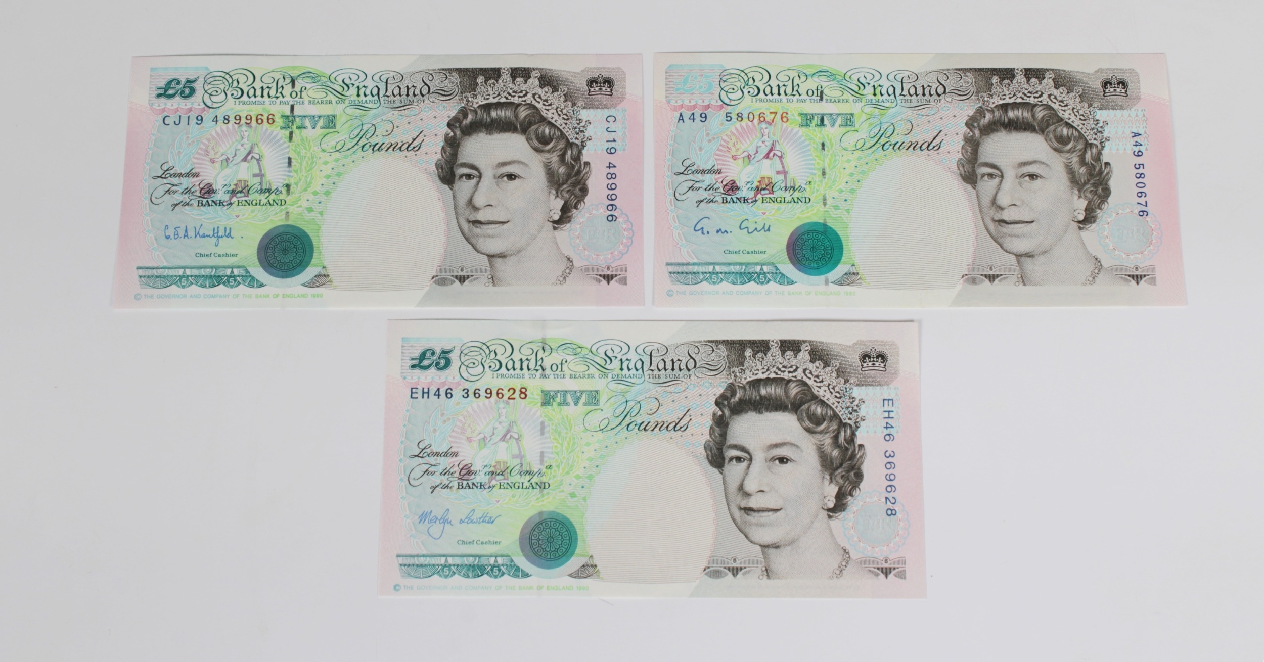 British Banknotes - Bank of England Five Pounds (3) c.1990, Signatory G. M. Gill, serial number A49 580676; c.1993, Signatory G. E. A. Kentfield, serial number CJ19 489966; c.1999, Signatory Merlyn Lowther, serial number EH46 369628, extra fine to about uncirculated. (3)