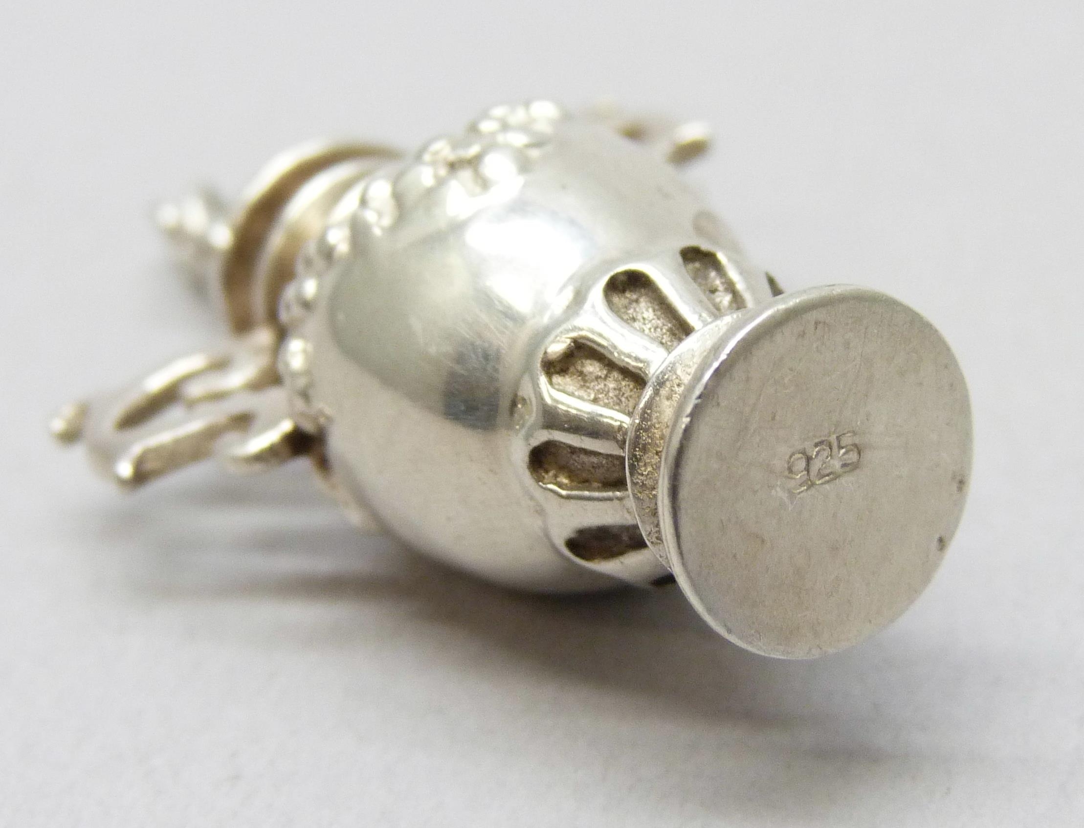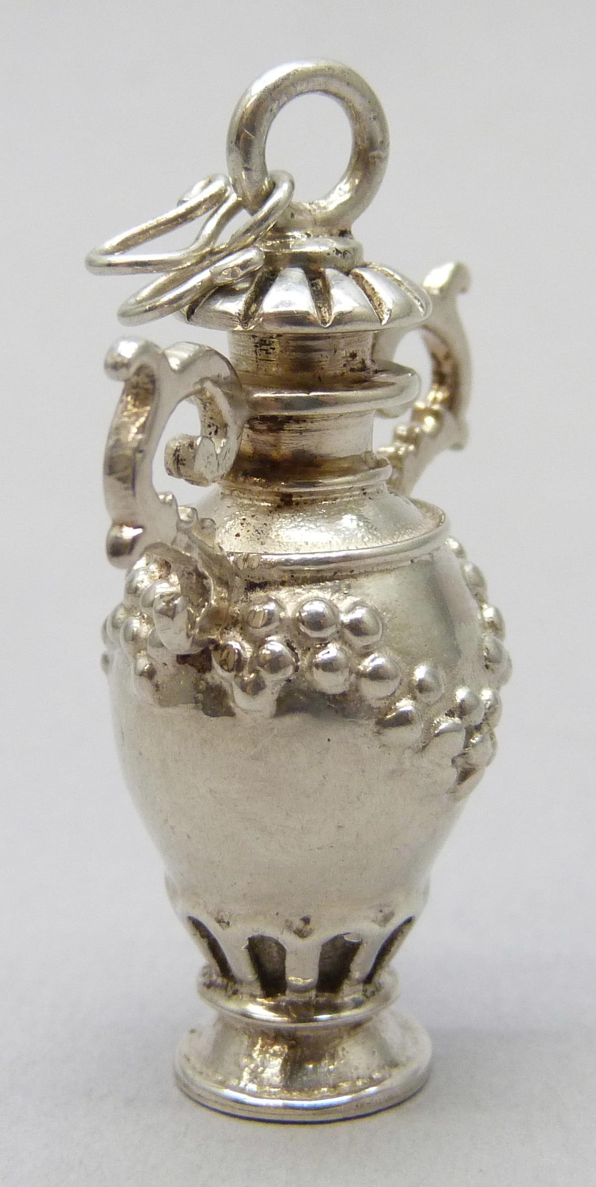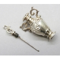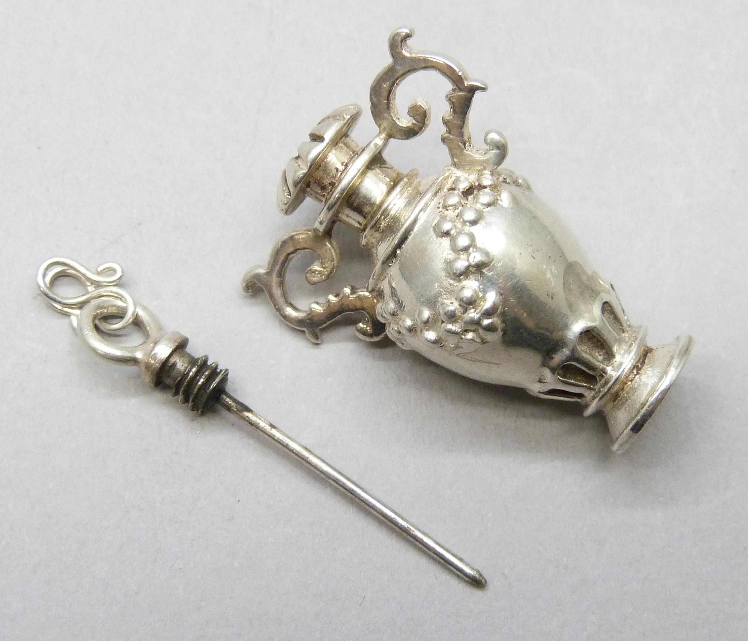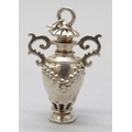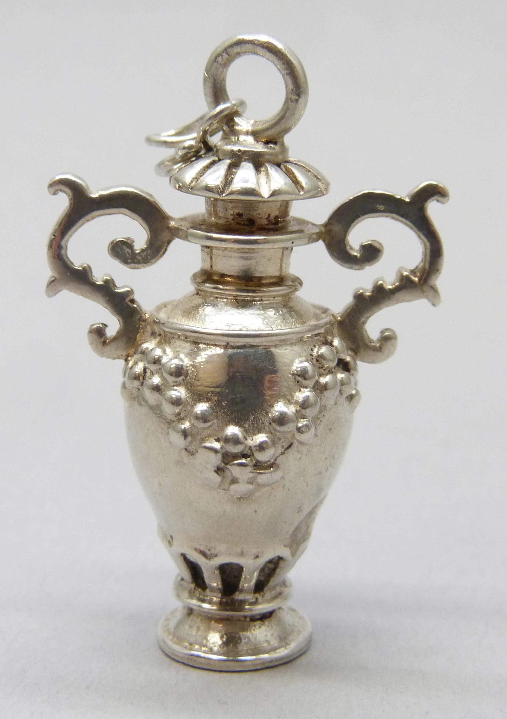 A silver perfume / scent bottle necklace pendant in the form of a two handled vase, 14g, 4.2cm including loop