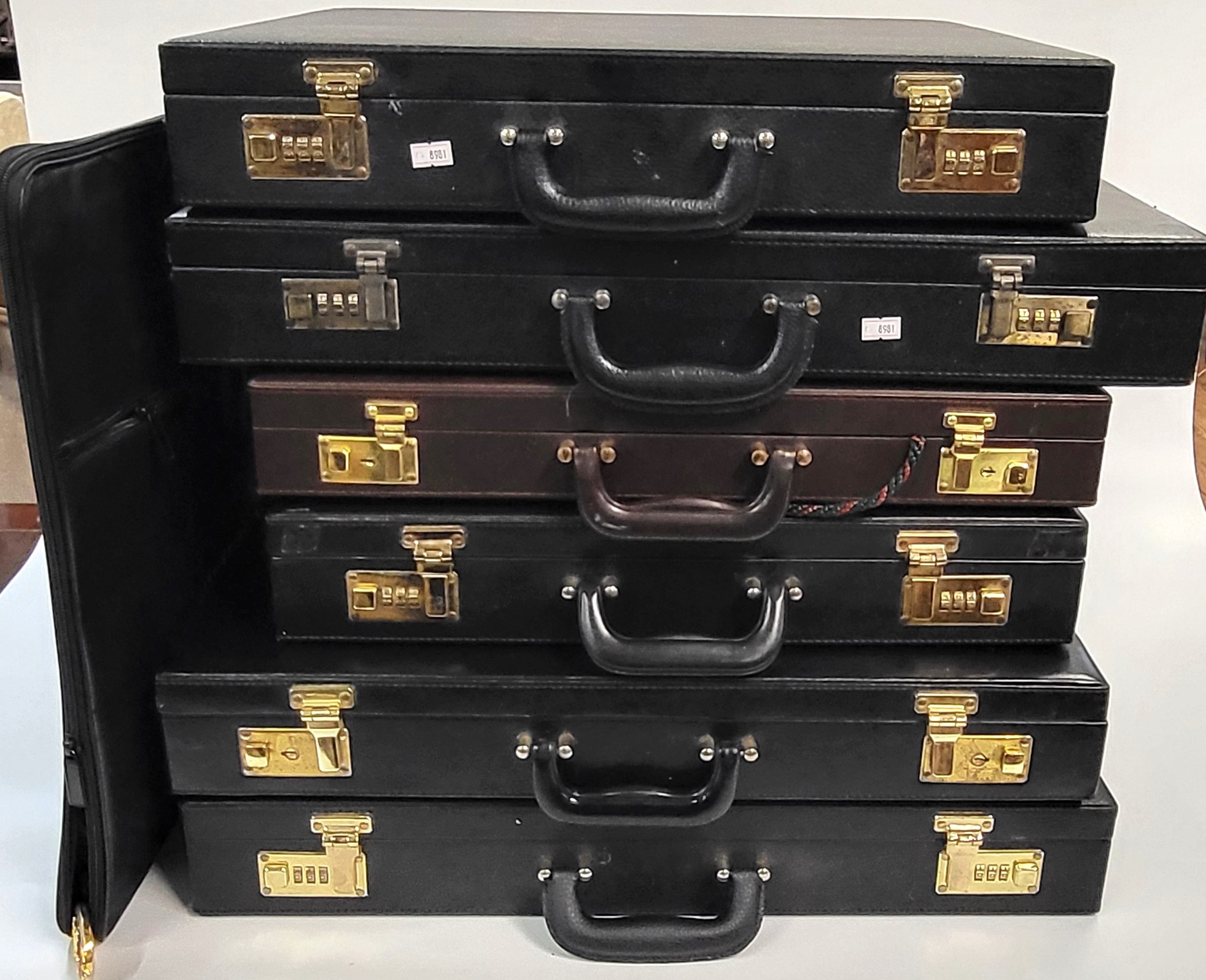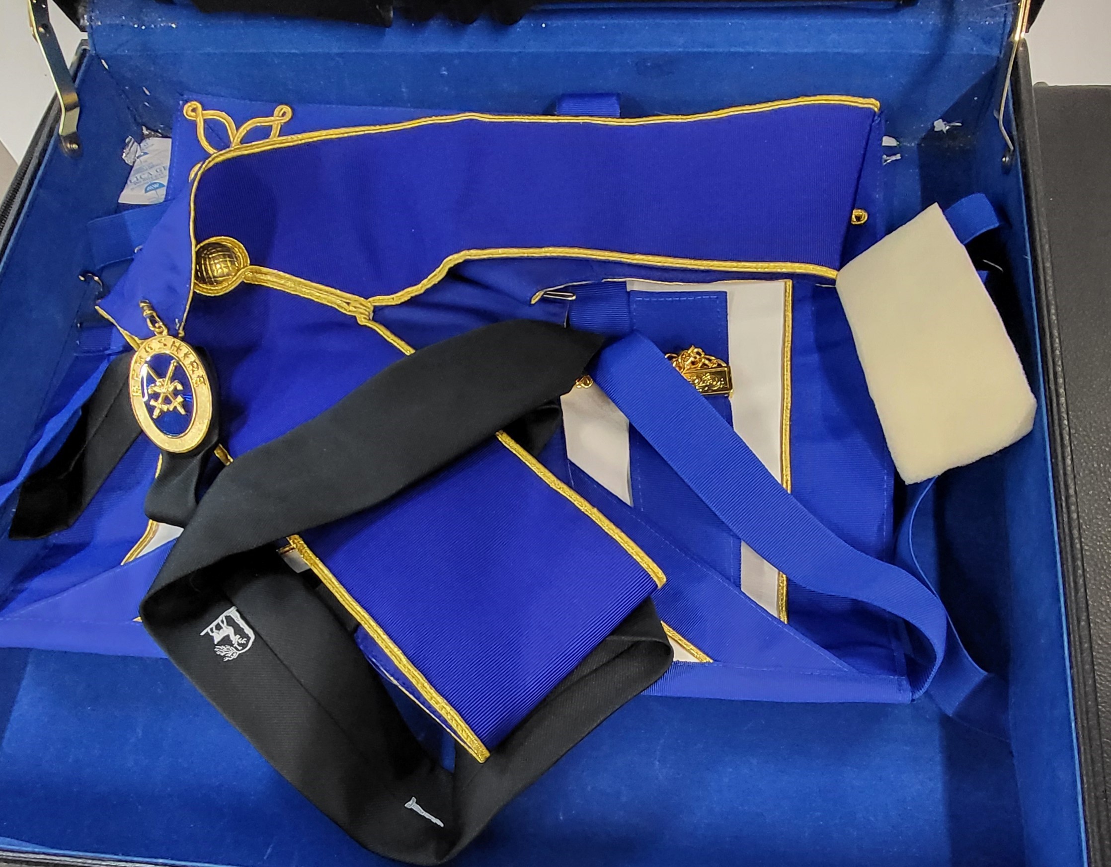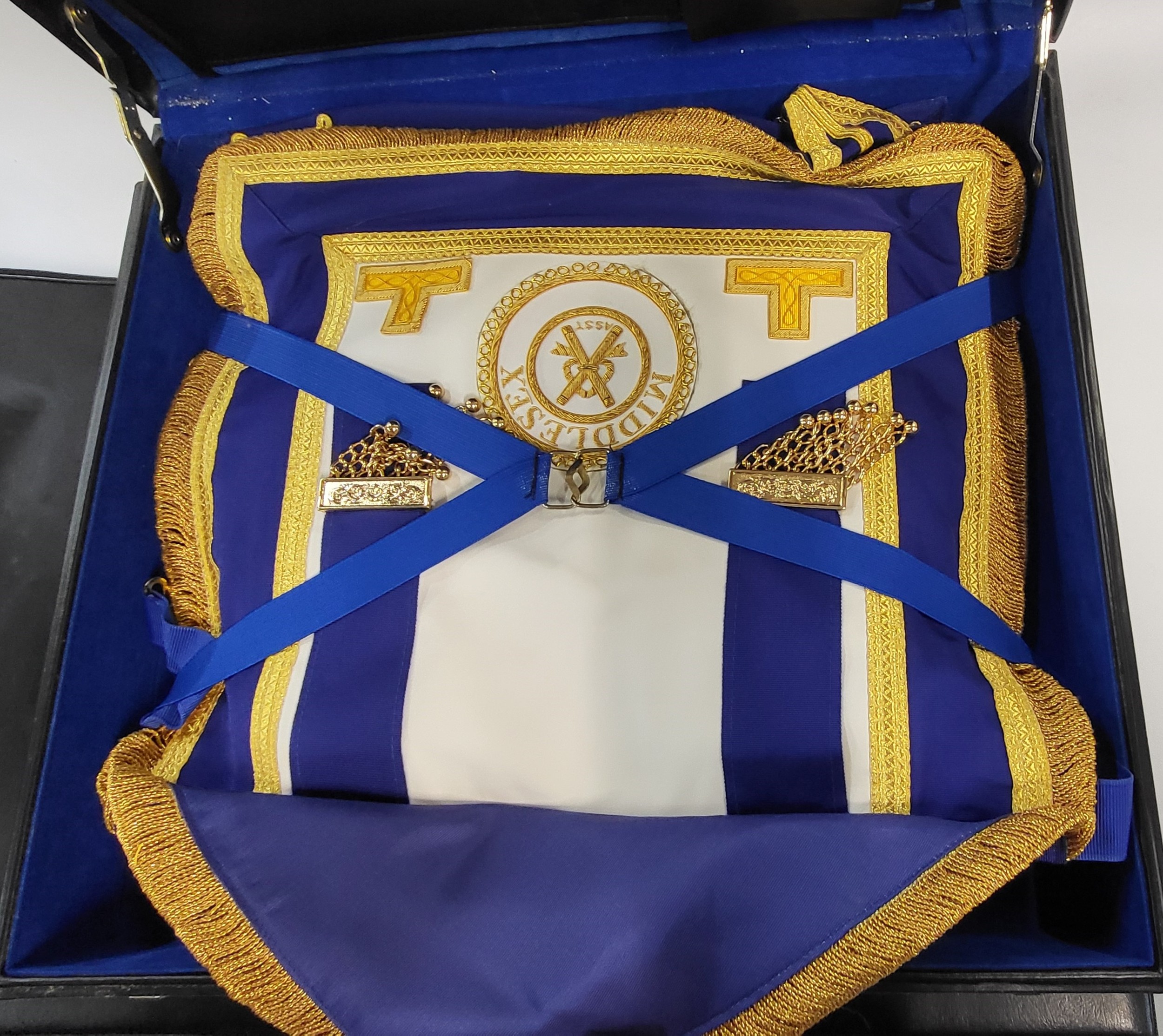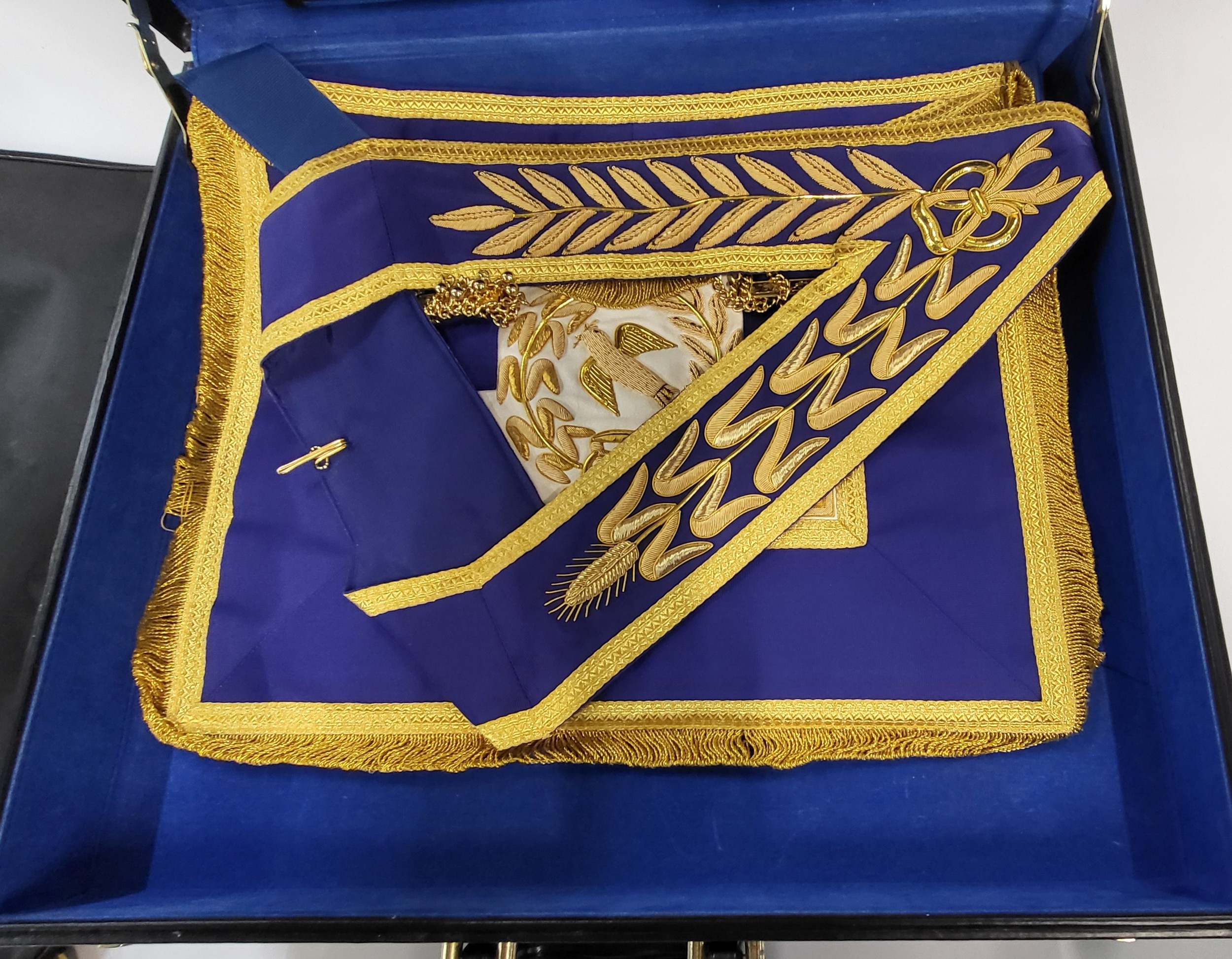 Seven Masonic apron cases containing eight aprons in total.