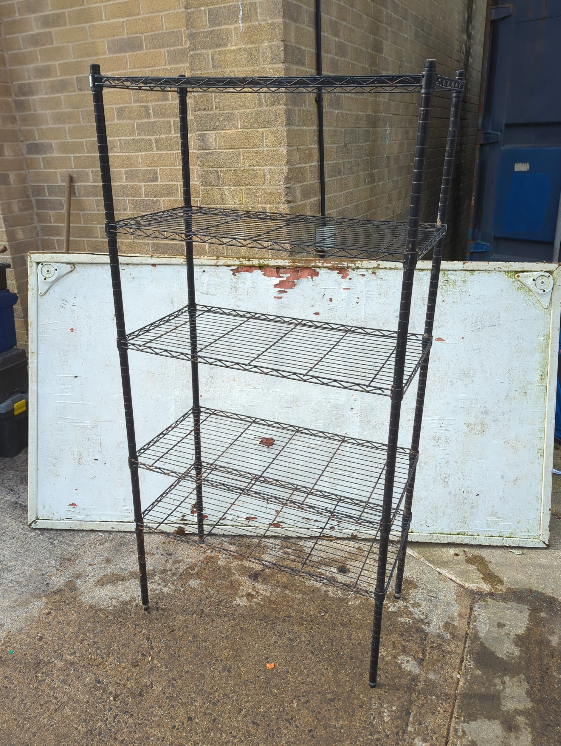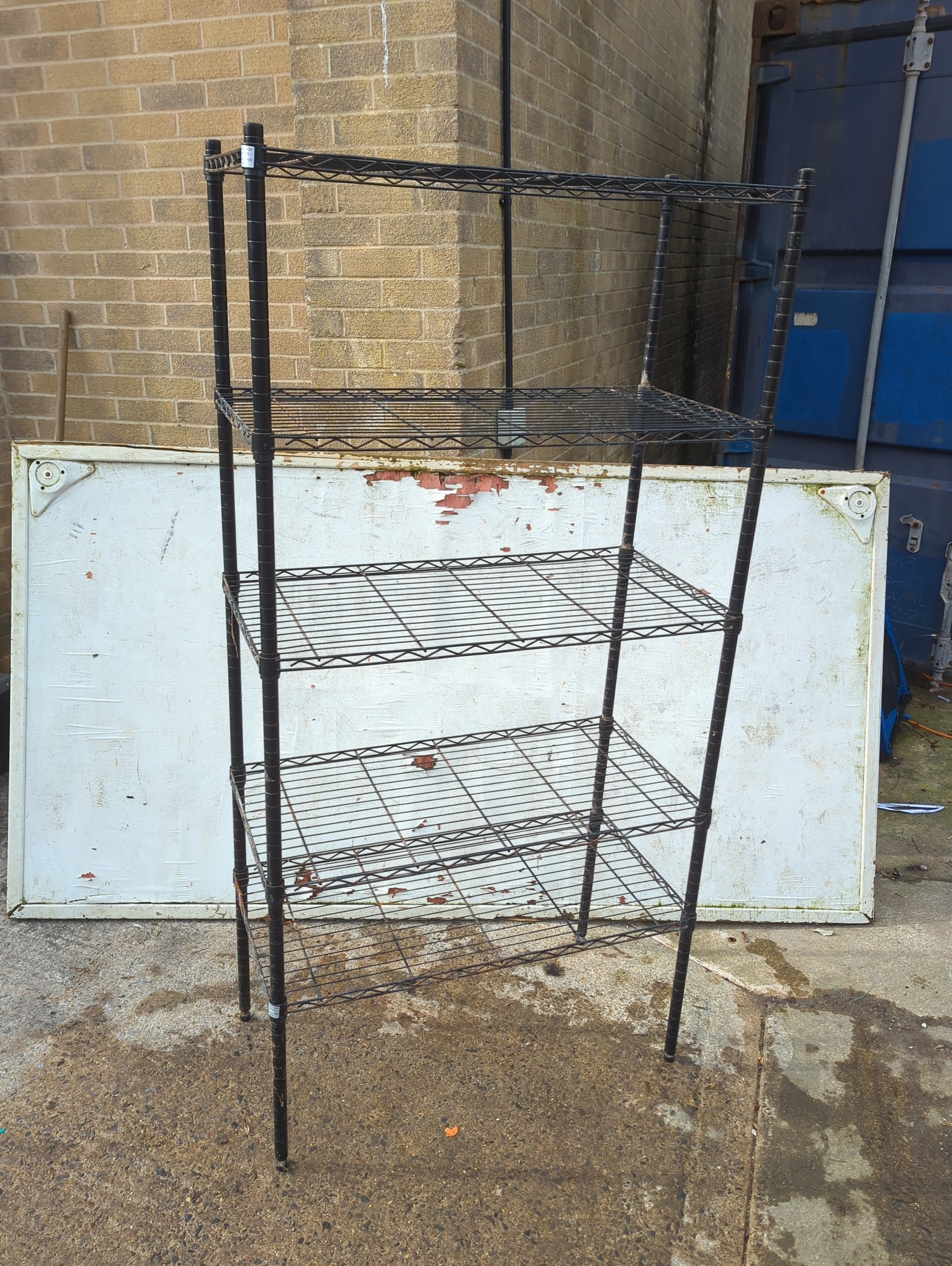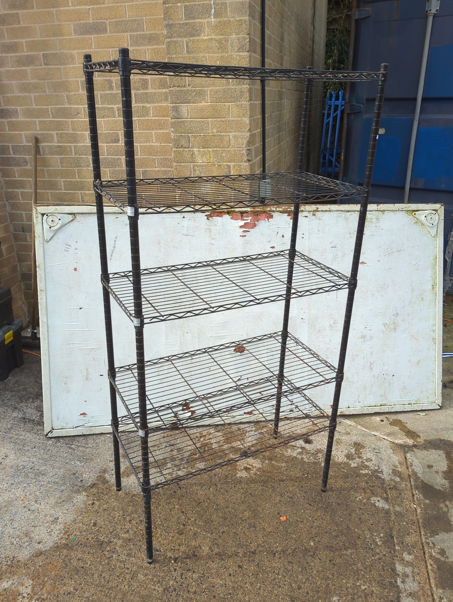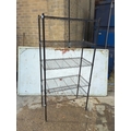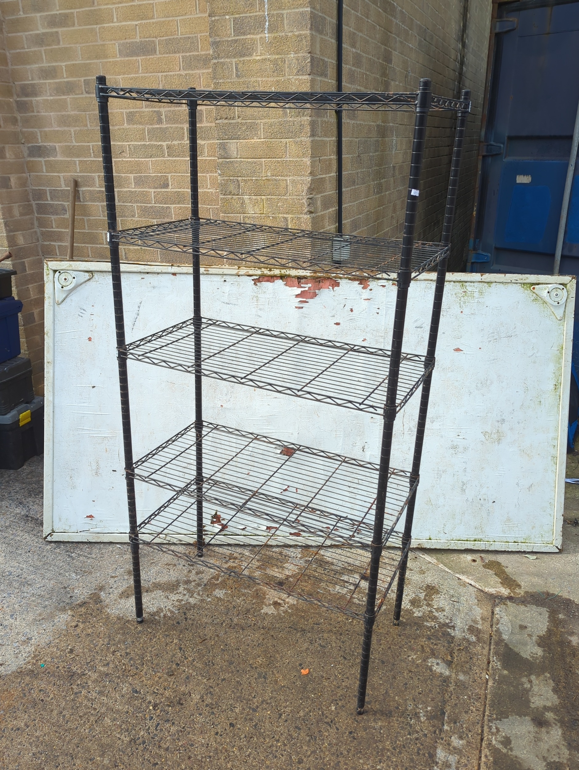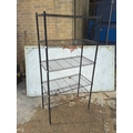 A sturdy metal wire shelving unit with multiple levels designed for storage. The frame is constructed from durable metal, providing ample space for organising items. It is suitable for both residential and commercial use, offering practical storage solutions.