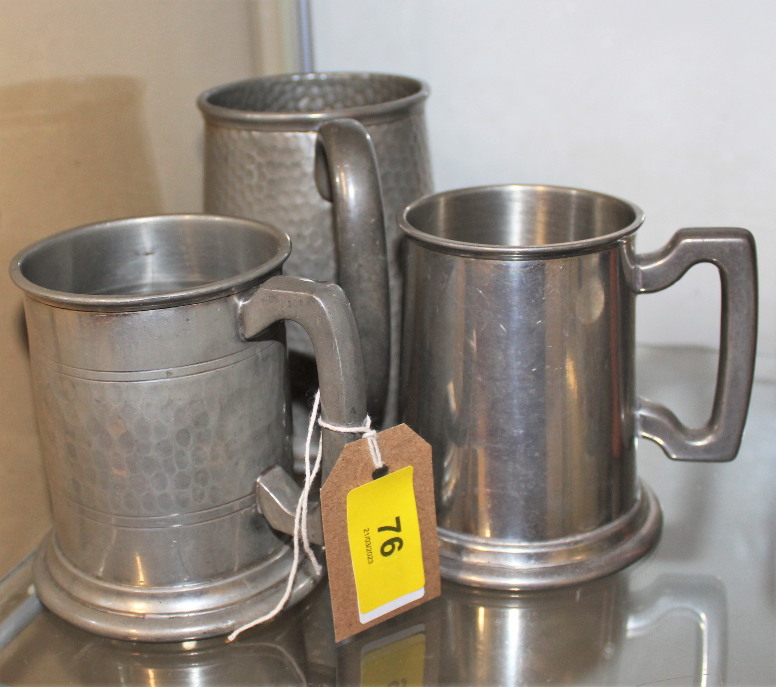 Three English Pewter Tankards (One with Glass Bottom)